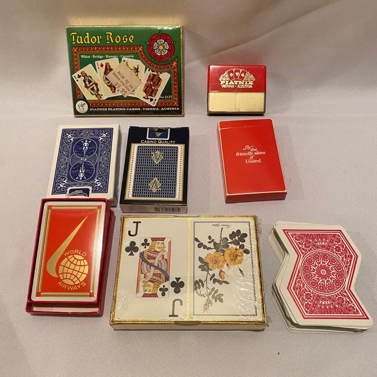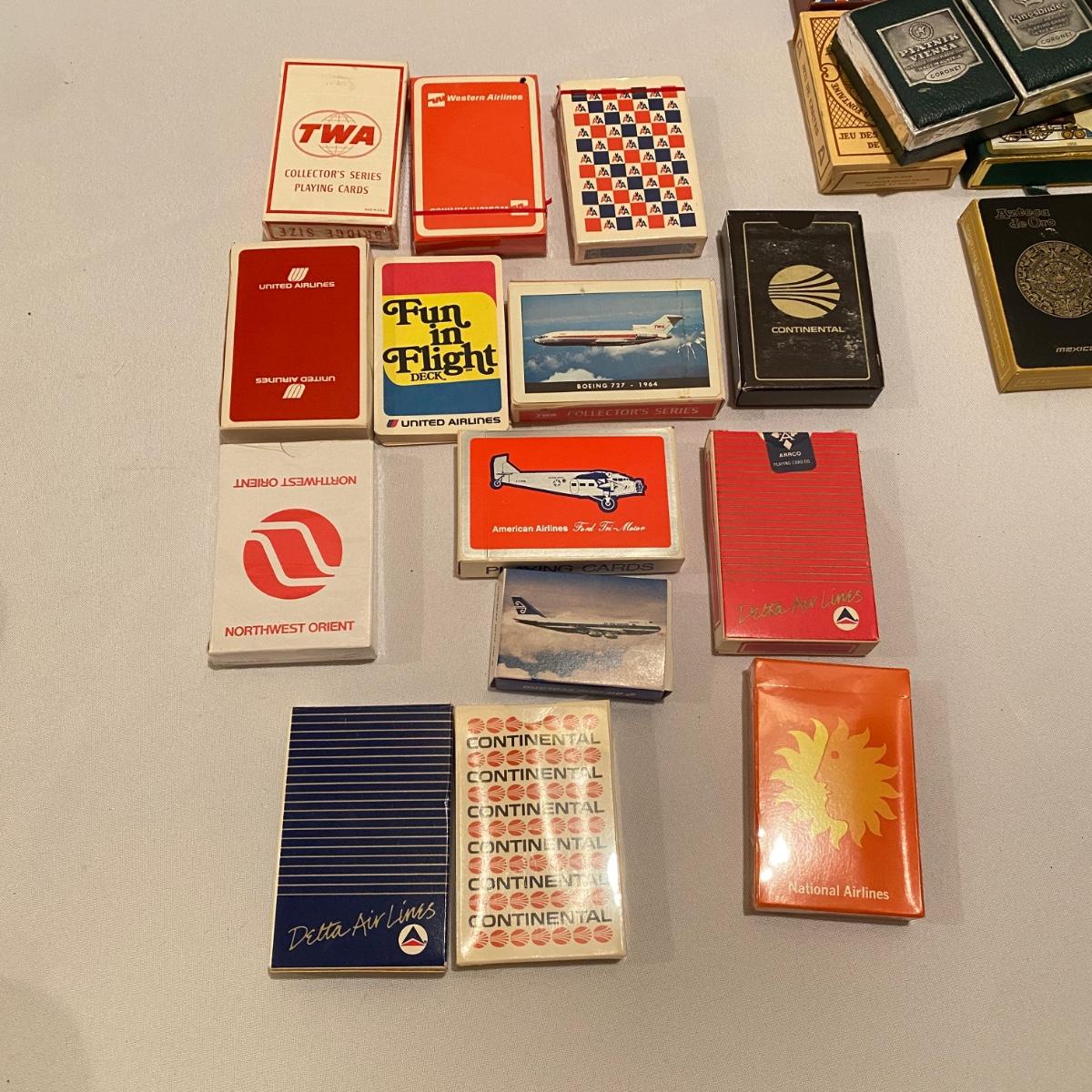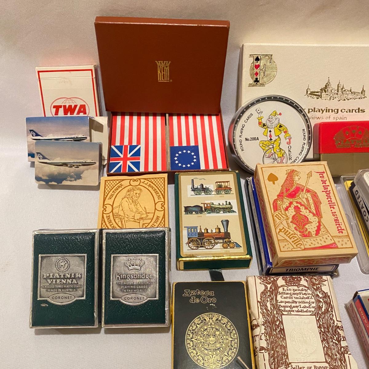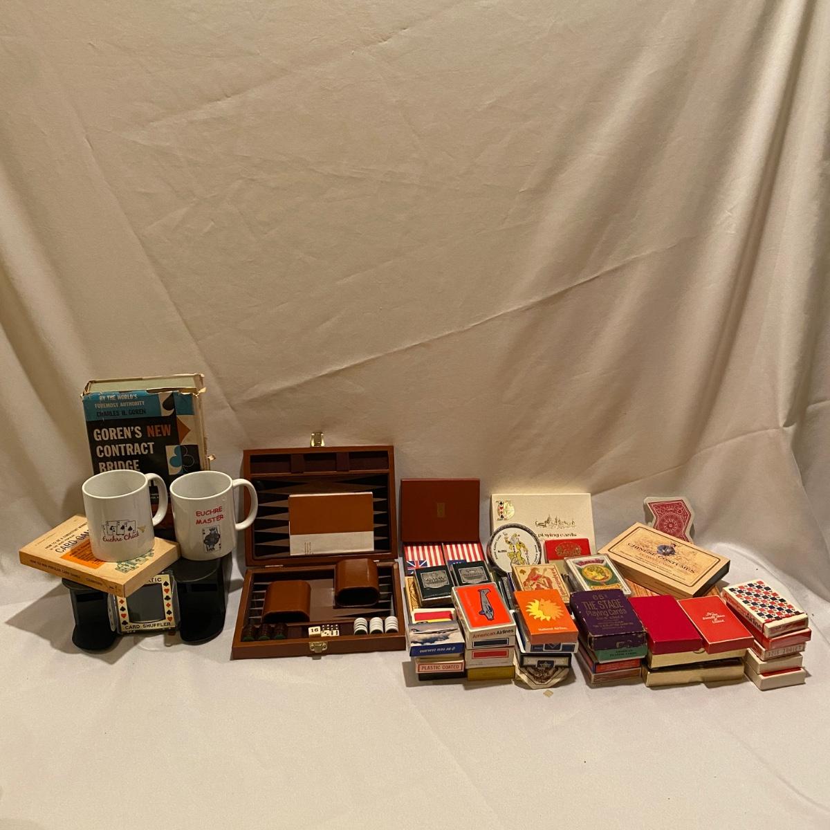Almost 50 sets of playing cards. About half of which are unopened. Many old airline cards. Some from travels. Can not guarantee that the open ones are complete decks. Lot also includes a travel backgammon set, electric card shuffler (not tested), two mugs and two books. Shipping available.