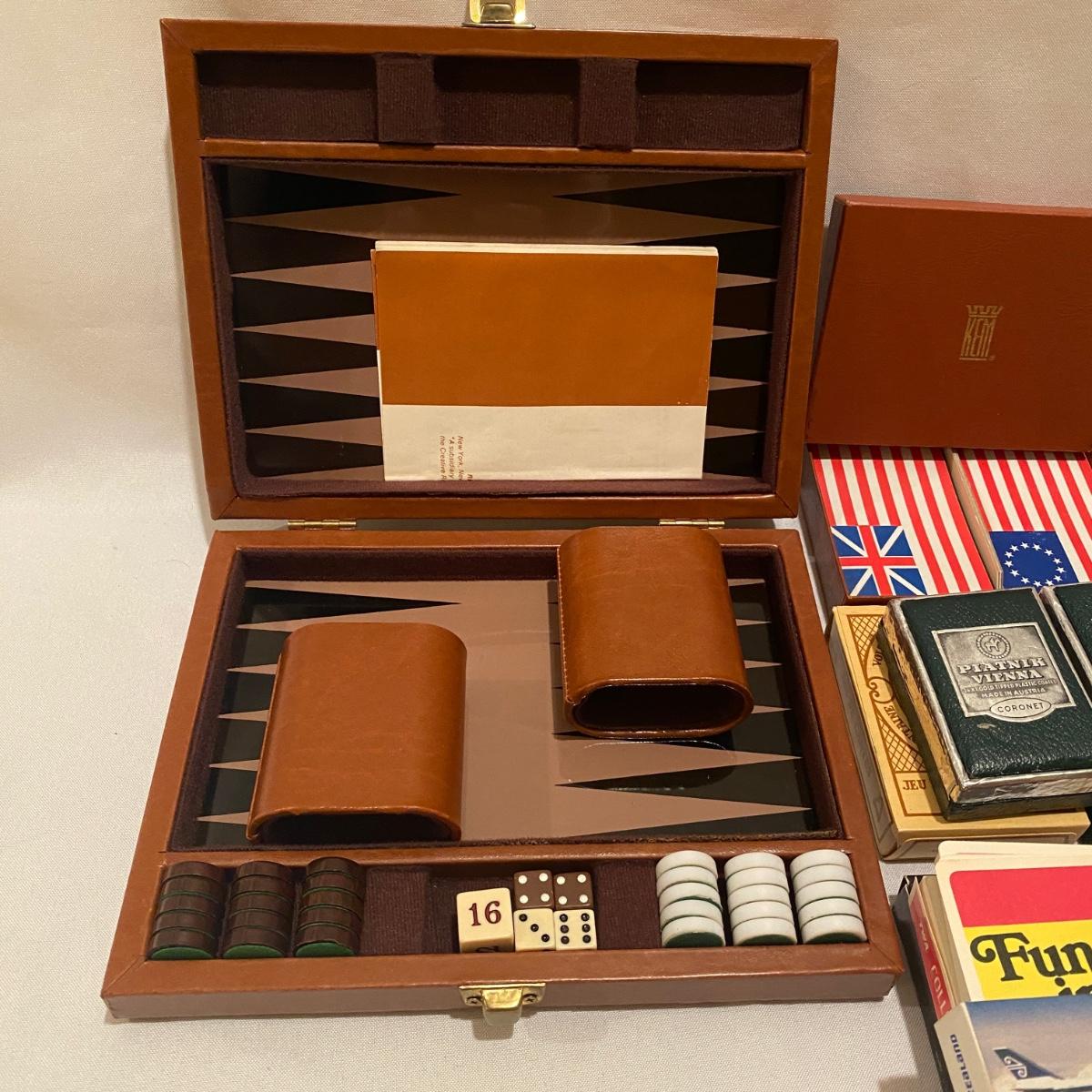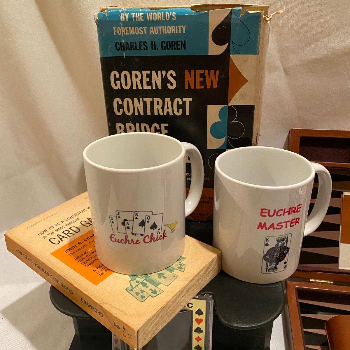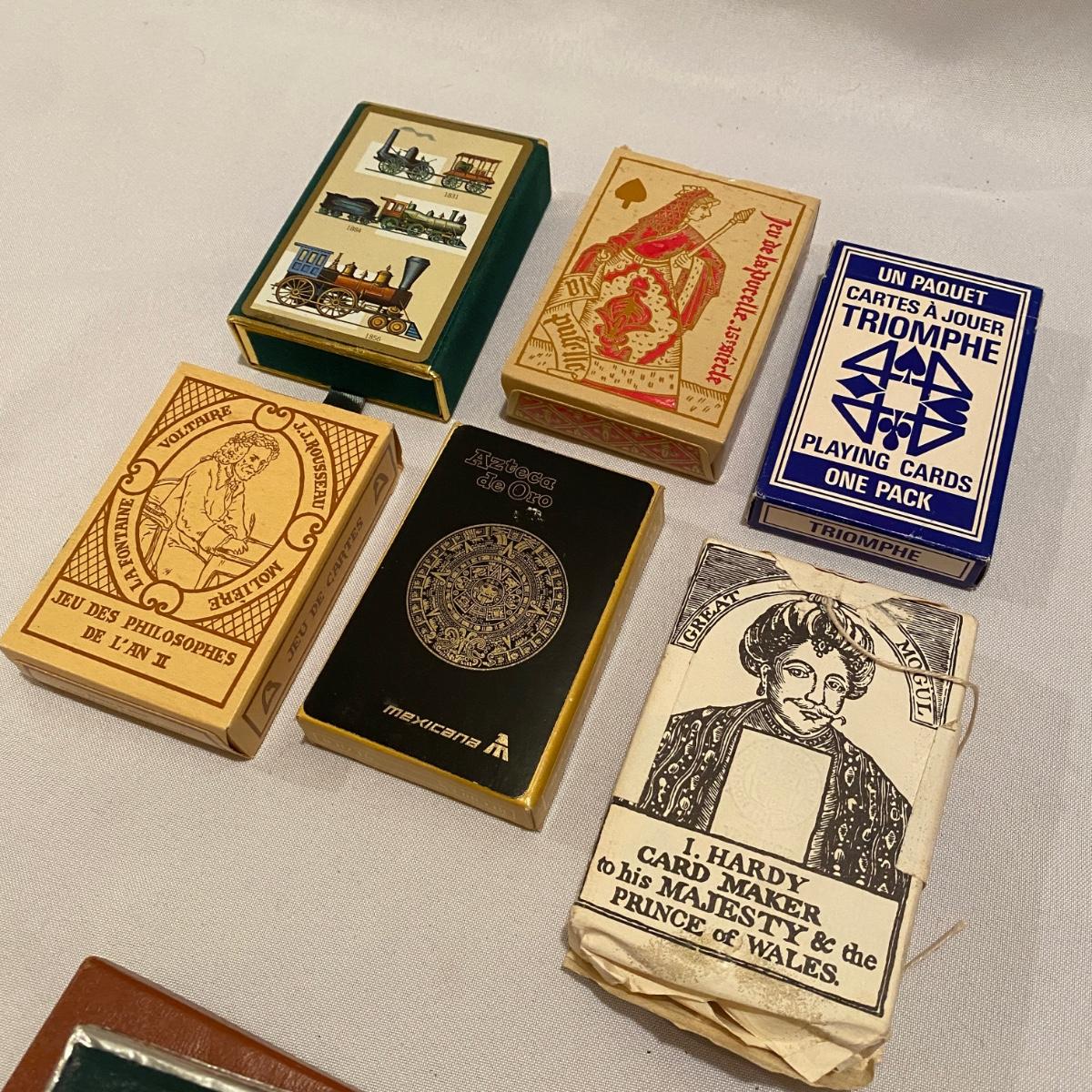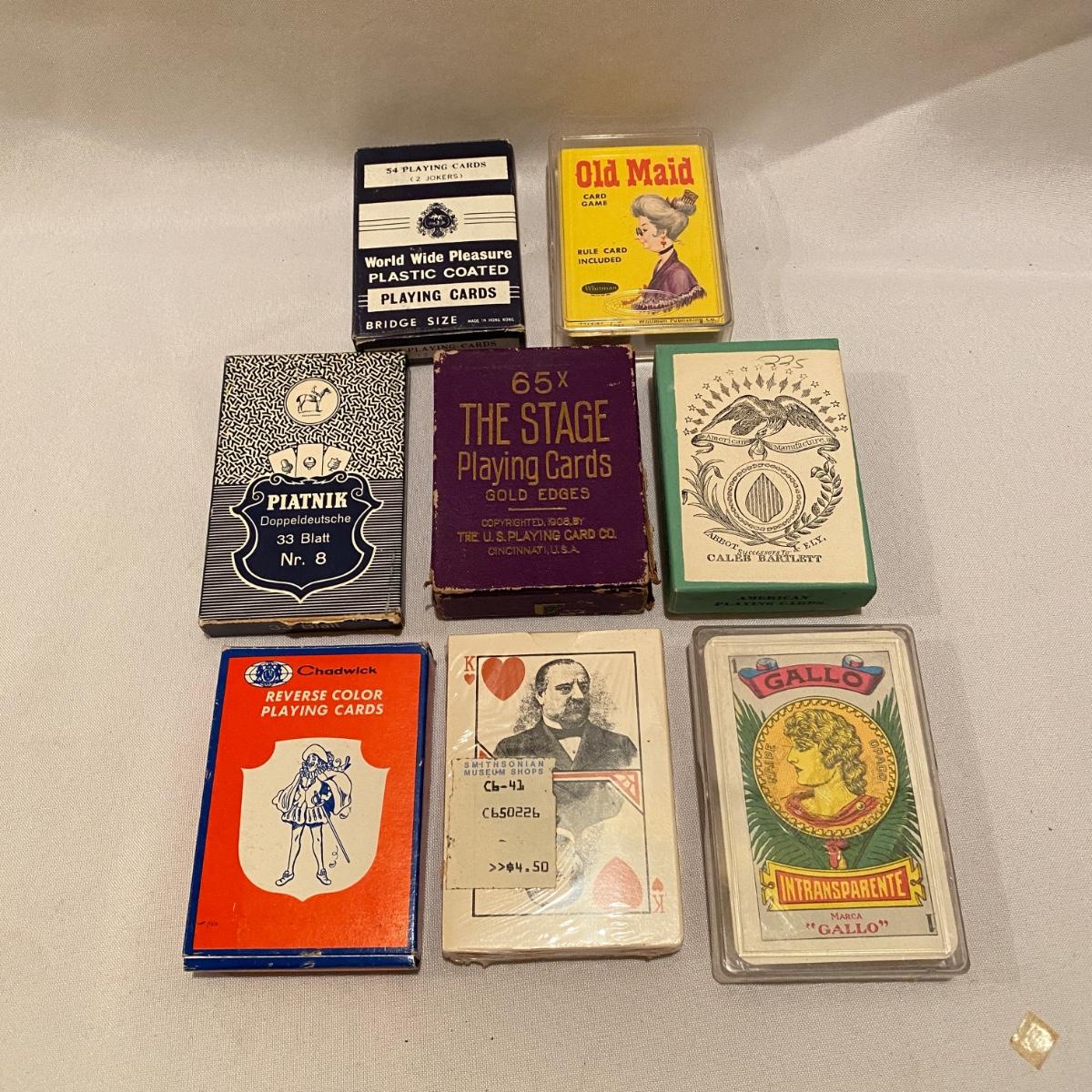 Almost 50 sets of playing cards. About half of which are unopened. Many old airline cards. Some from travels. Can not guarantee that the open ones are complete decks. Lot also includes a travel backgammon set, electric card shuffler (not tested), two mugs and two books. Shipping available.