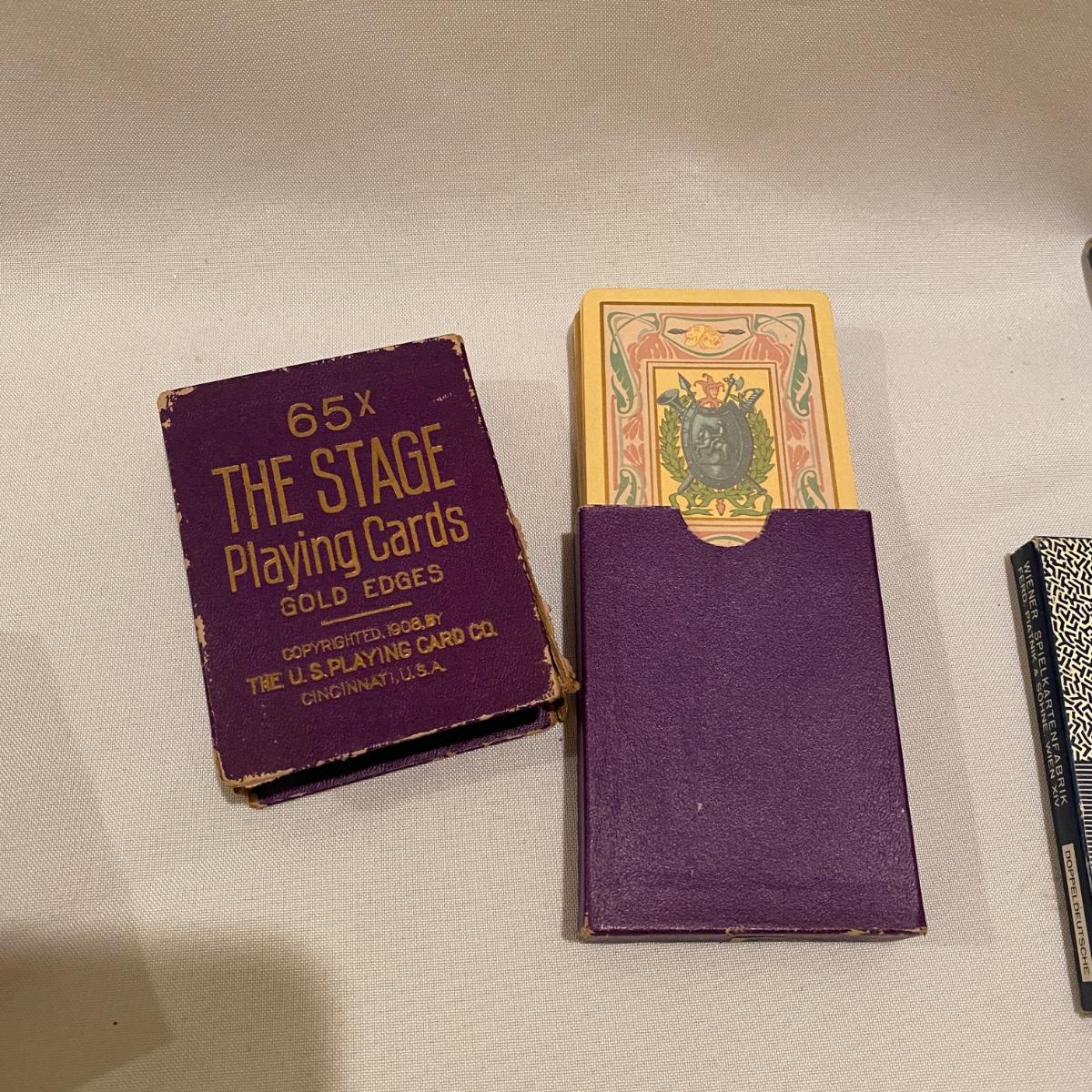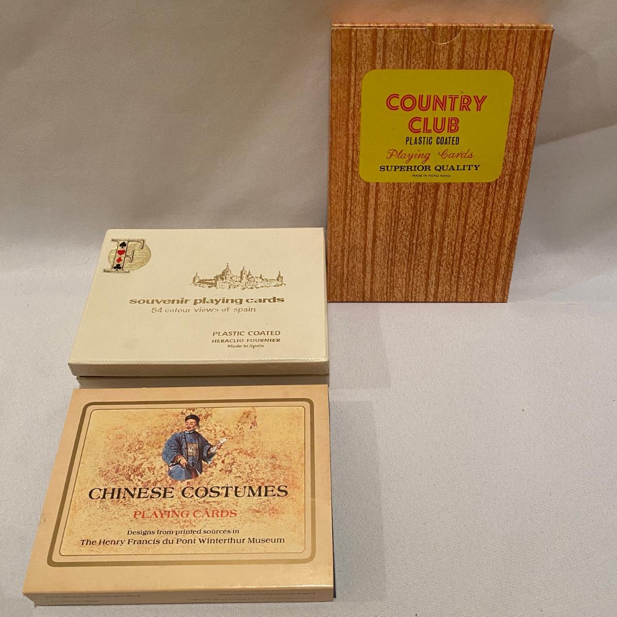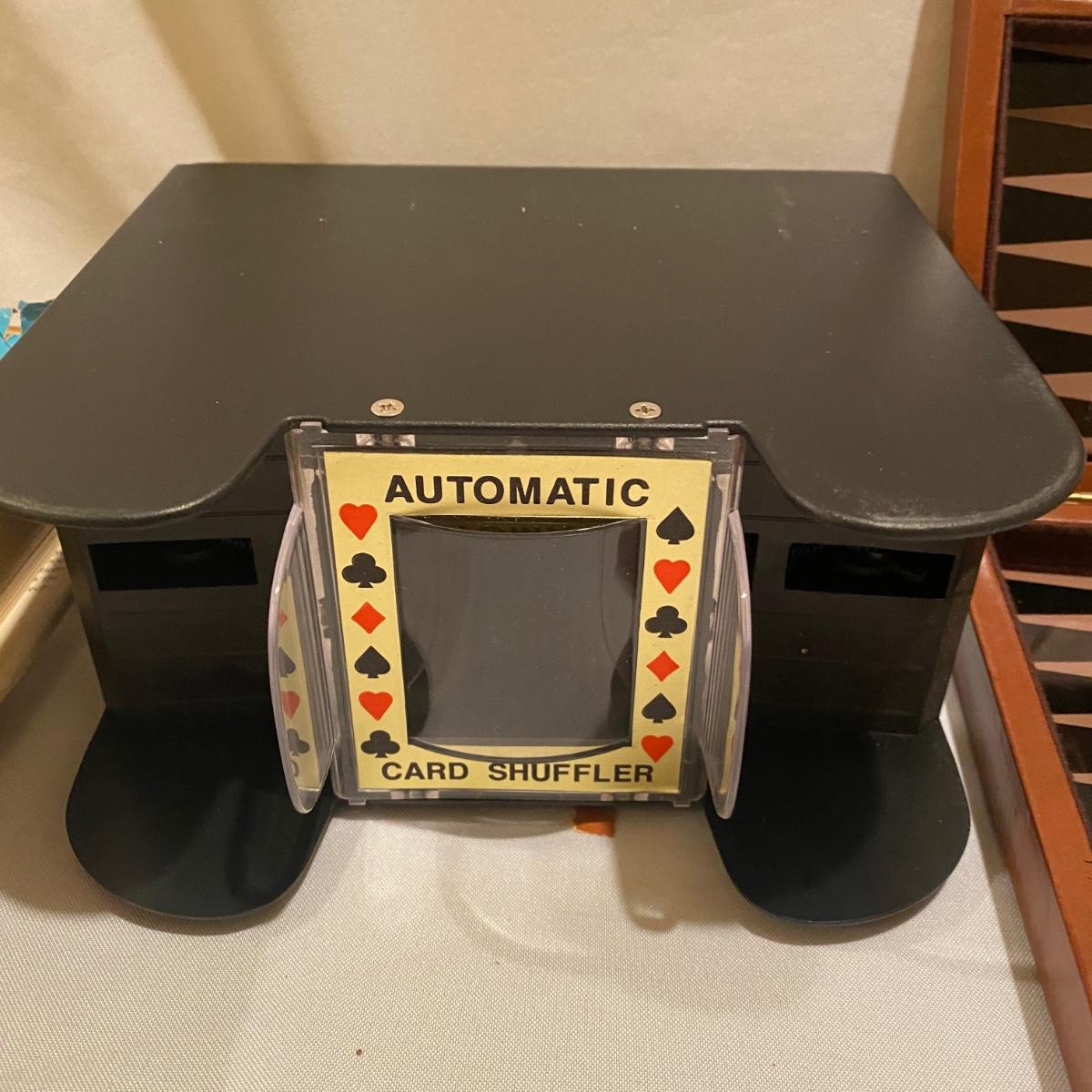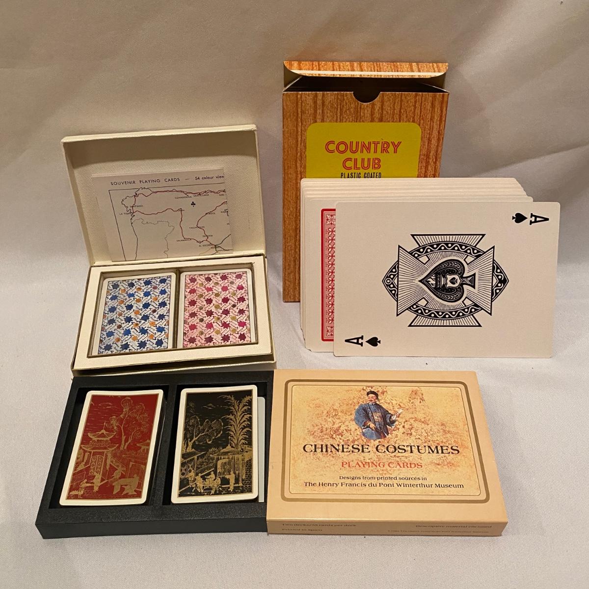 Almost 50 sets of playing cards. About half of which are unopened. Many old airline cards. Some from travels. Can not guarantee that the open ones are complete decks. Lot also includes a travel backgammon set, electric card shuffler (not tested), two mugs and two books. Shipping available.