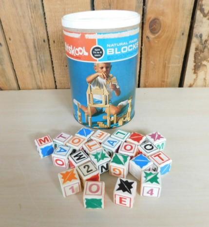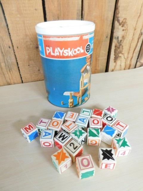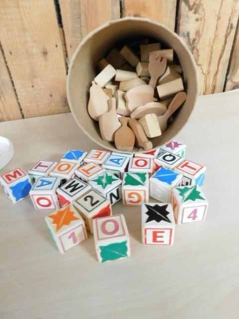 Vintage Playschool Wood Blocks in Original Container and Plastic Learning Blocks