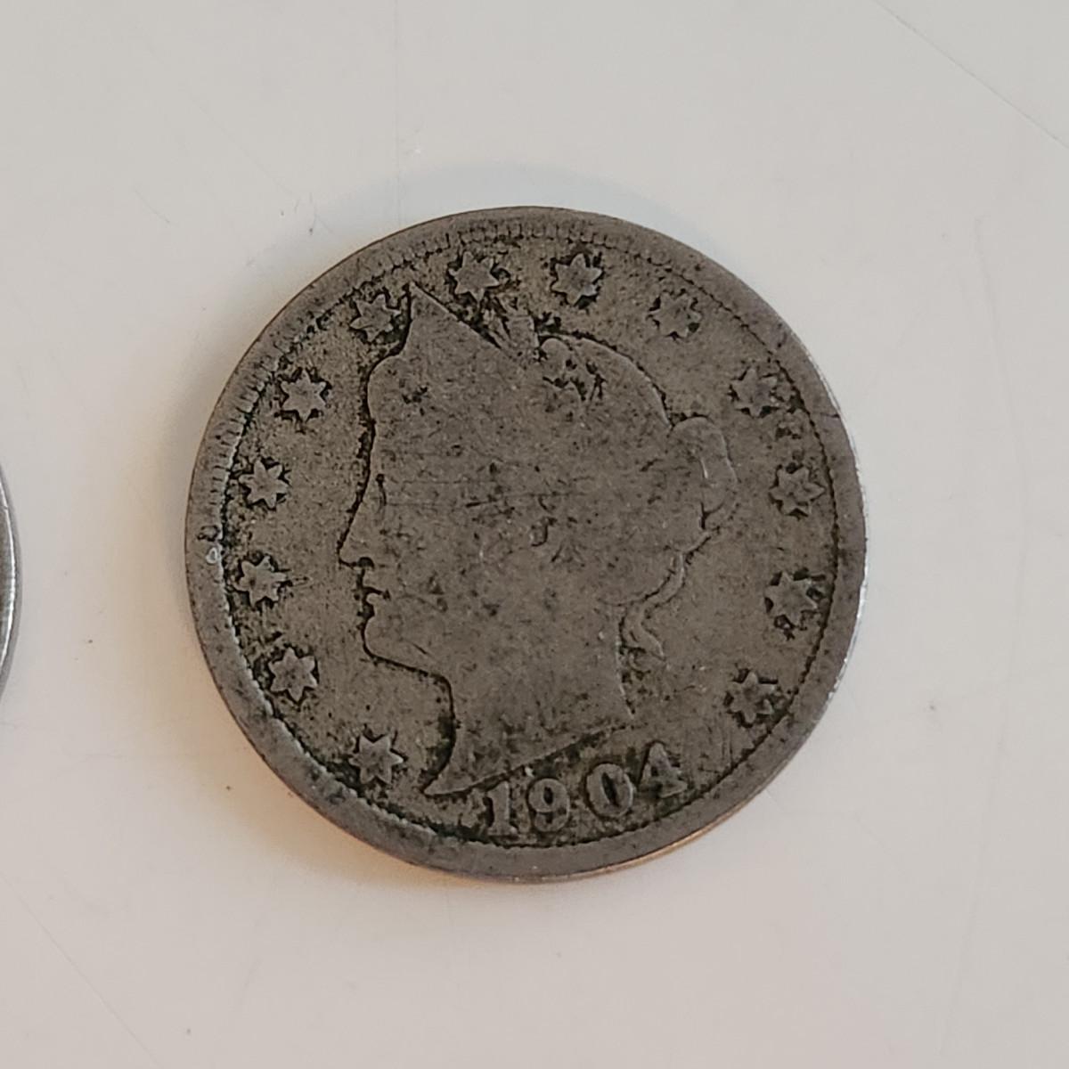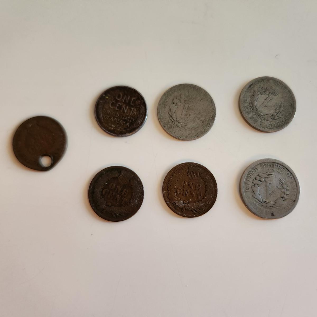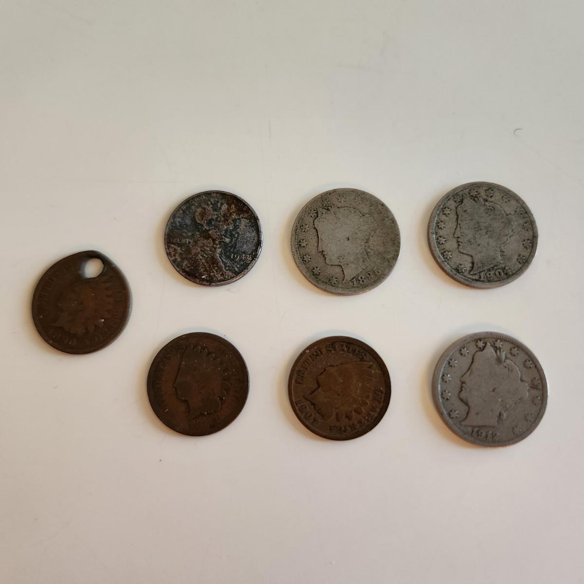 This auction lot is for a gathering of Vintage Pocket Change. Included are three V-nickels - dated 1895, 1904 and 1912, two Indian Head pennies - dated 1891 and 1907, a 1943 steel penny and an Indian Head Penny pierced for necklace or chain use. This item is KY sales tax-exempt.