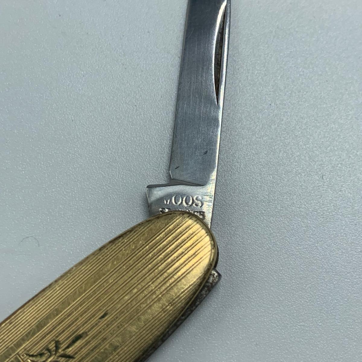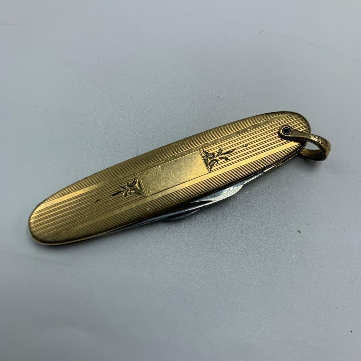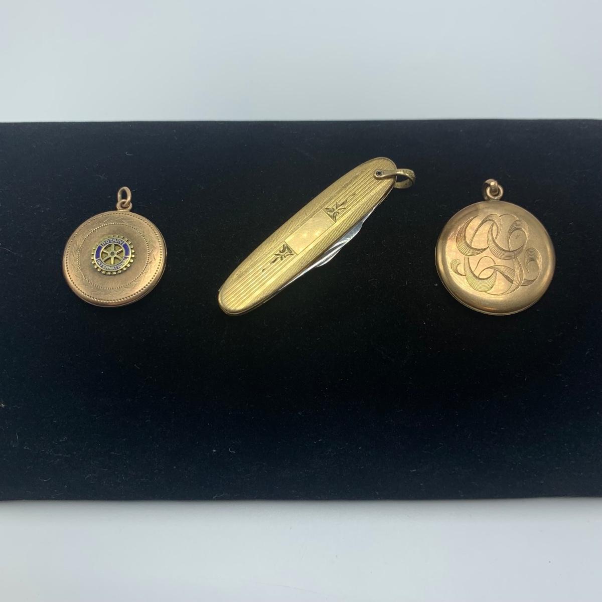 Two vintage gold colored engraved lockets and a pocket knife. One pocket has what looks like a dried leaf, perhaps a four leaf clover for good luck! Knife is just under 2.5” when folded. Please see photos for markings and details.