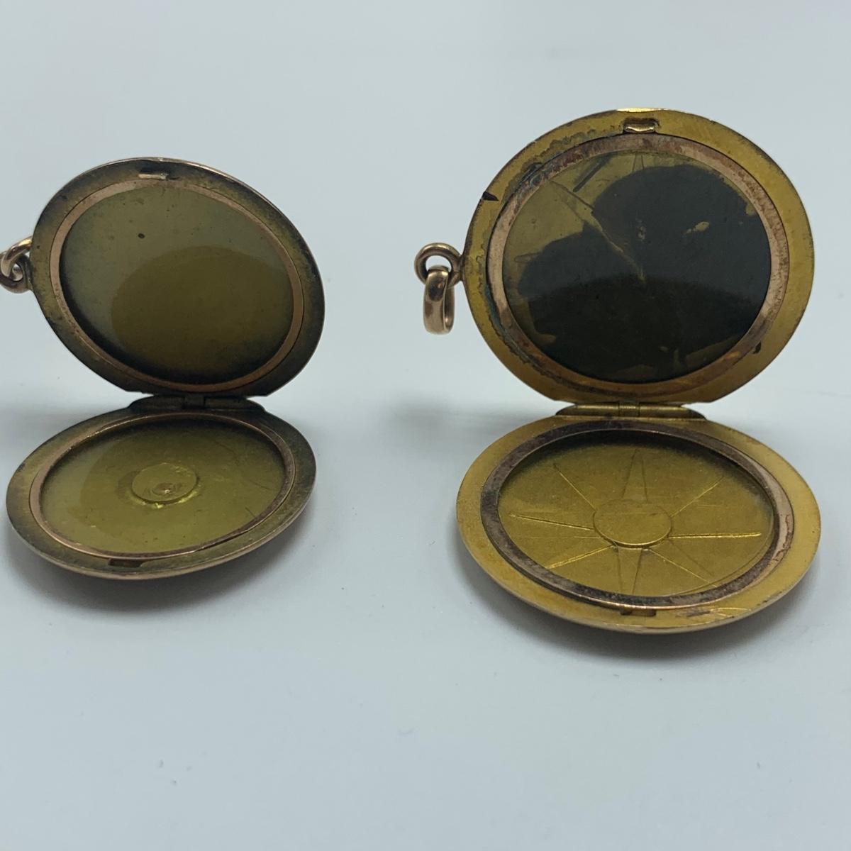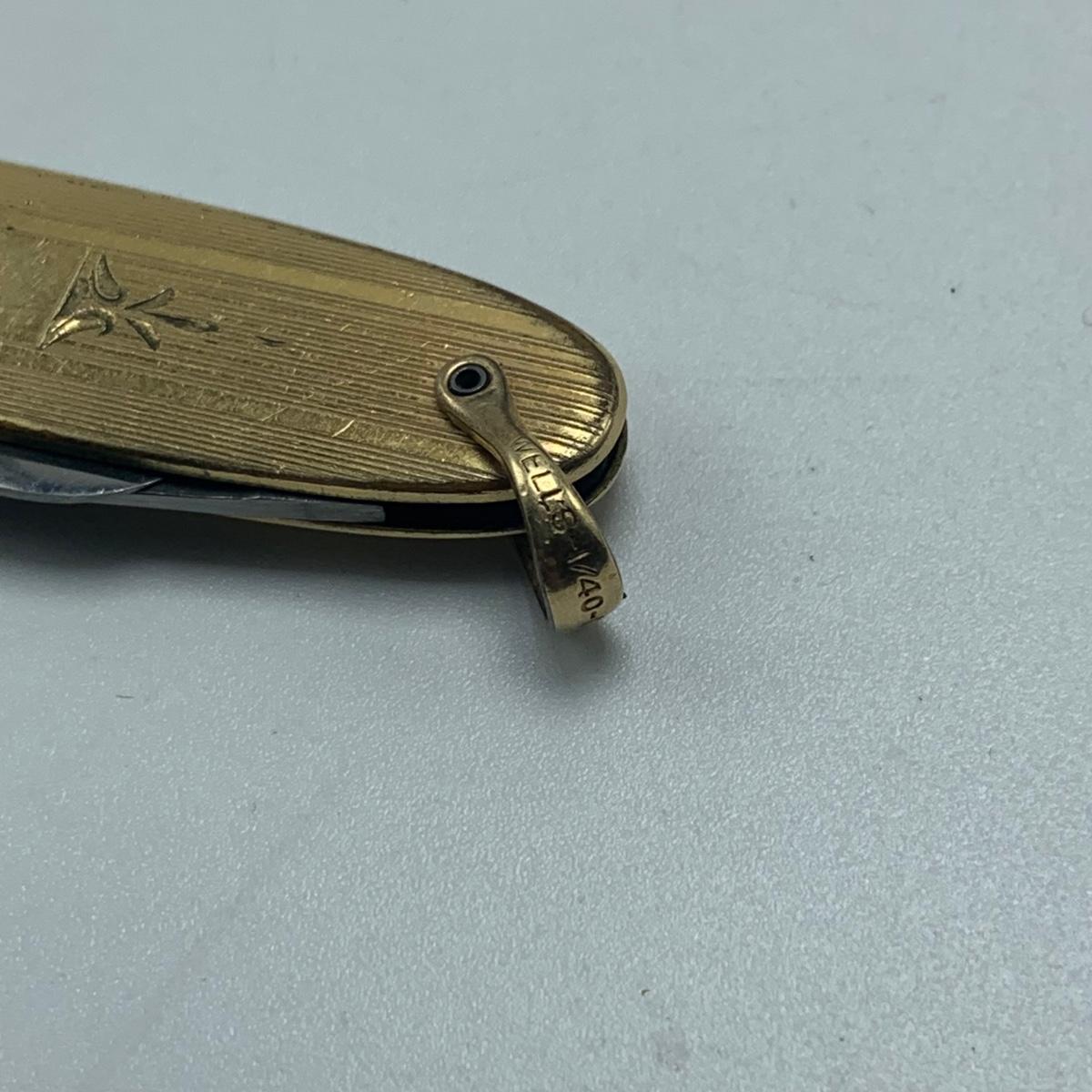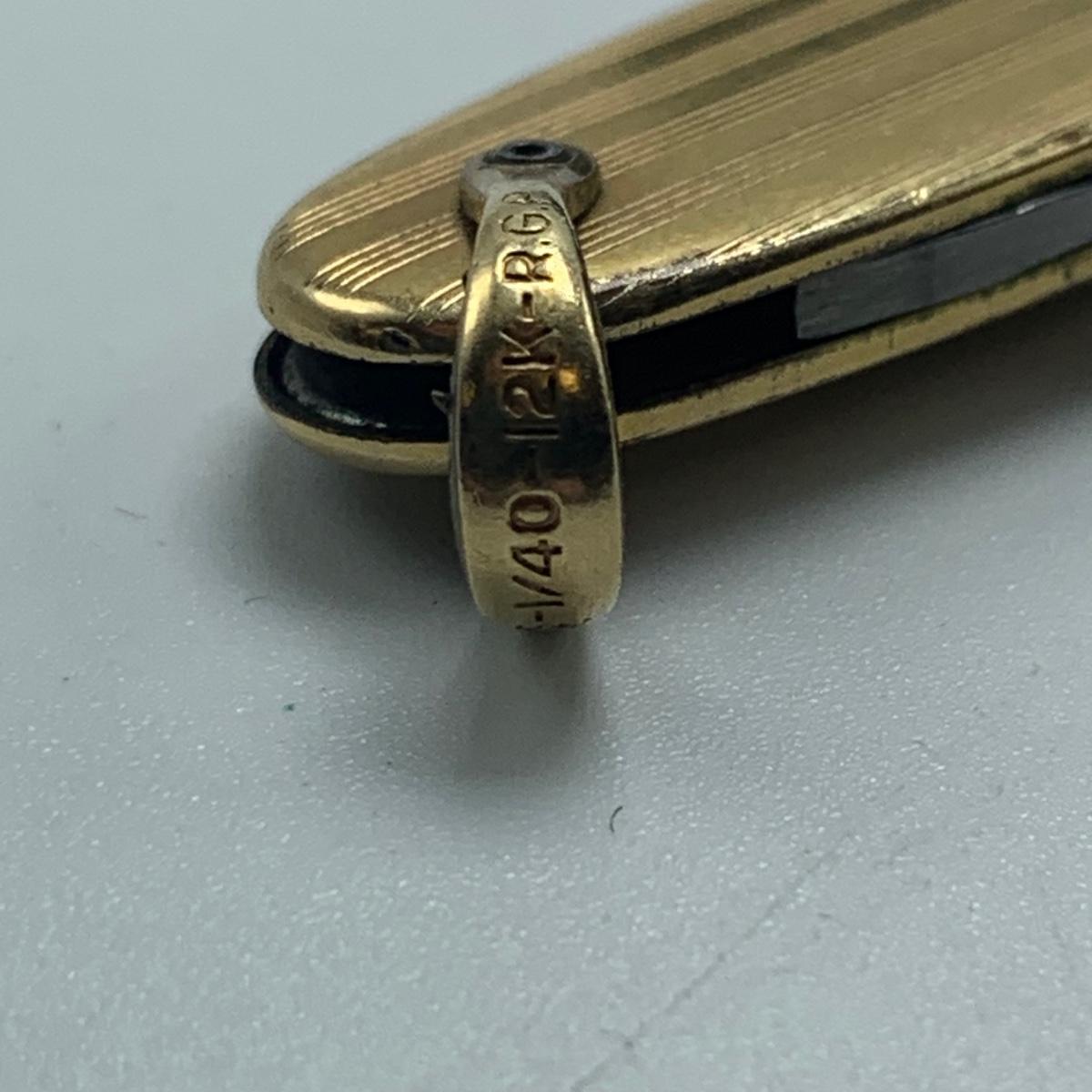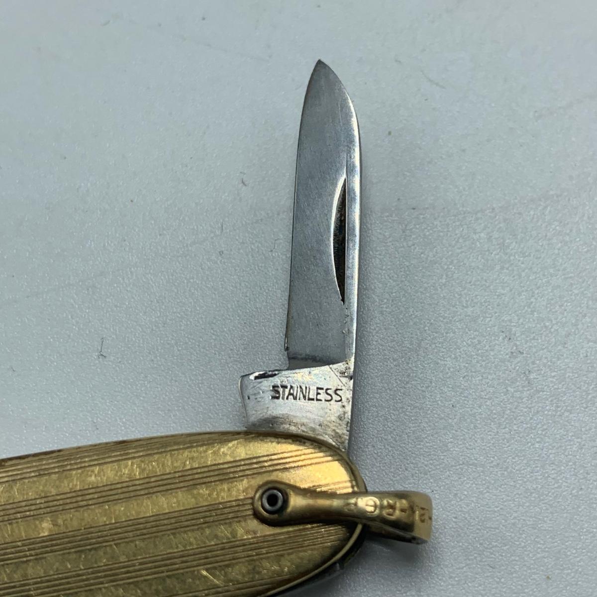Two vintage gold colored engraved lockets and a pocket knife. One pocket has what looks like a dried leaf, perhaps a four leaf clover for good luck! Knife is just under 2.5” when folded. Please see photos for markings and details.