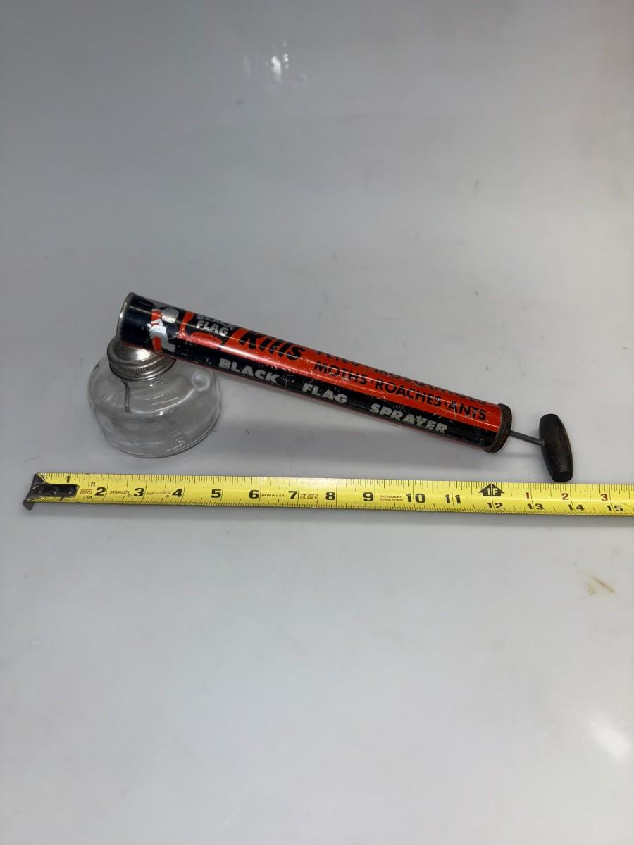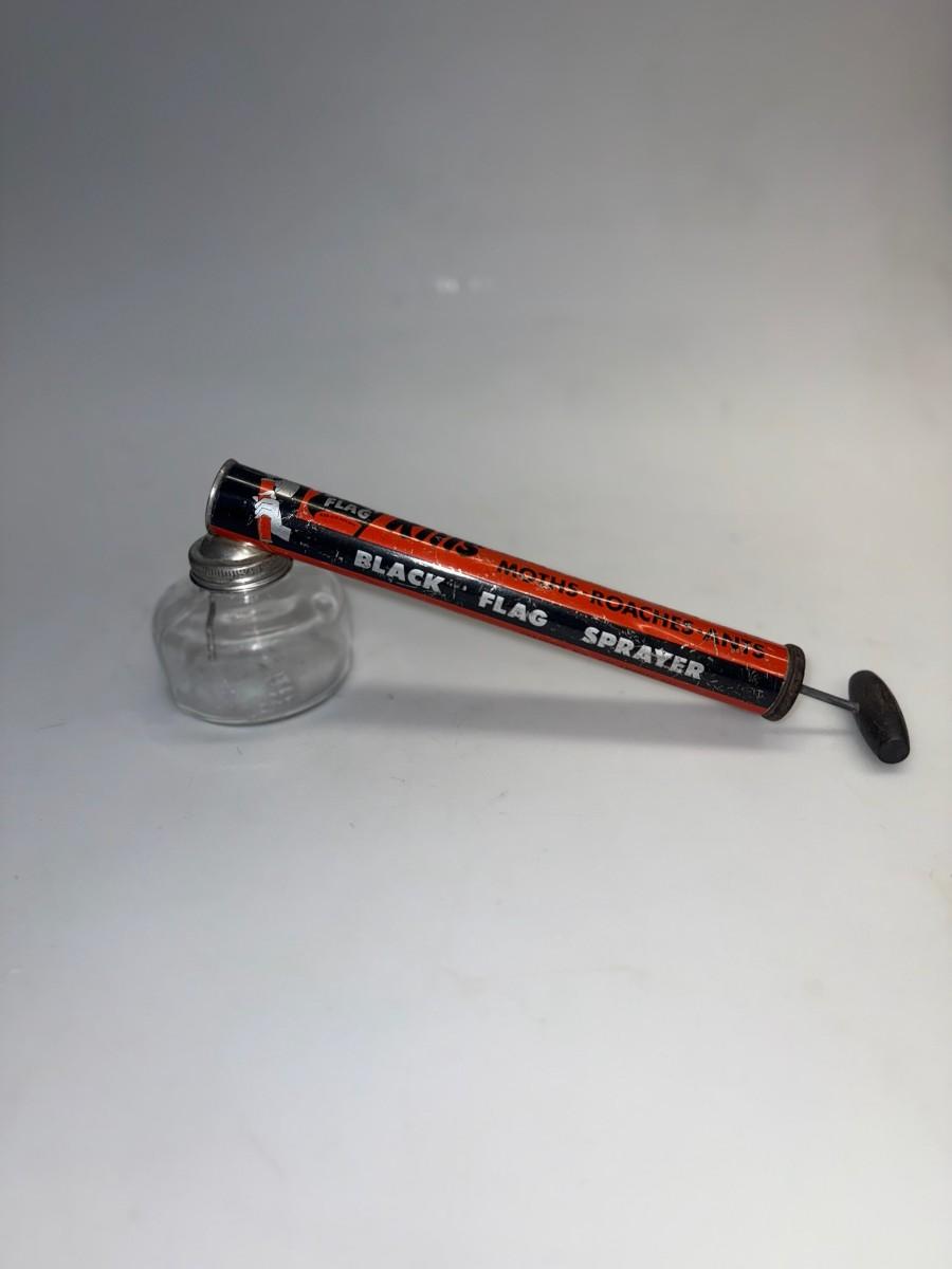 Vintage Poison Sprayer Tin Can Pump w/ Glass Jar BLACK FLAG Kills Mosquito Bugs