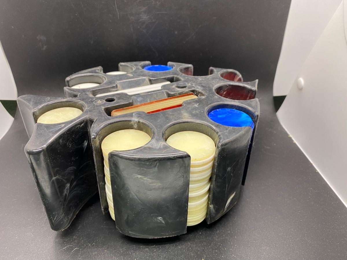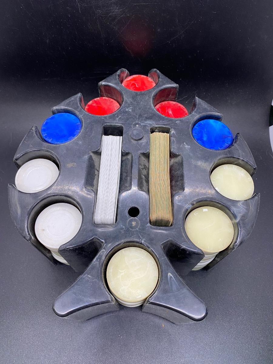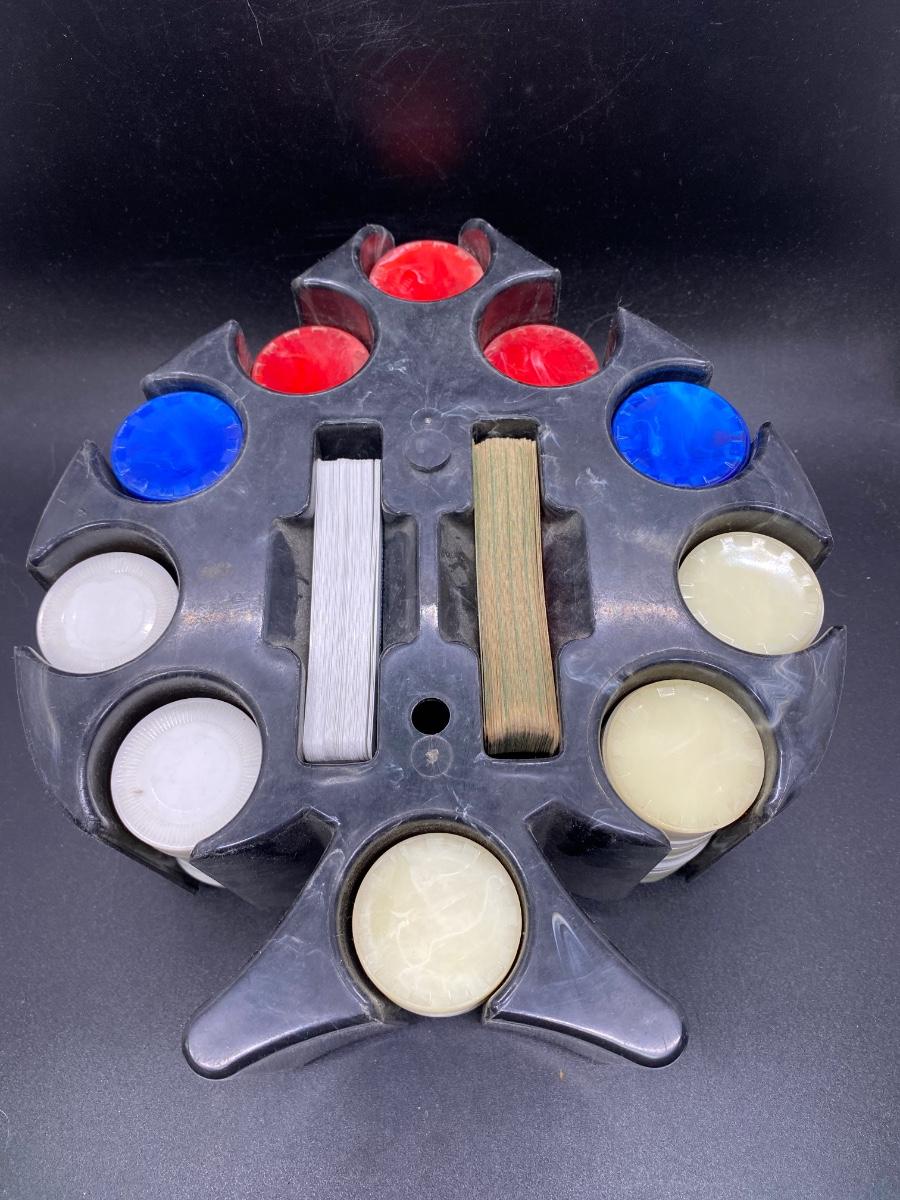 Vintage Poker Chip Mid Century Spade Shaped Caddy Carousel, there is no significant damage to the pieces or the carousel and is in good vintage condition. The set seems to the complete, check pictures for more details and for sizing.