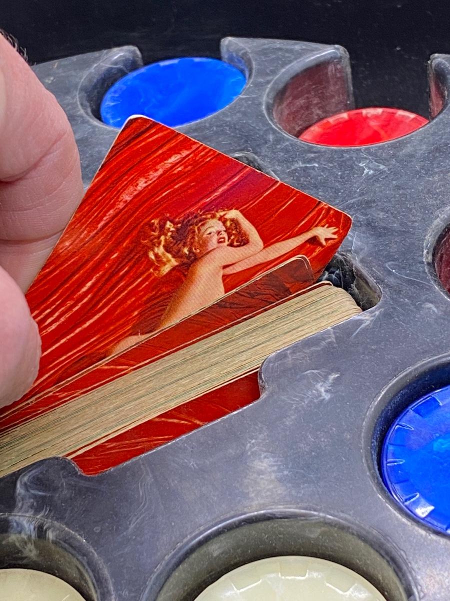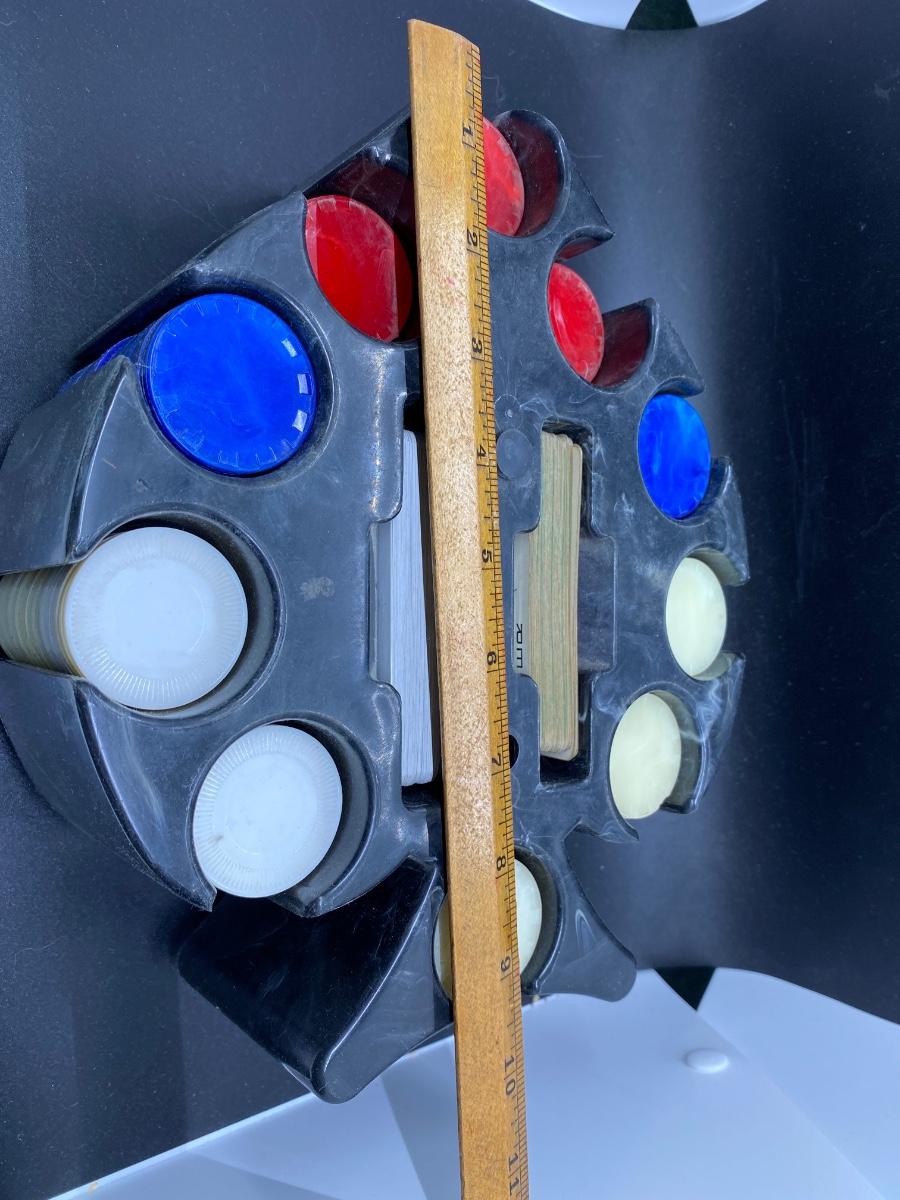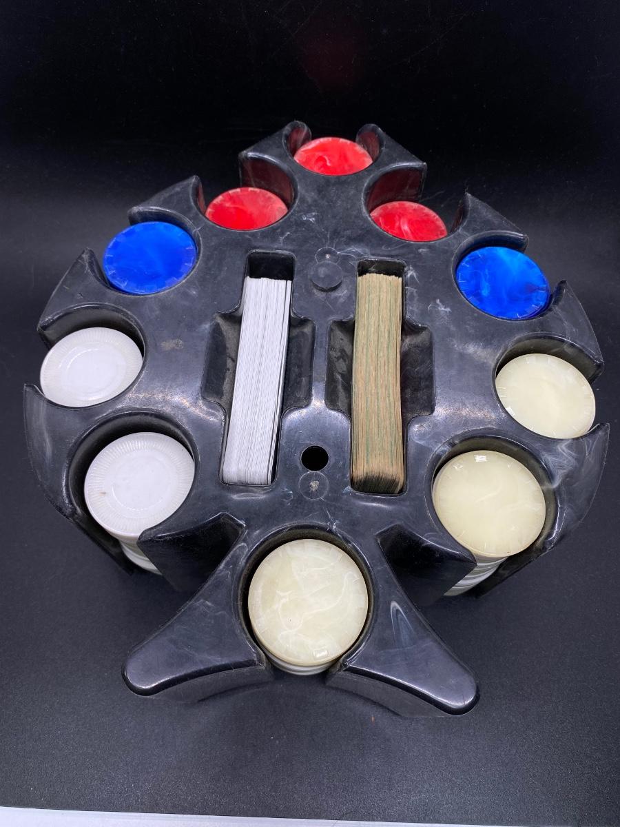 Vintage Poker Chip Mid Century Spade Shaped Caddy Carousel, there is no significant damage to the pieces or the carousel and is in good vintage condition. The set seems to the complete, check pictures for more details and for sizing.