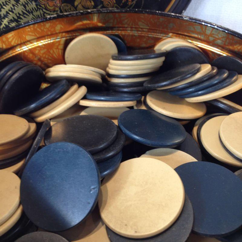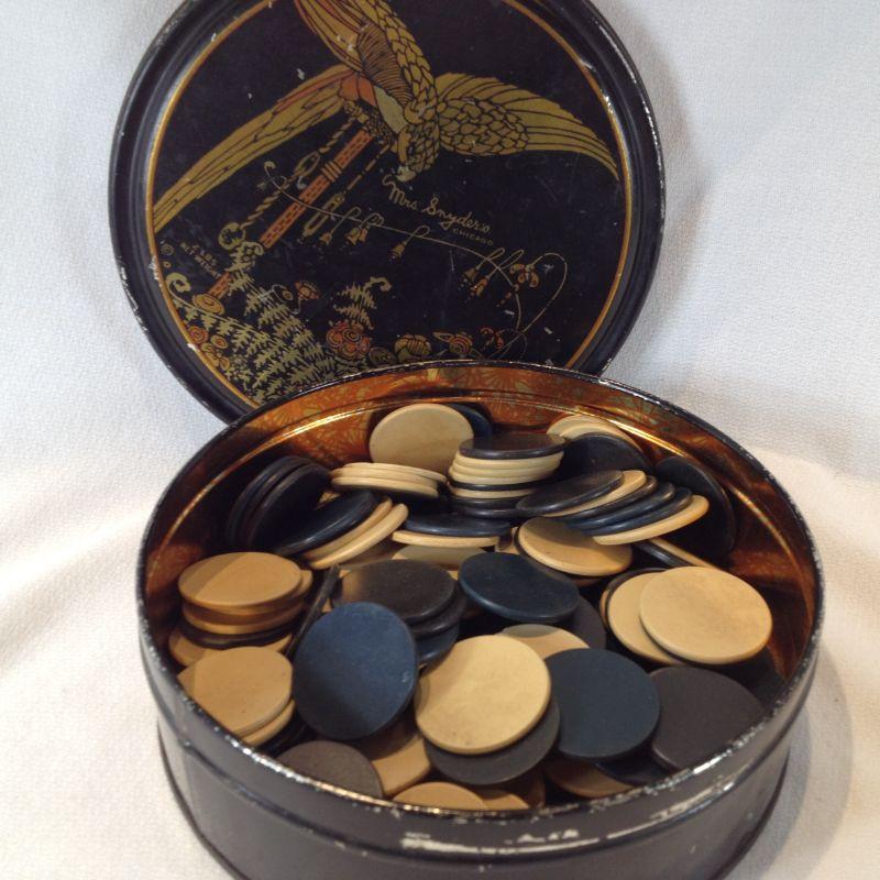 This offering is for a Vintage Tin full of Vintage black and ivory color Poker Chips. Nice little double find.