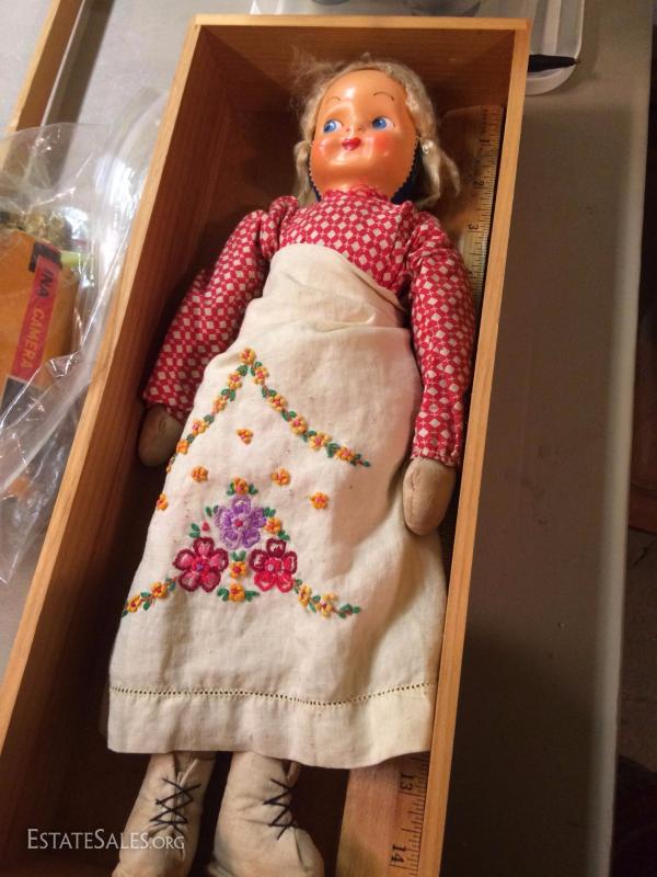 Vintage pre-owned 17" traditional authentic Polish doll with mask face and a braid across top of hair and pigtails. She is wearing a wreath type head adornment tied in the back instead of the usual babushka. Her legs are jointed with buttons attached to the torso. I believe she is of an early vintage being that the braid across the top of the hair is a 1935-45 hairdo. The sawdust is showing through a tear on the leg. Condition is consistent with age.