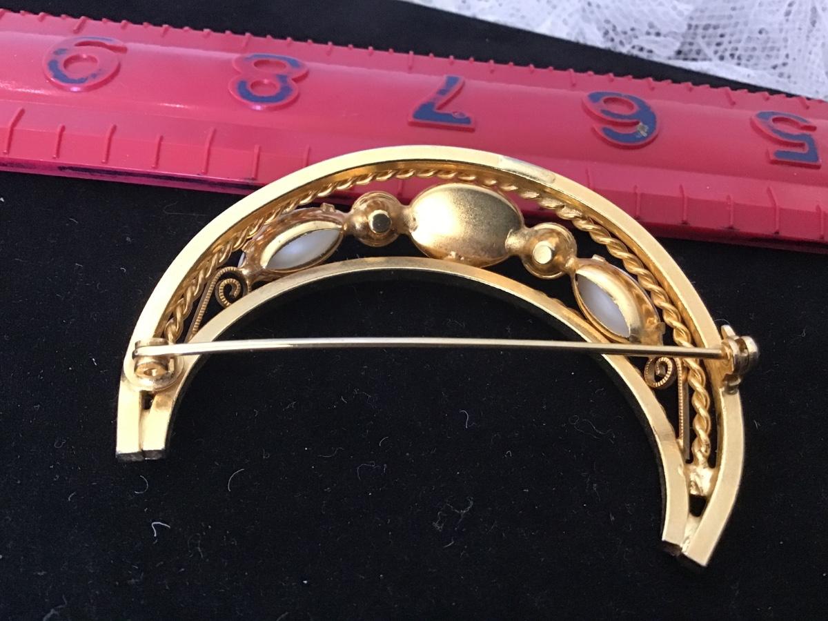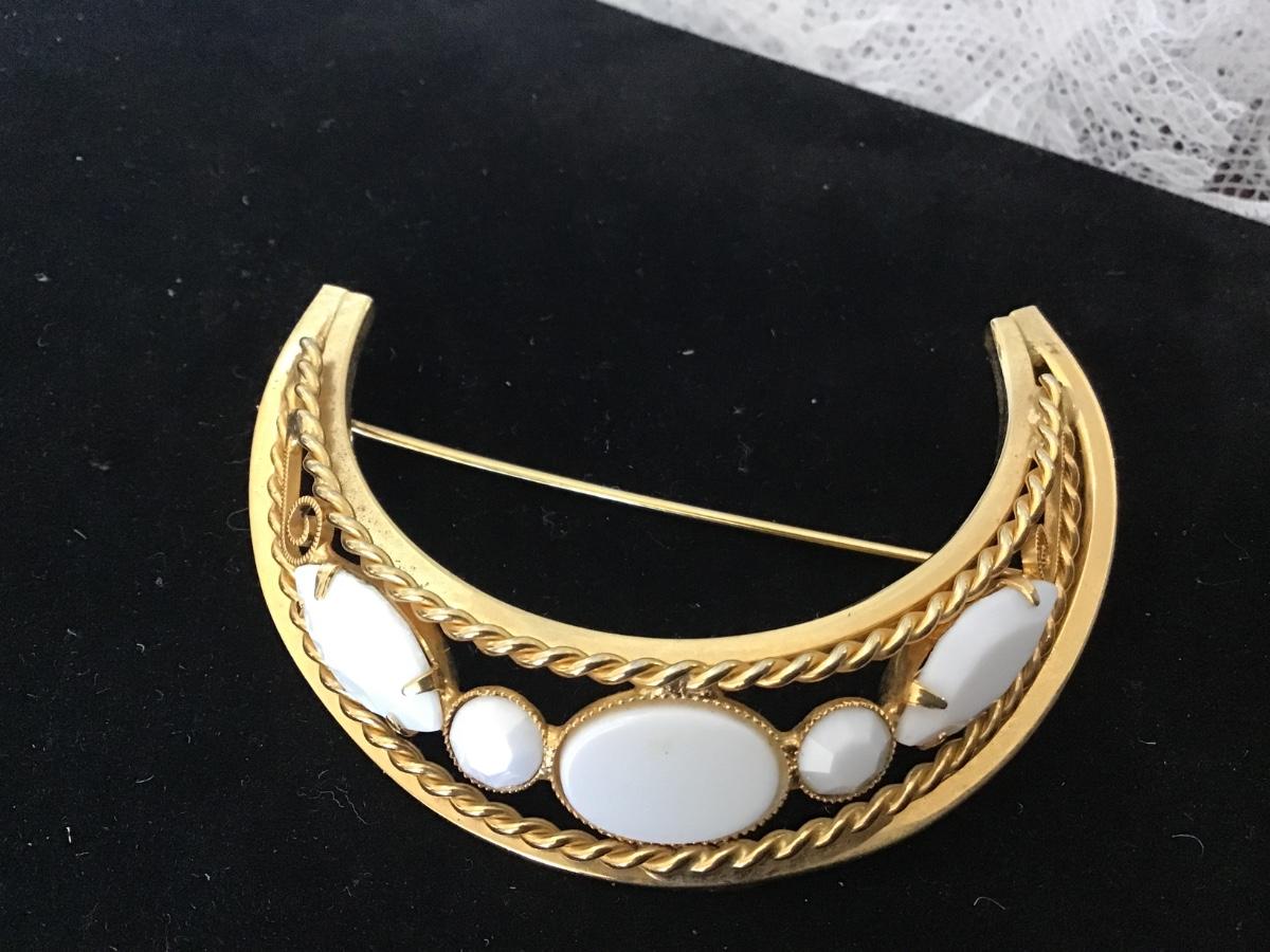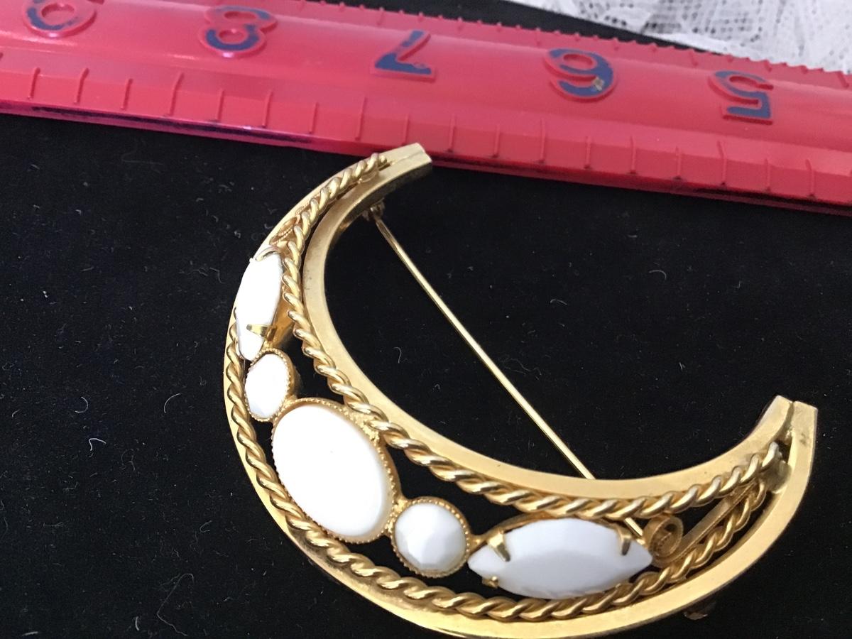 Vintage Polished Gold Tone Prong set Milk Glass Rhinestone Crescent Pin Brooch