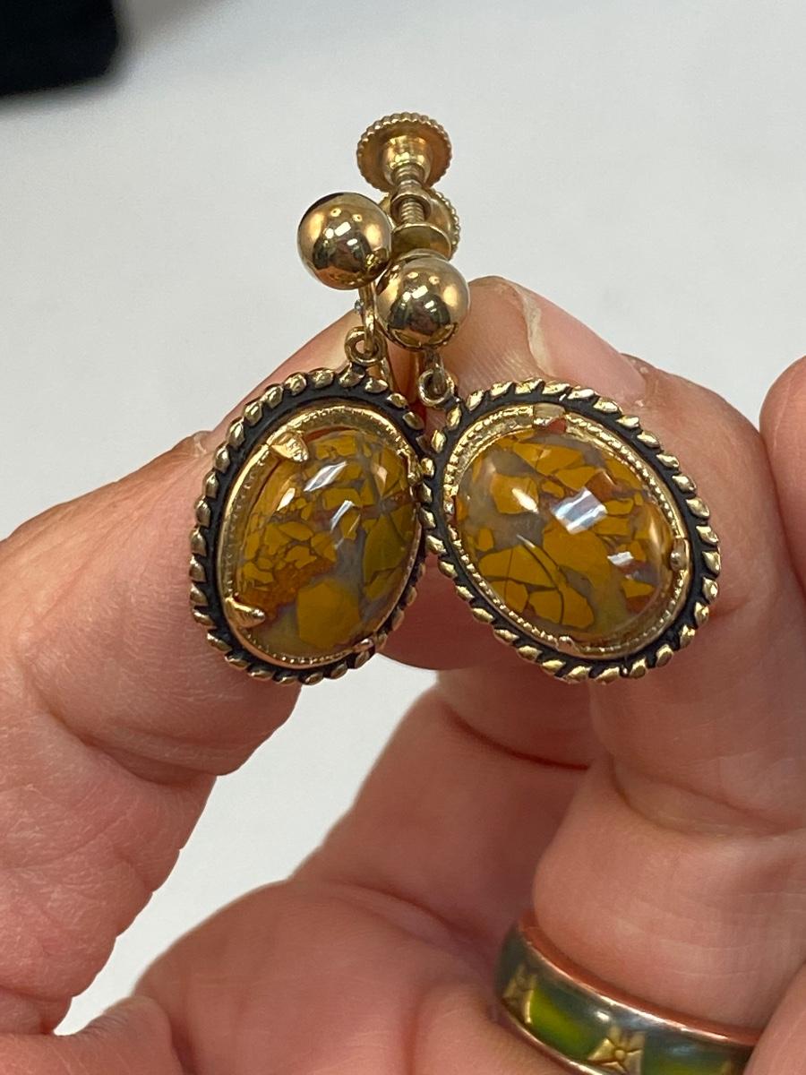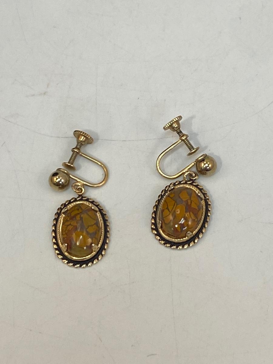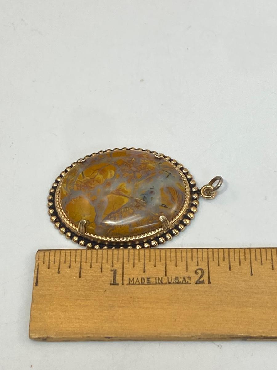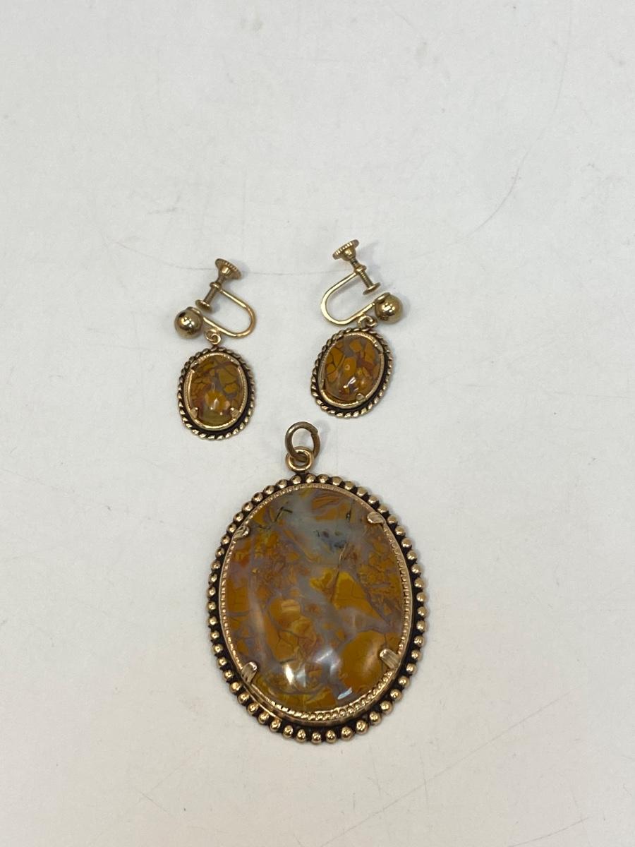Vintage Polished Stone Pendant with Matching Screw Back Earrings. Nice agate stone with hints of yellow and orange. Gold tone setting. Good condition.