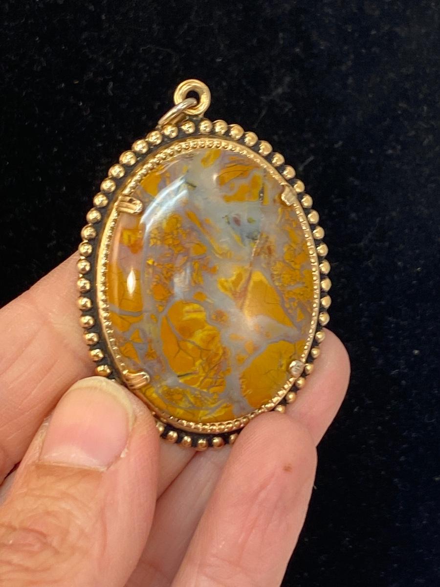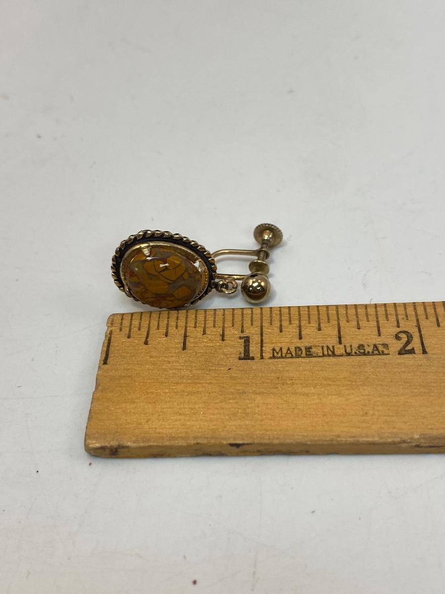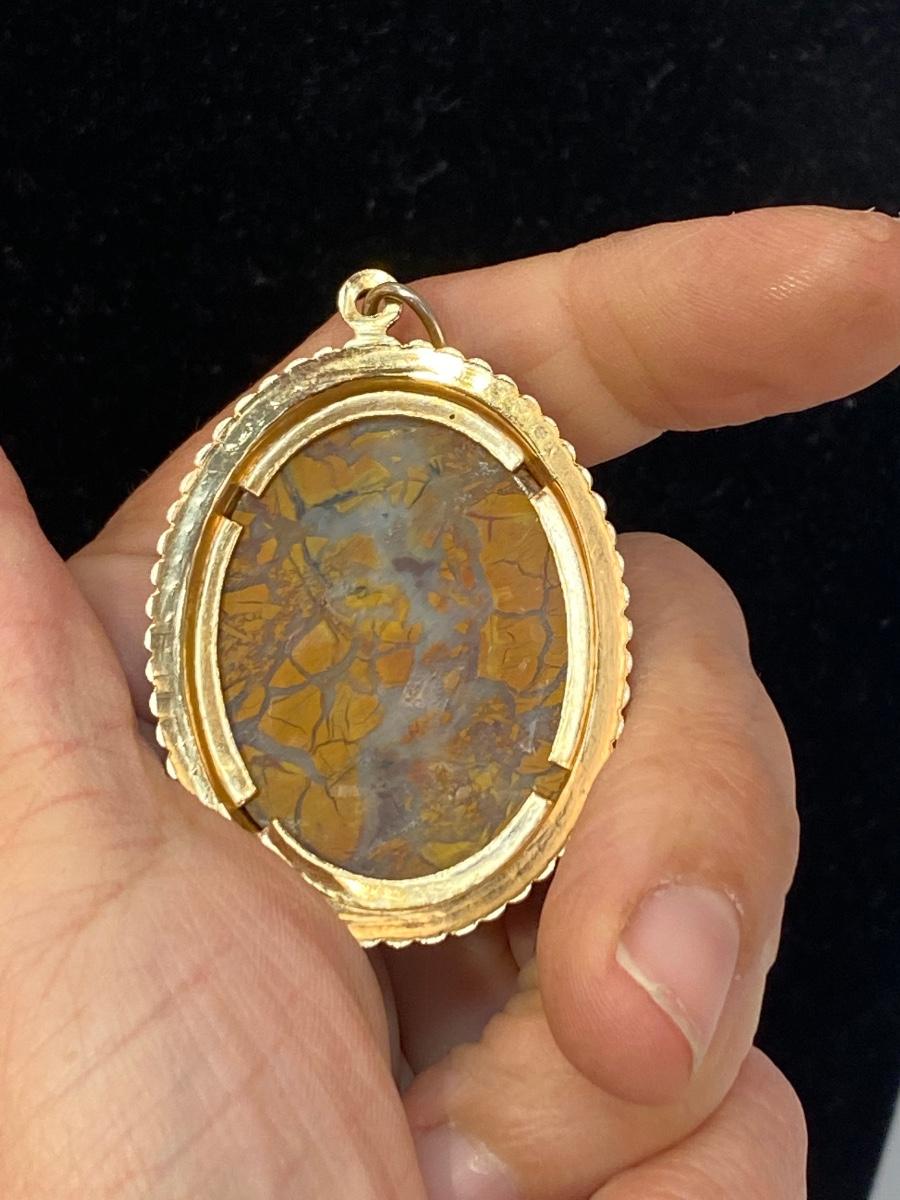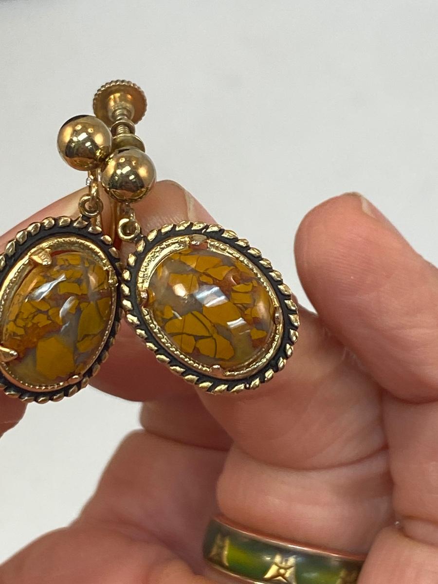 Vintage Polished Stone Pendant with Matching Screw Back Earrings. Nice agate stone with hints of yellow and orange. Gold tone setting. Good condition.
