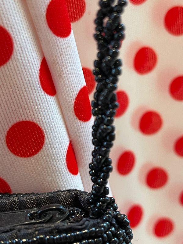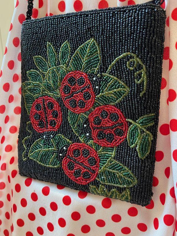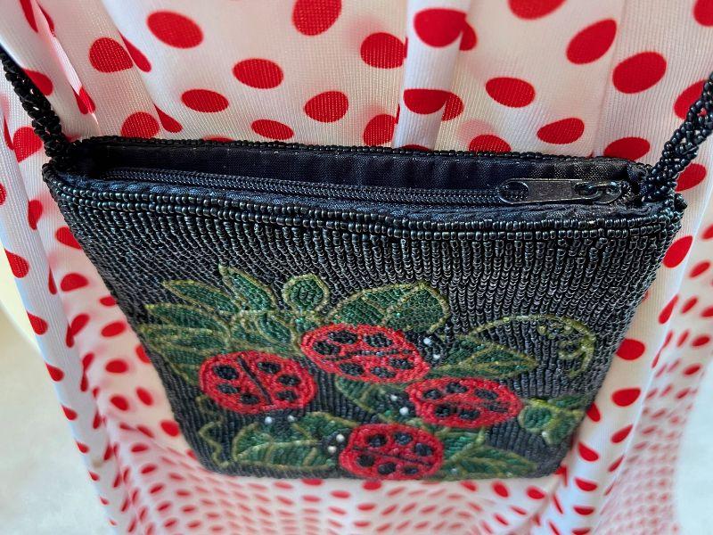 This great jumper is straight out of this vintage closet. Included is this darling beaded ladybug bag with a woven beaded strap and a single zipper closure.
