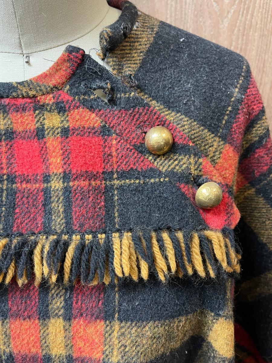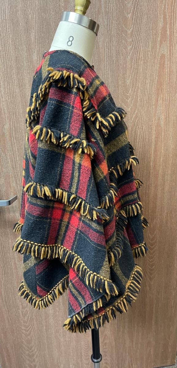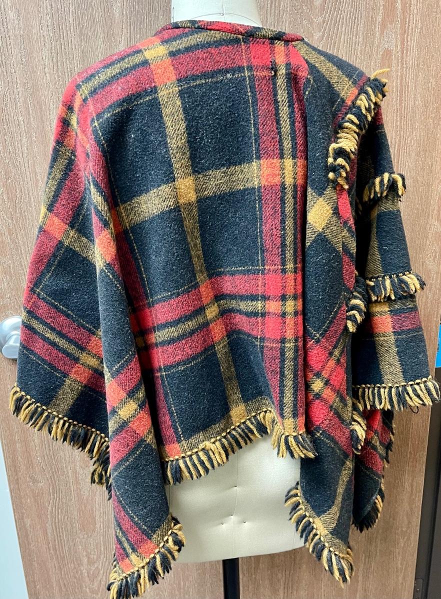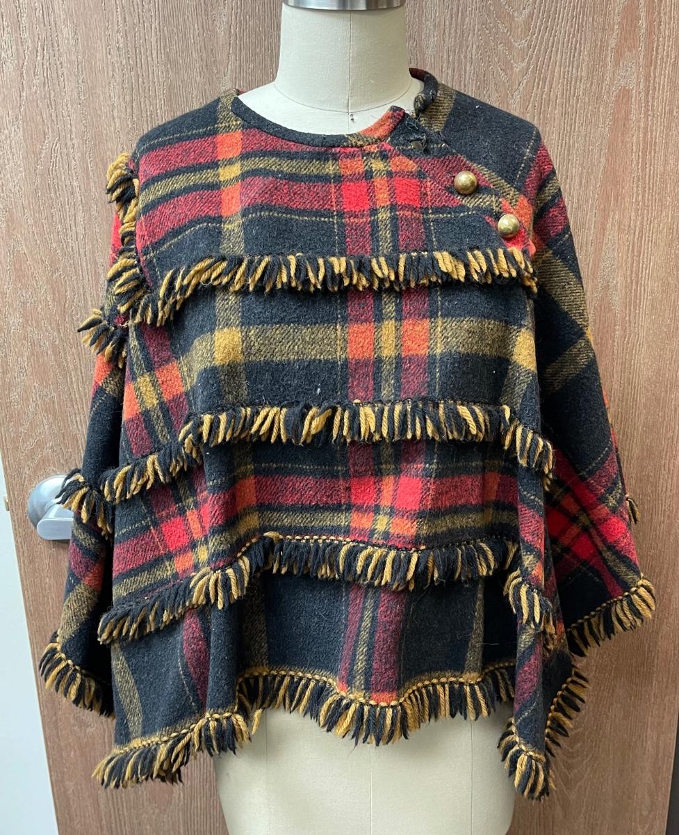 In good condition, but top button is missing in the front. Made by Country Place, King of the ponchos. No size Tag. Our mannequin is a size 8 and it fits pretty well. Feels like wool or wool blend.
