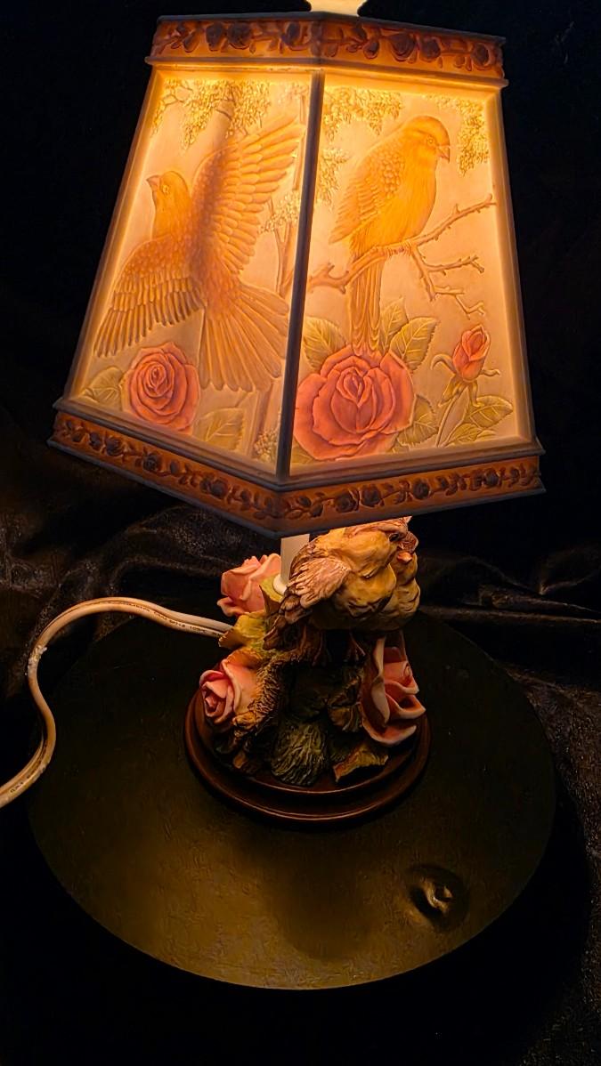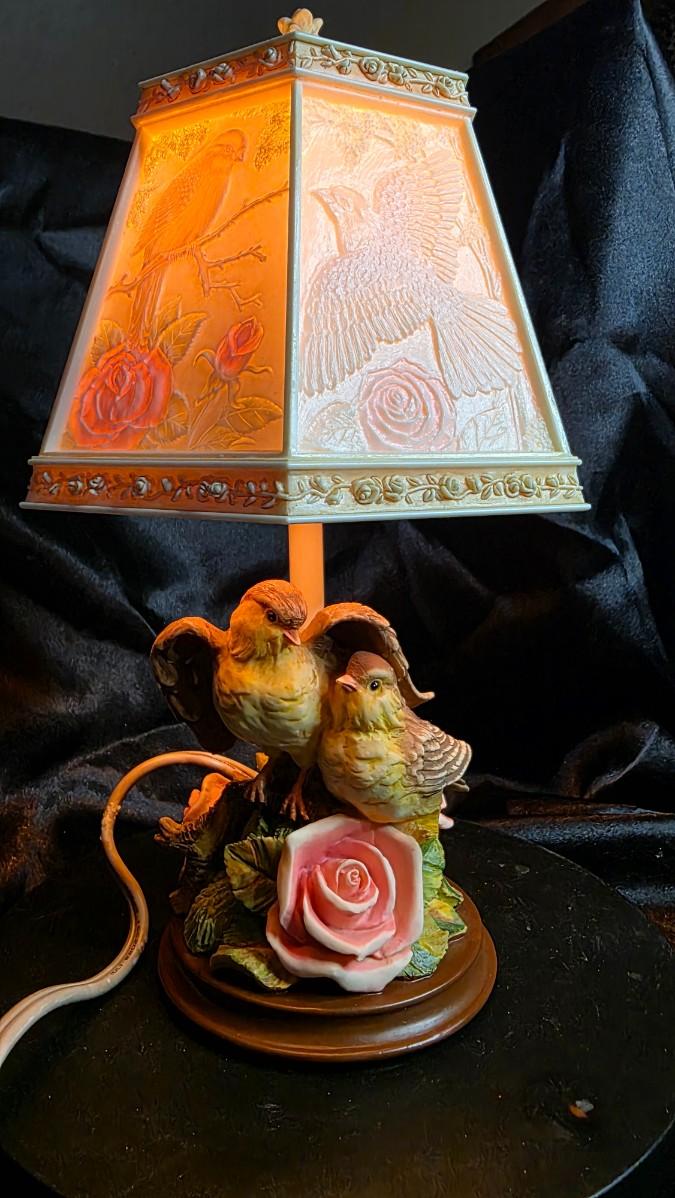 A warmly glowing celebration of nature, this vintage porcelain table lamp blends sculpted charm with gentle, atmospheric light. The base features an enchanting pair of songbirds perched among full-bloom porcelain roses and textured foliage, each feather and petal rendered with soft, lifelike detail. Above them rests a beautifully embossed lampshade, its panels decorated with raised birds, climbing branches, and roses that come alive when illuminated—casting a soft amber glow that feels both nostalgic and serene.