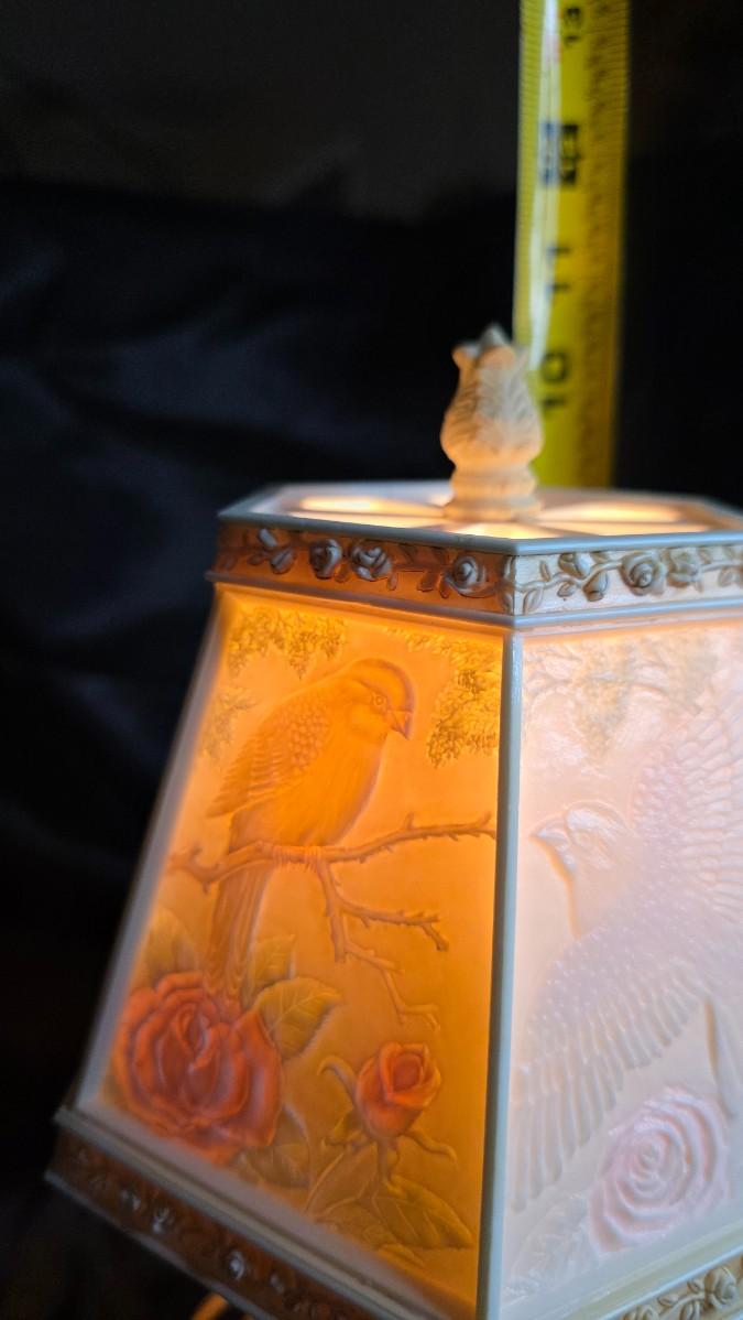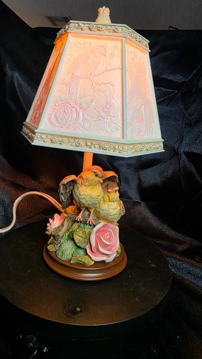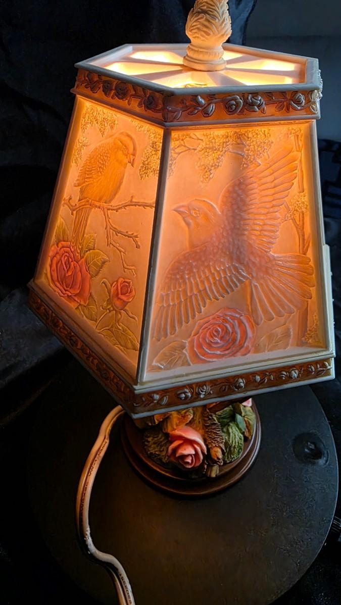 From its delicately carved floral trim to the sculpted finial crowning the top, the lamp exudes classic cottage romance and old-world craftsmanship. Lit or unlit, it’s a piece that draws the eye and adds warmth to any bedside table, reading nook, or vintage-styled décor. Perfect for collectors of bird motifs, floral porcelain, or unique accent lamps that tell a gentle story of nature and light.