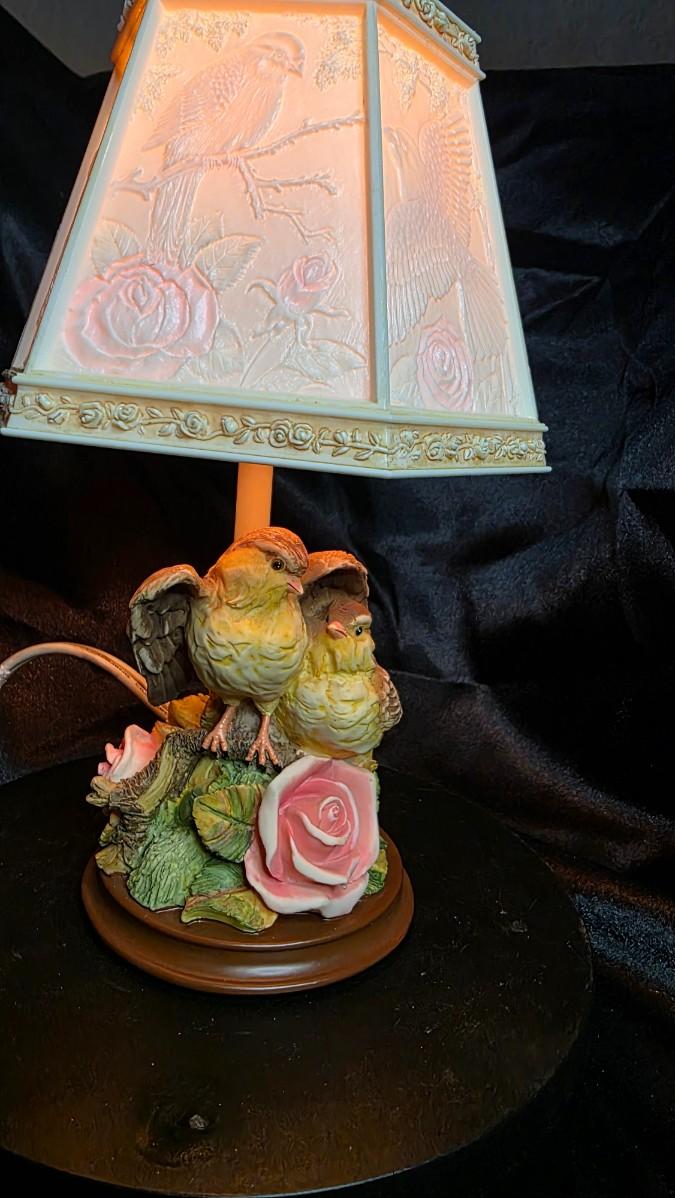 Vintage Porcelain Bird & Rose Table Lamp – Illuminated Embossed Shade & Sculpted Songbirds
