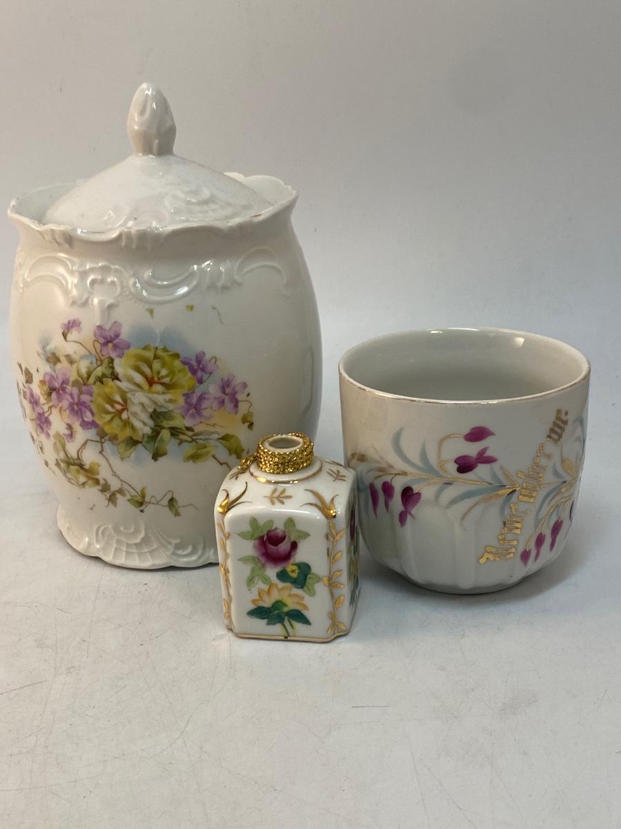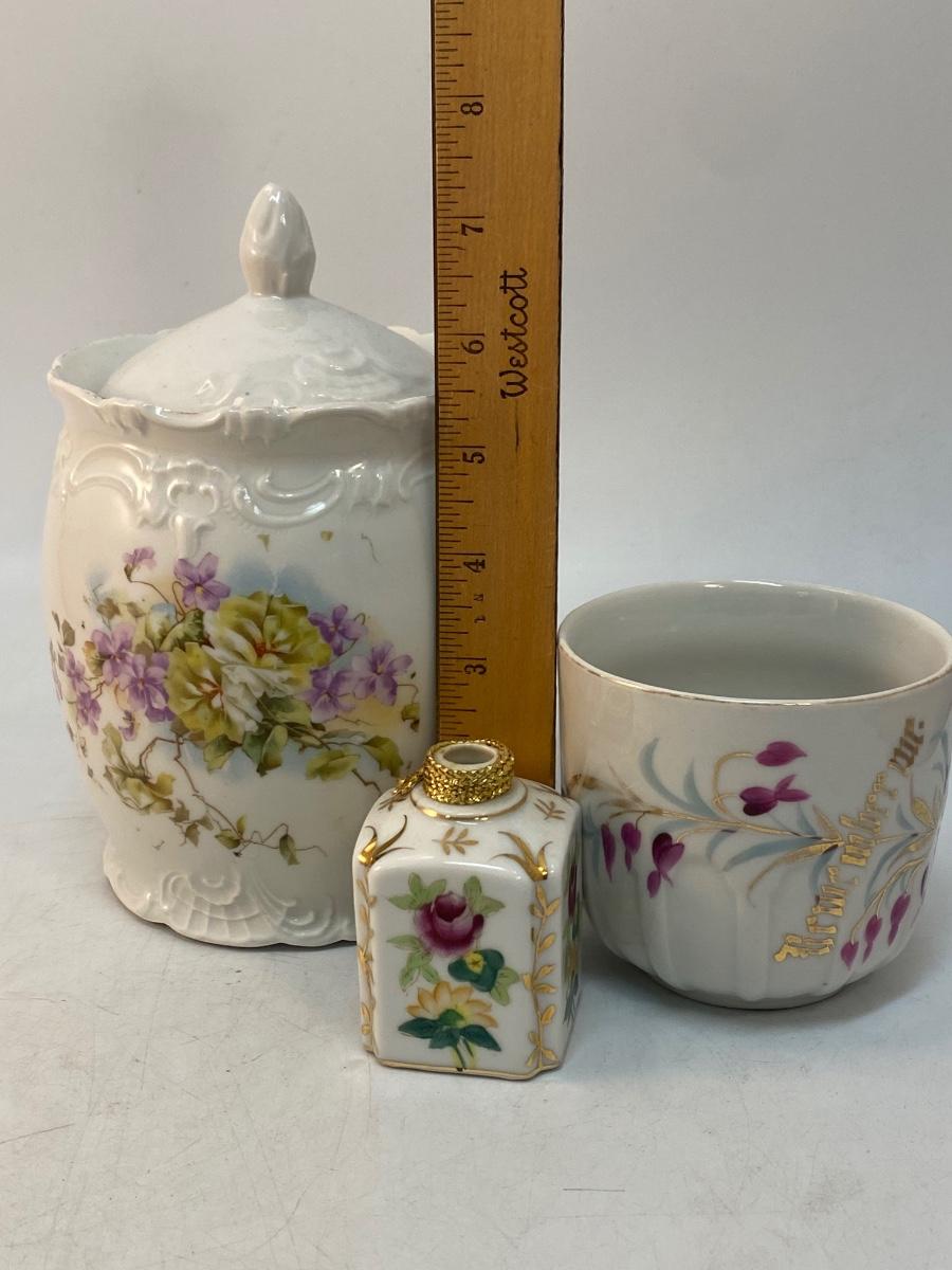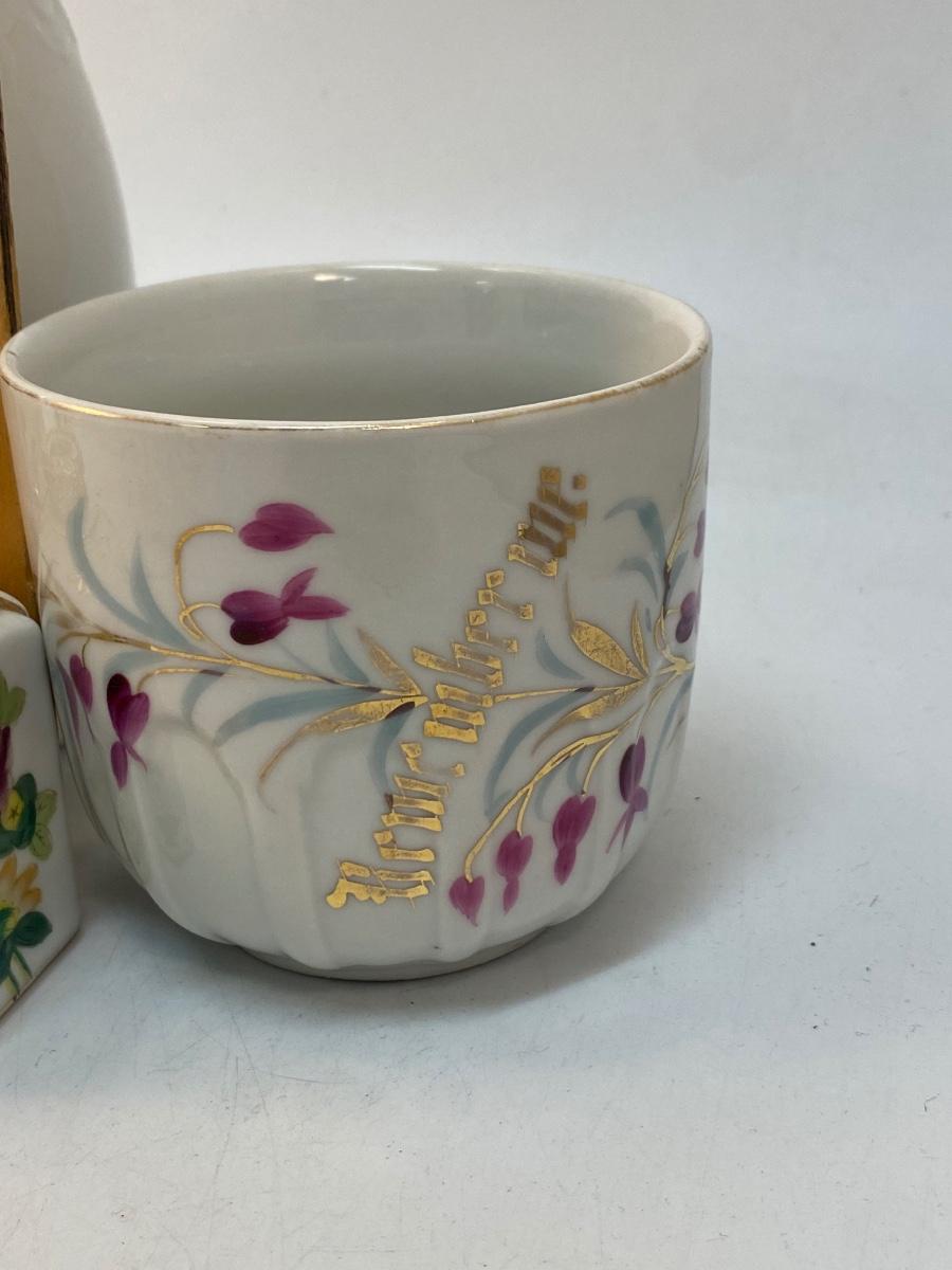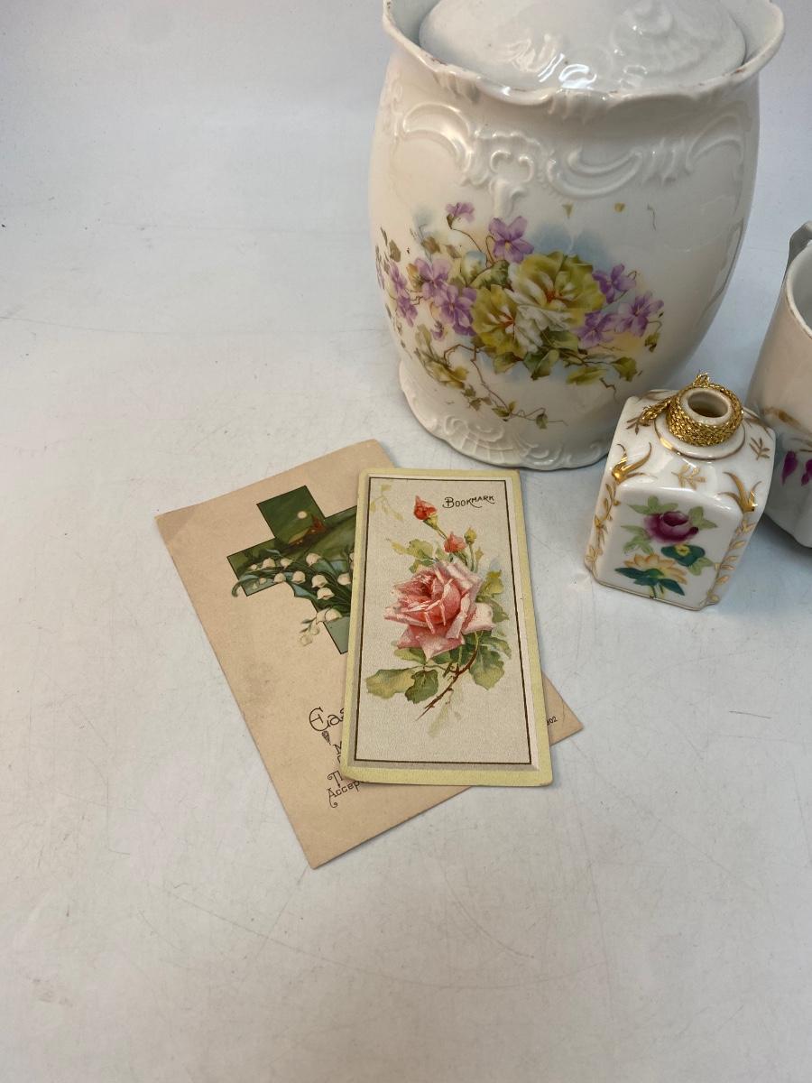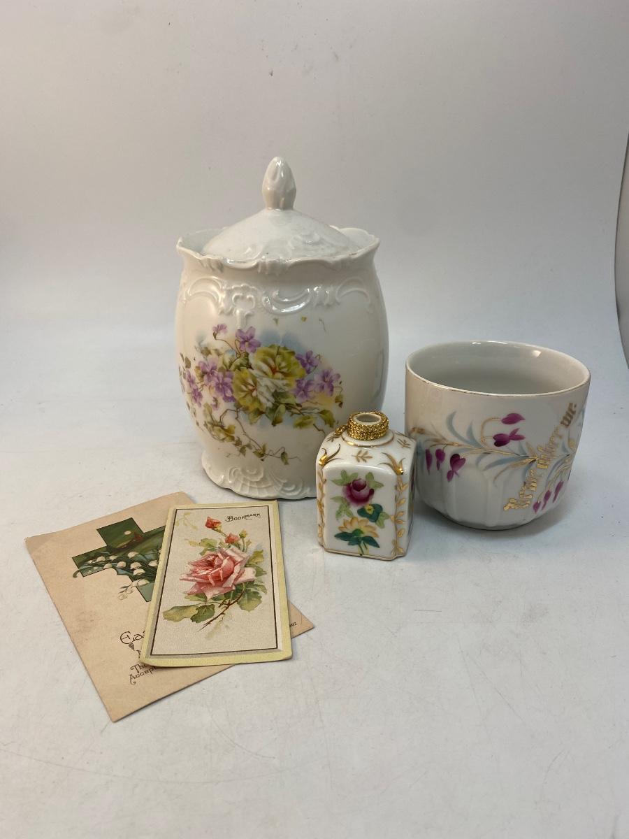 Vintage Porcelain Canister Teacup Bud Vase & Bookmark Postcard. Great additions to any shabby chic decor. Good condition, light wear, no chips.
