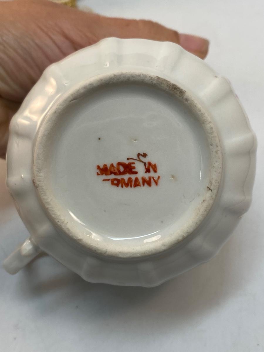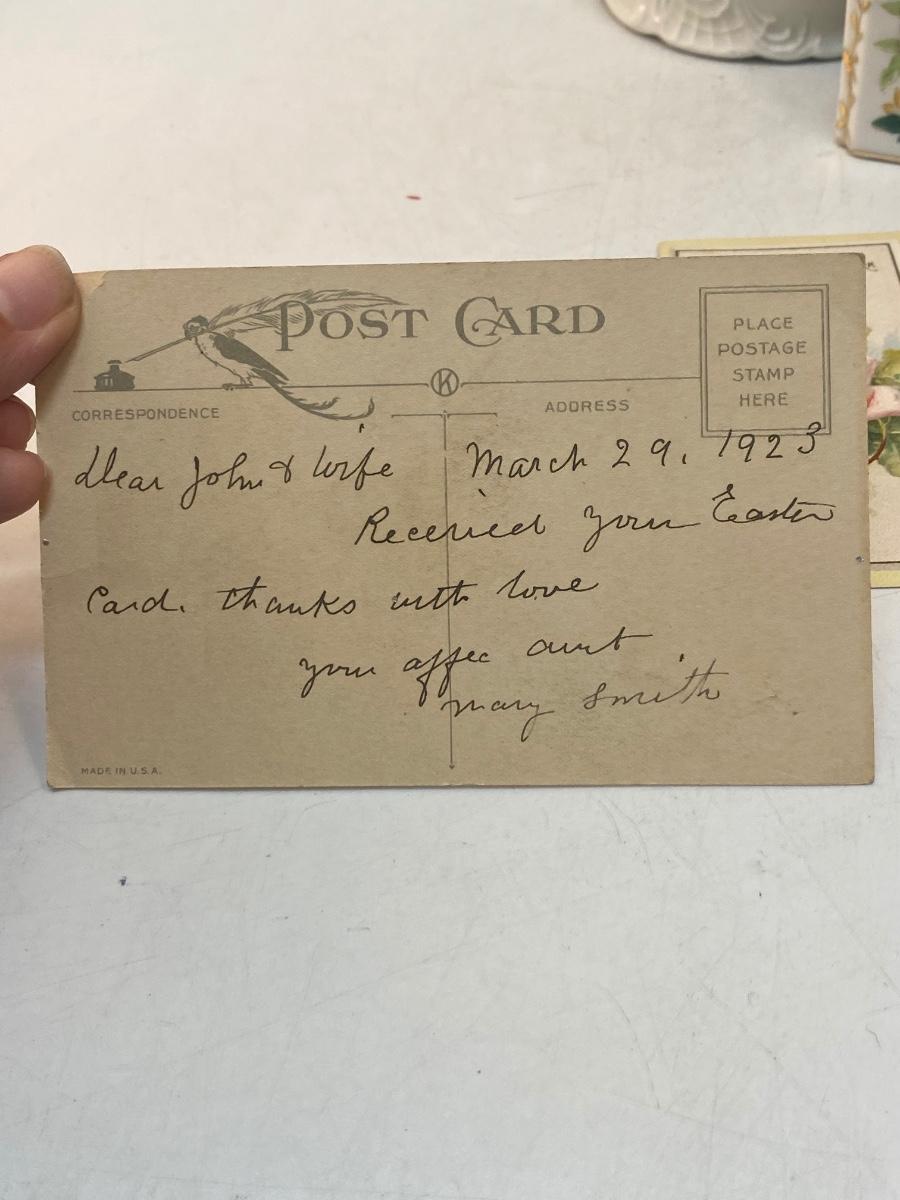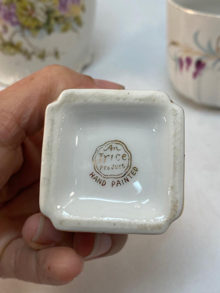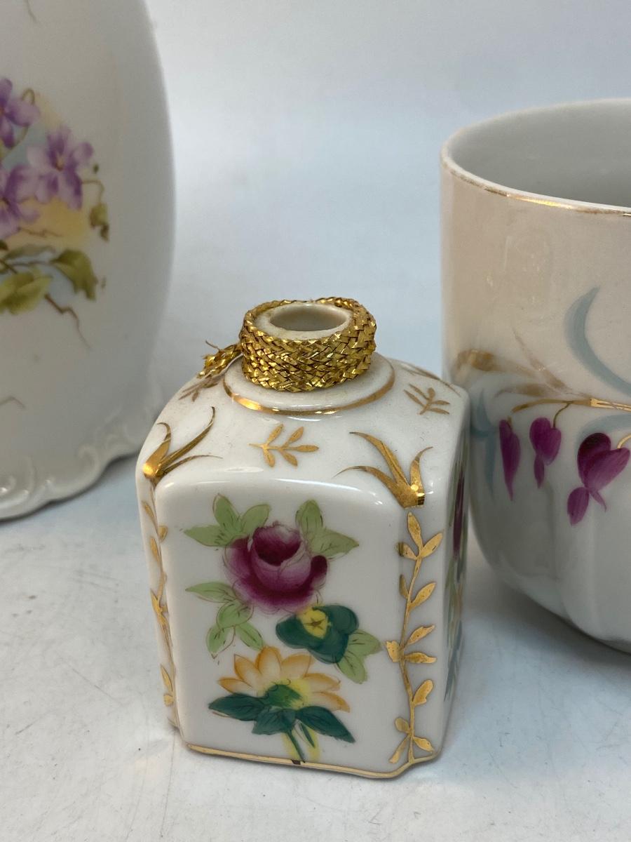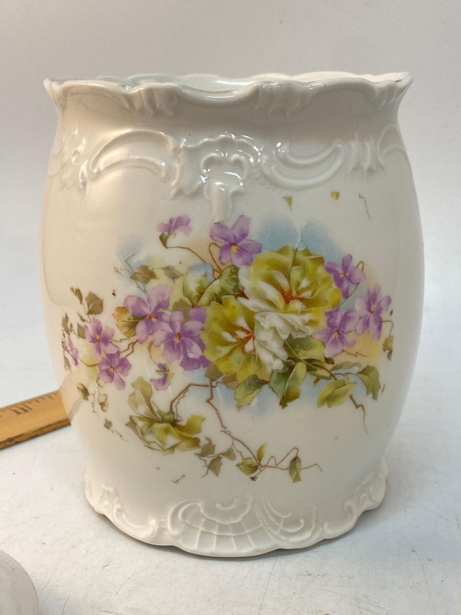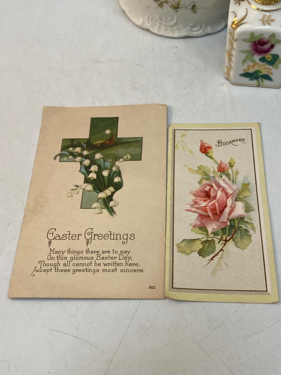 Vintage Porcelain Canister Teacup Bud Vase & Bookmark Postcard. Great additions to any shabby chic decor. Good condition, light wear, no chips.