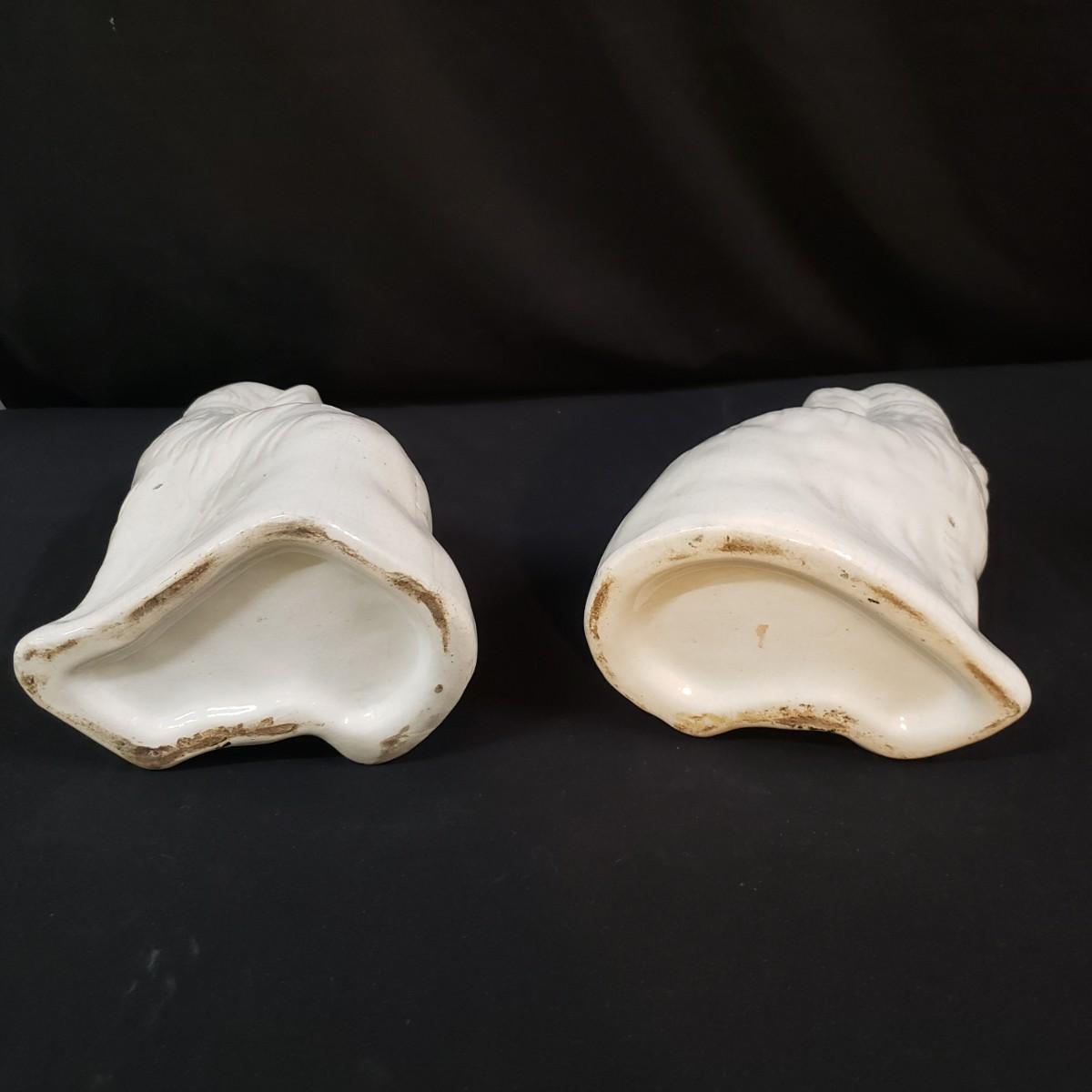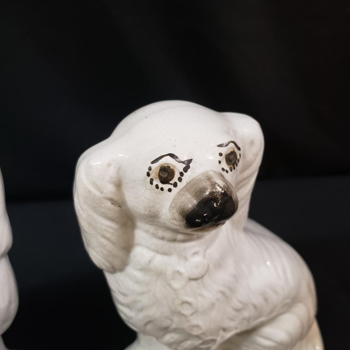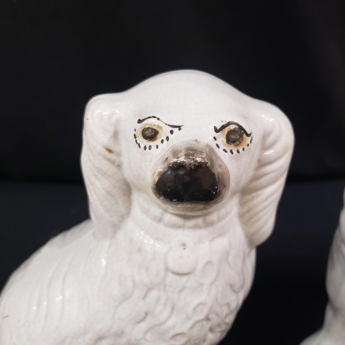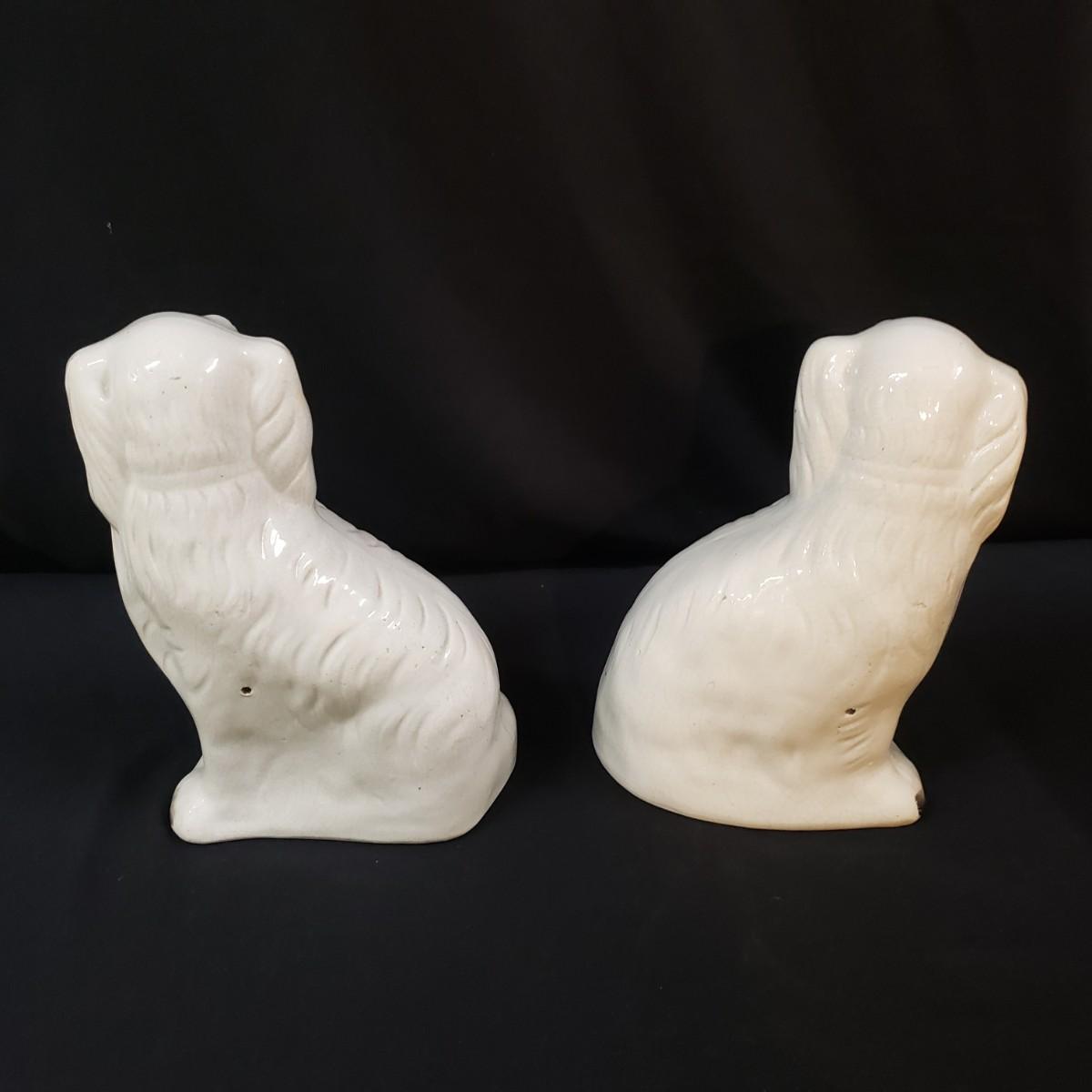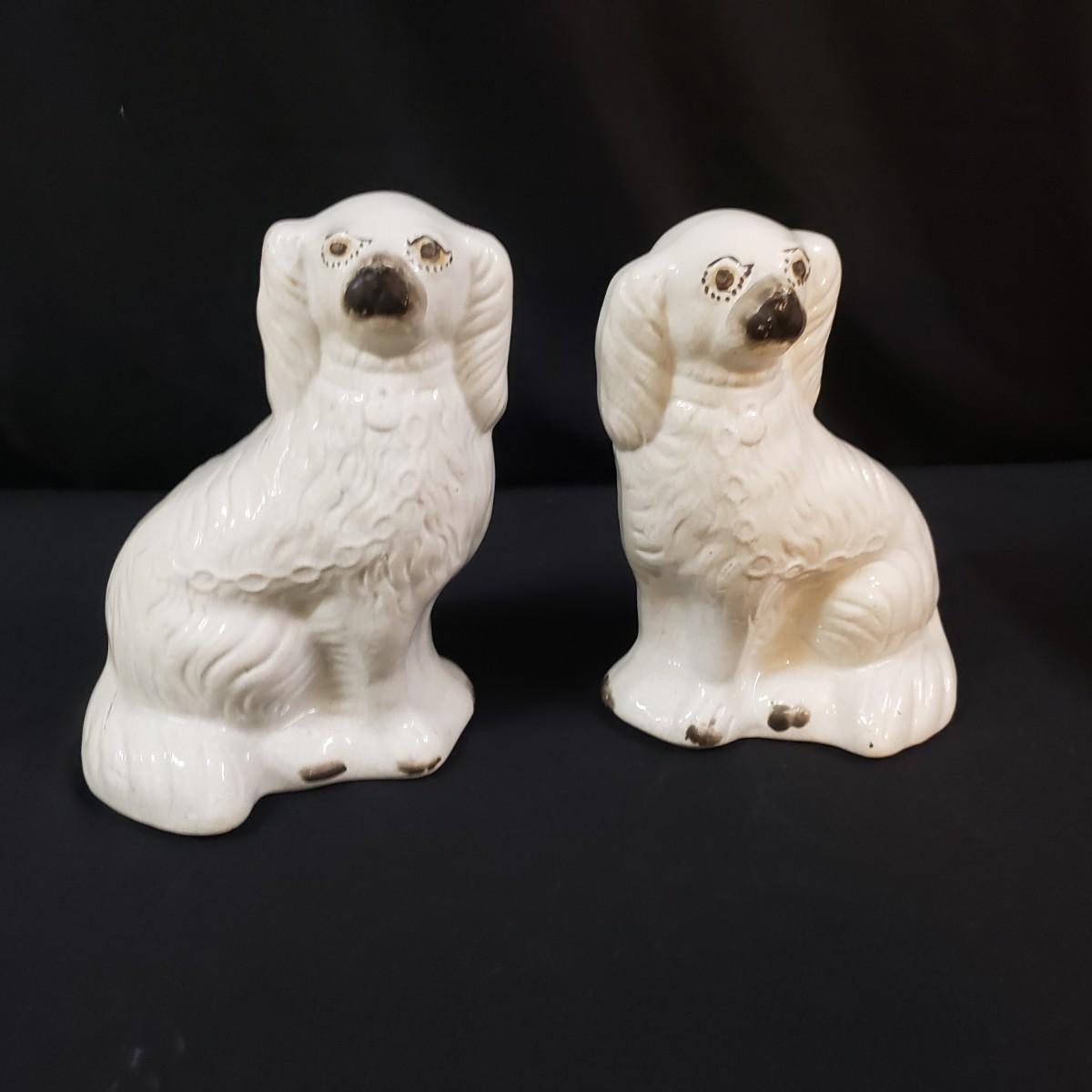 These two porcelain Staffordshire vintage dogs measure approximately 13"x7". They have painted black features on their face and paws. Both appear to be in good condition, no chips. They appear to be quite old; there are no makers marks to authenticate them.