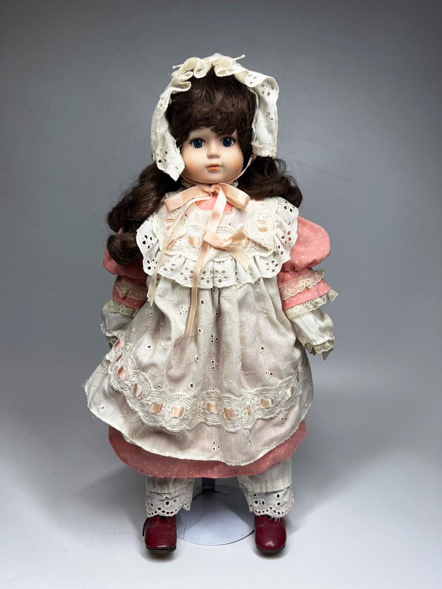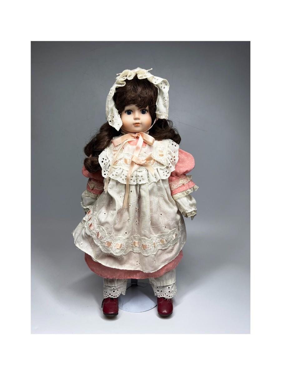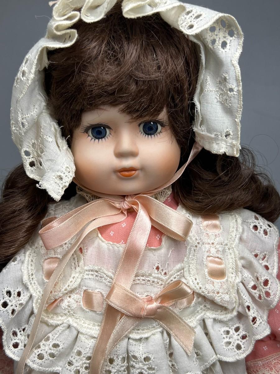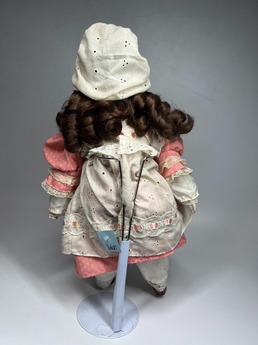 Vintage Porcelain Doll with Stand. Made in Taiwan. Displays nicely. Does have a broken shoulder piece under her dress. See photos.