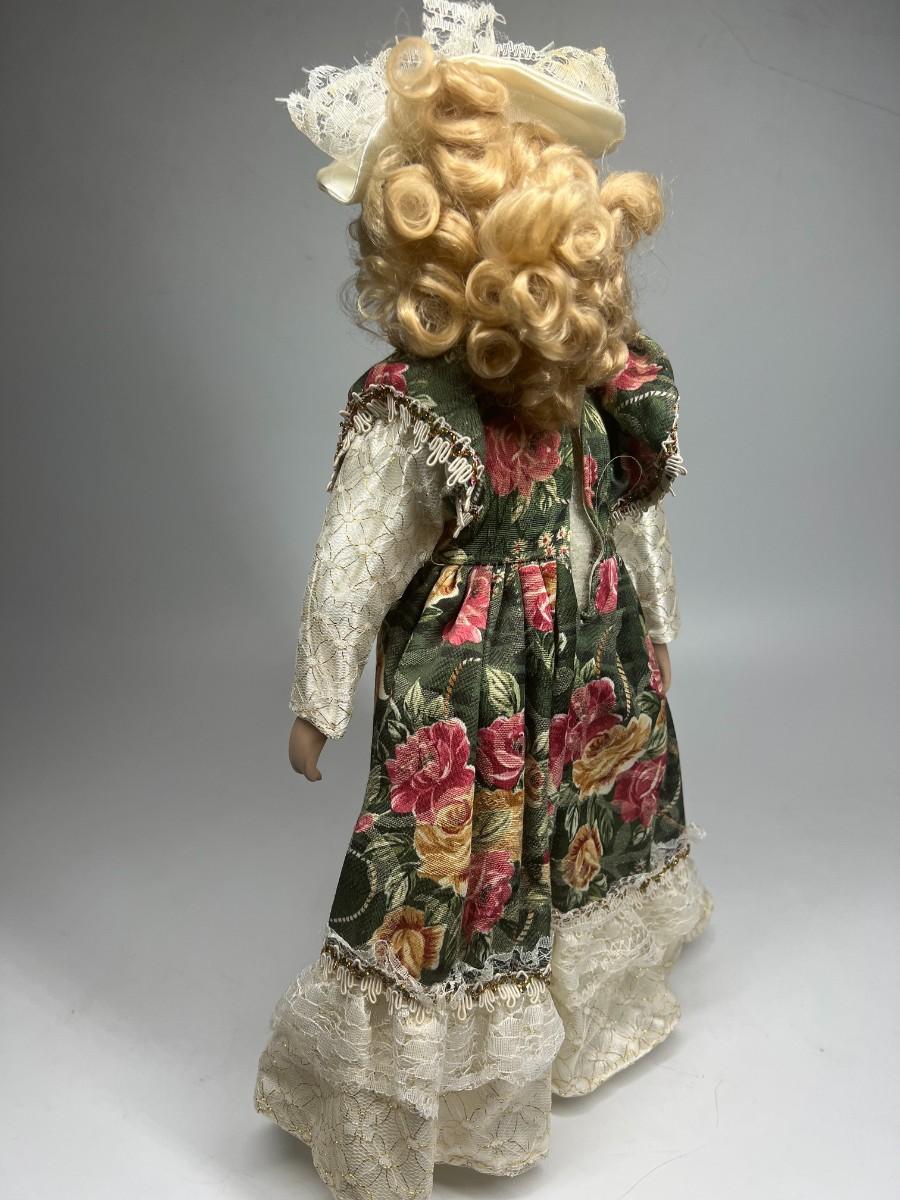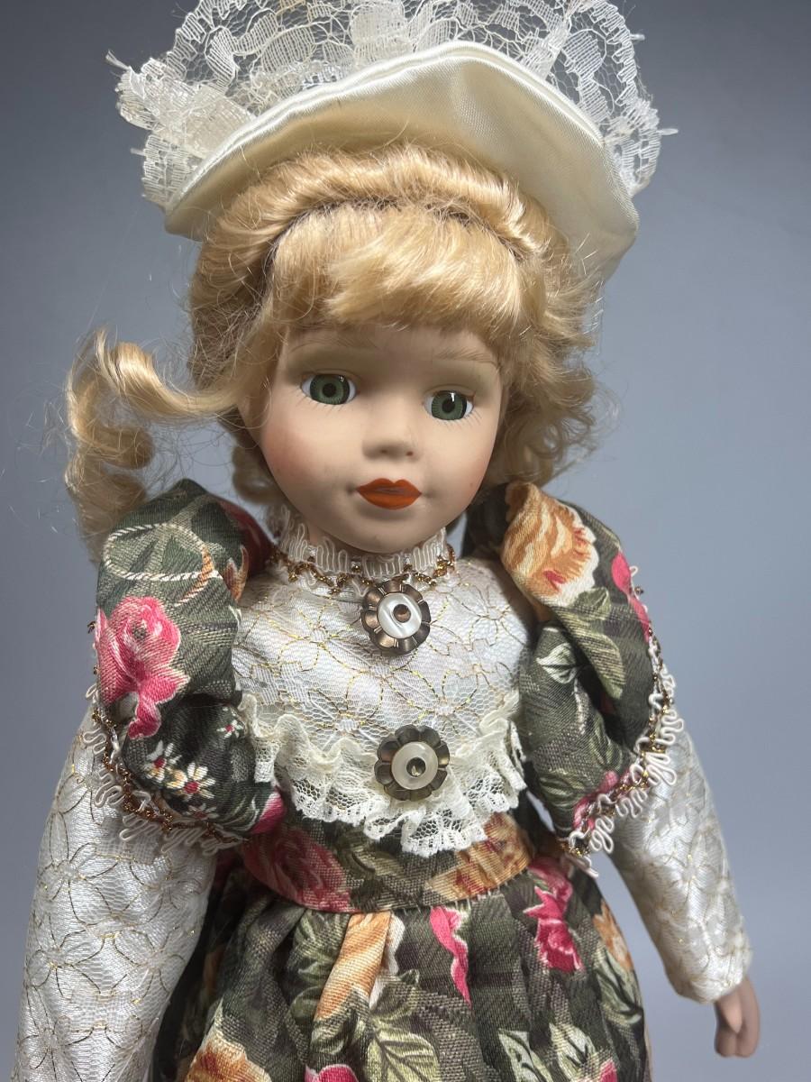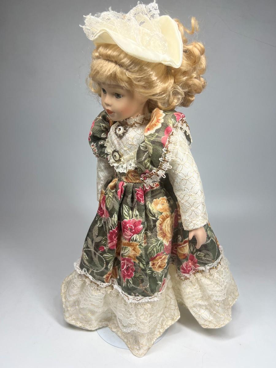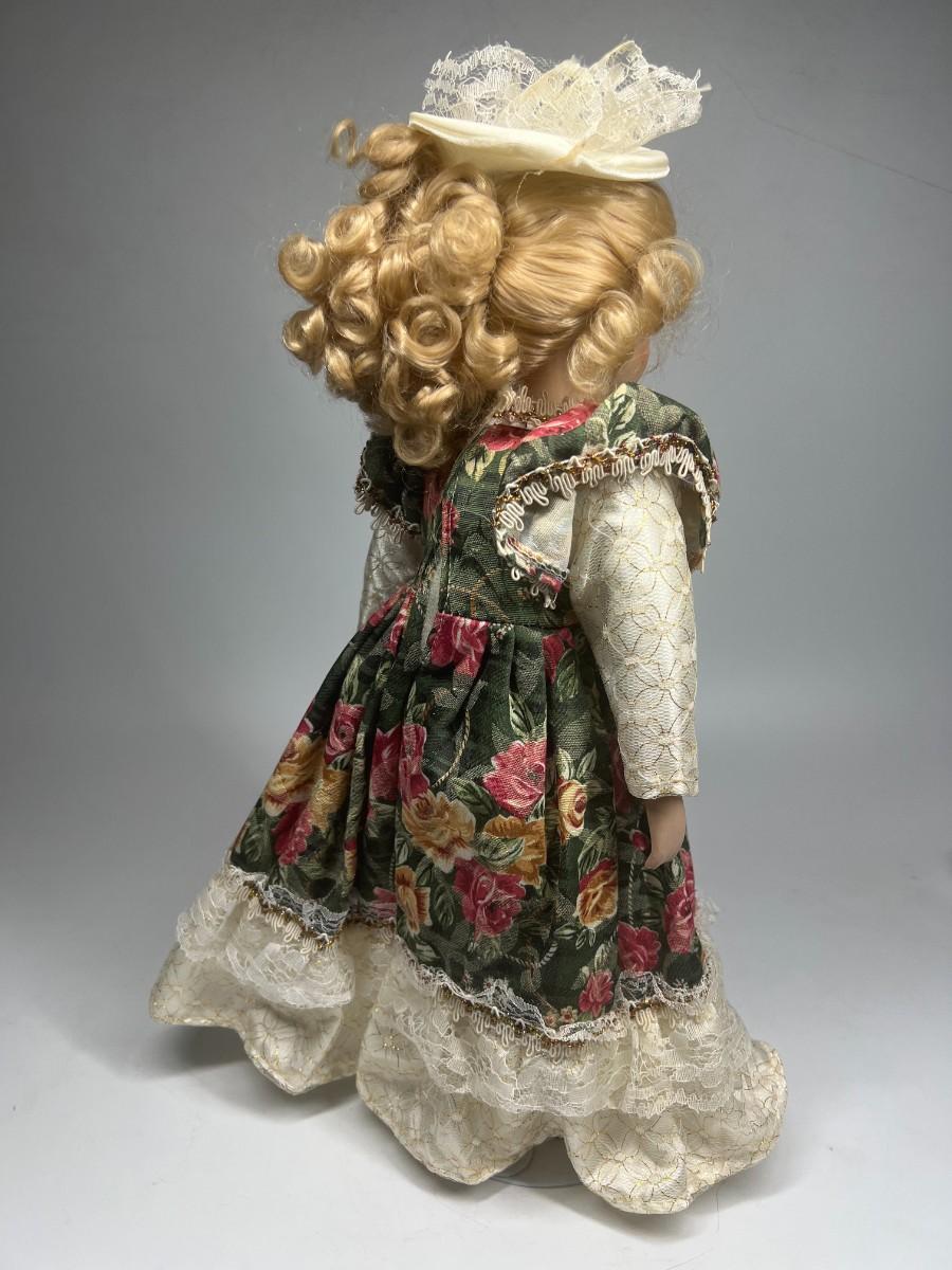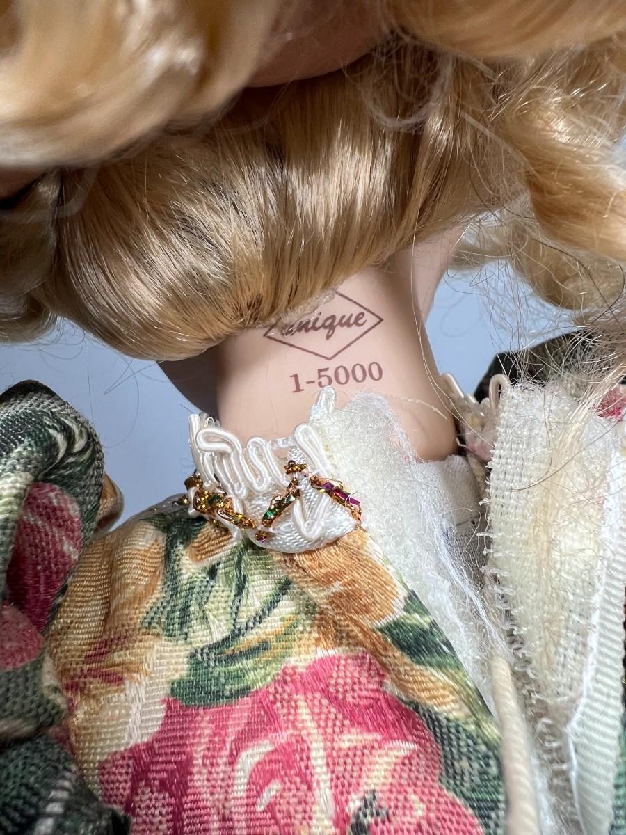 Vintage Porcelain Doll with Stand. Victorian style dress. Back of head marked Unique 1-5000. In good, displayed condition.