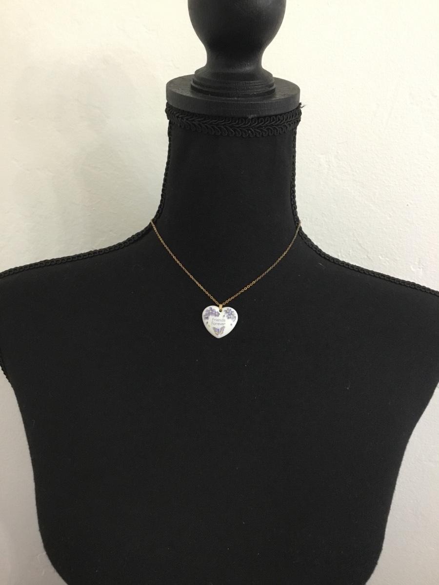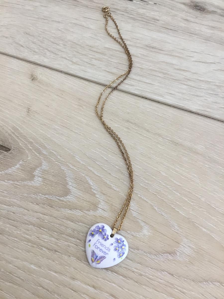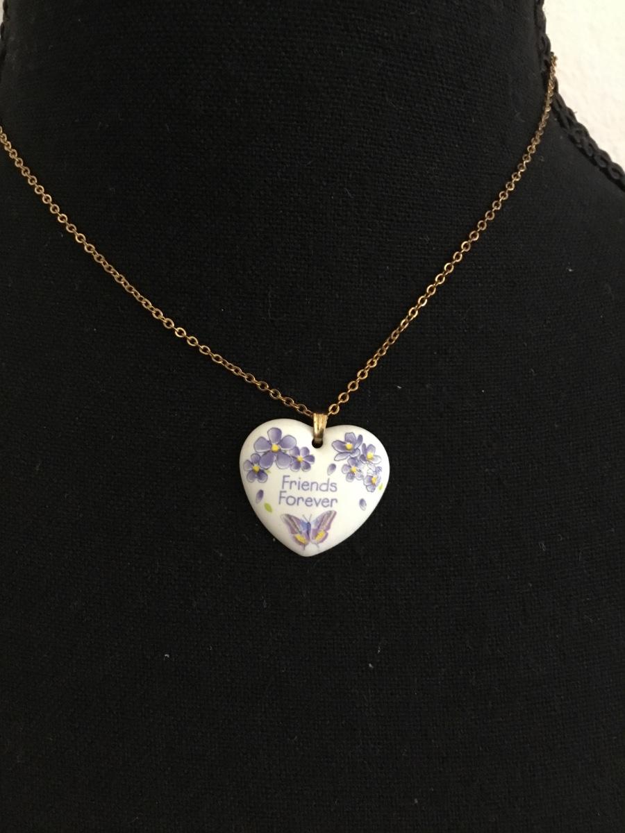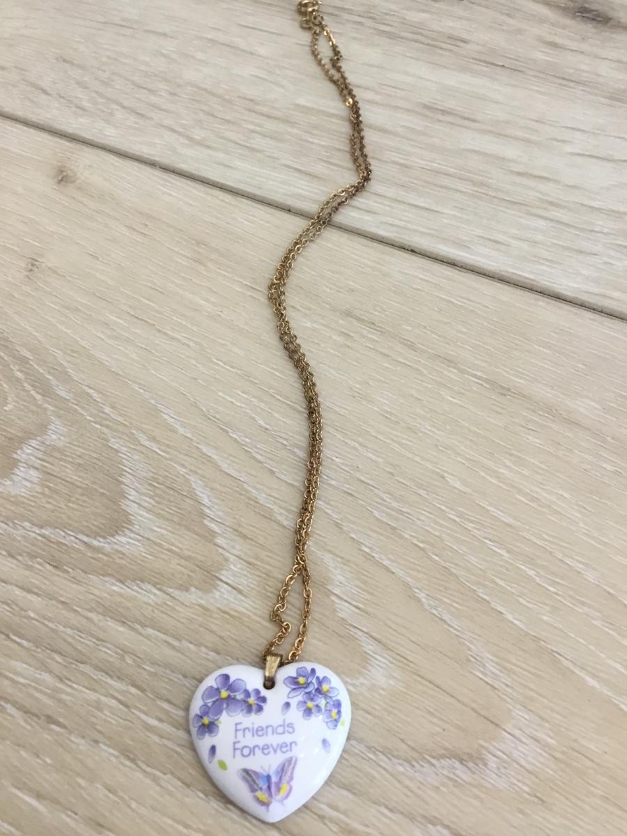 Vintage porcelain friends, forever, heart pendant, gold tone ,chain necklace