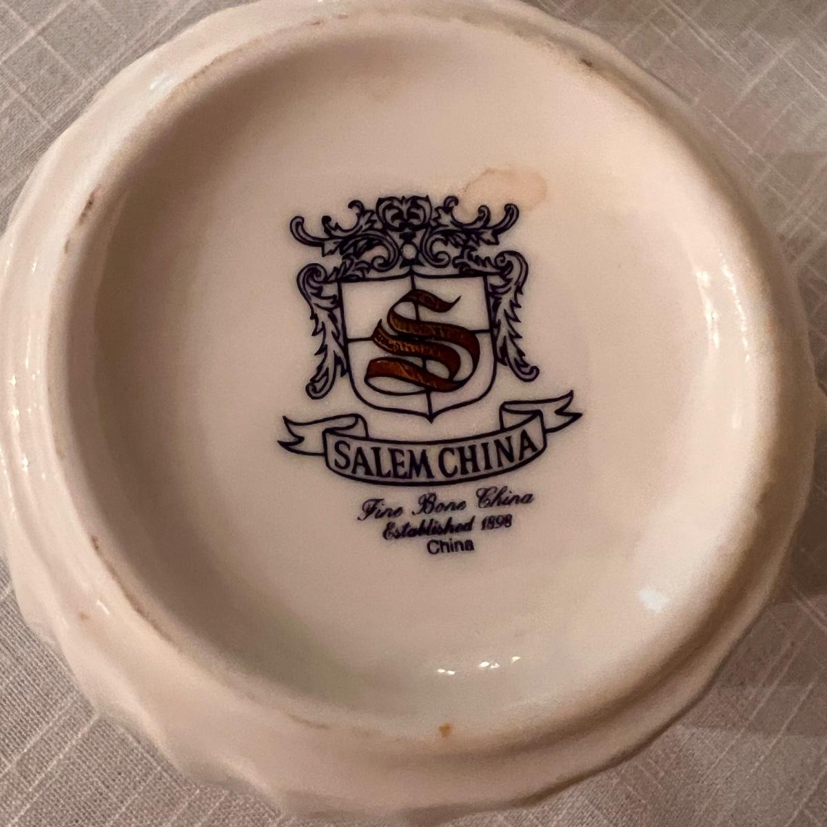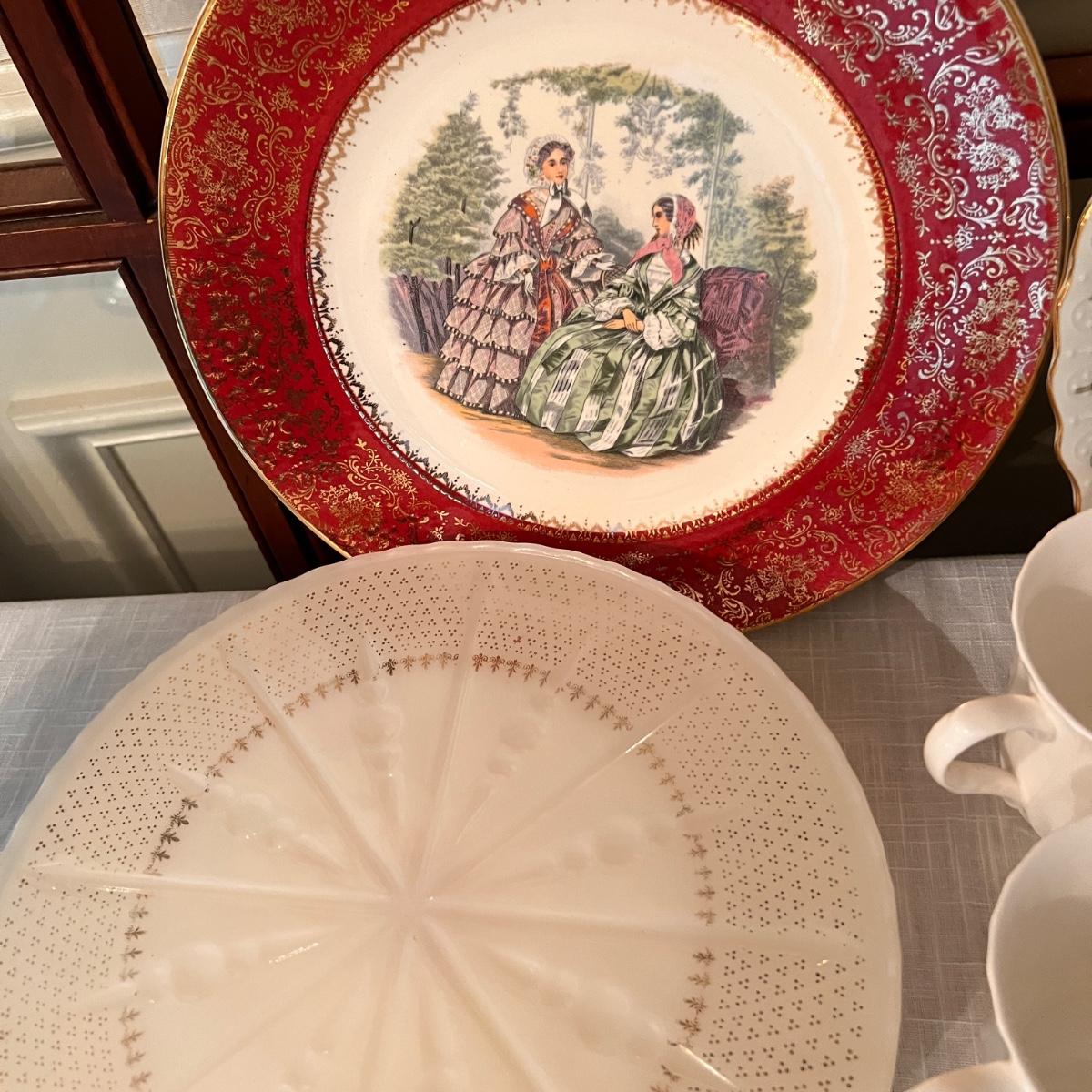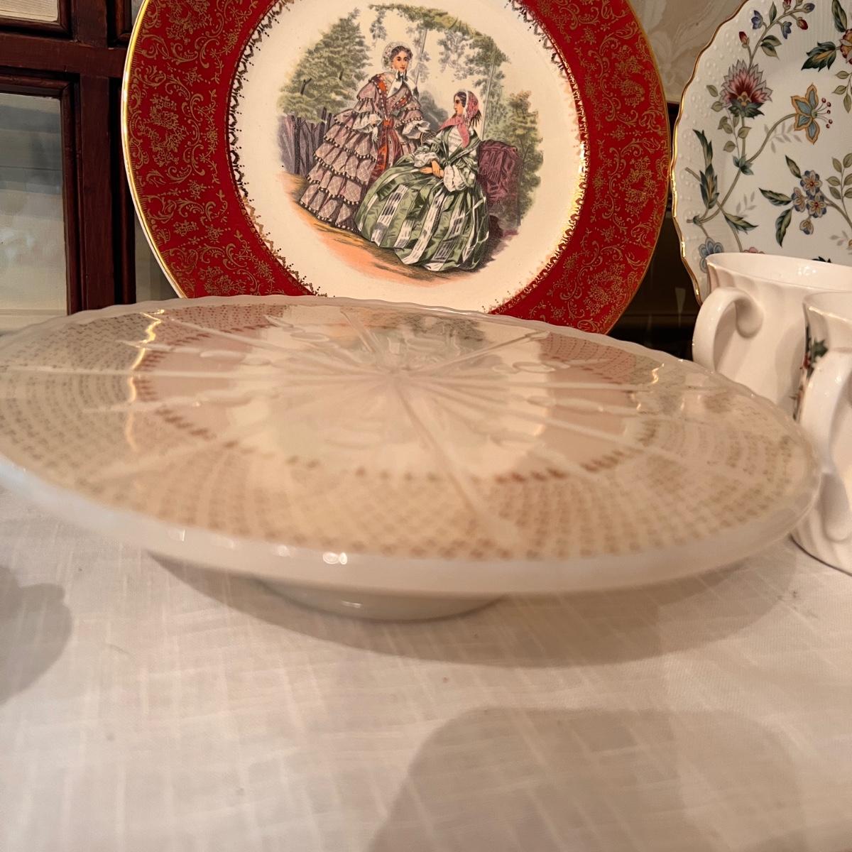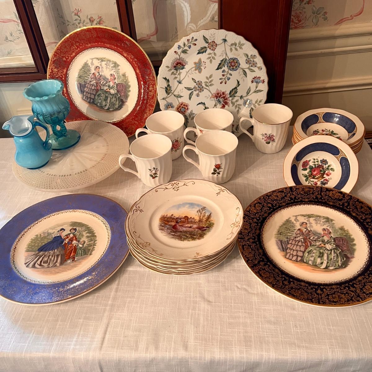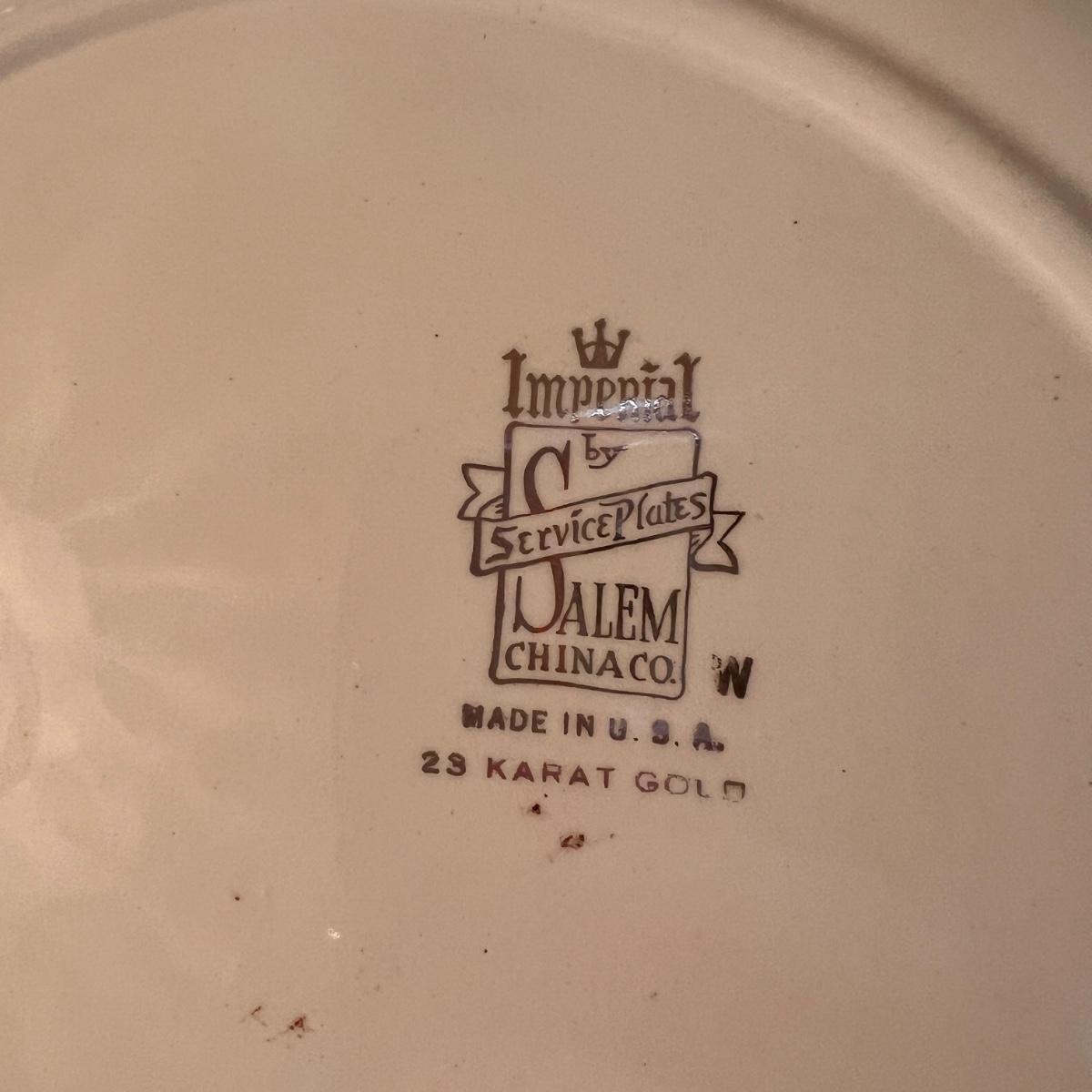 3 Vintage Imperial by Salem Service Plate 23 Karat Gold Trim, 8 BOOTHS Silicon China "Ceylon Ivory" Antique Bowls Made in England Discontinued Collectible Pattern 1 has small chip, 6 rare antique TST Art China by Taylor, Smith & Taylor Co., 5 porcelain Salem China tea cups, Andrea by Sadek "Buckingham" cake plate, 1950's Anchor Hocking MCM Cake Stand off-white milk glass gold filigree design top, scalloped edge 2.5" tall, blue milk glass vase, blue opalescent vase with small crack at base.