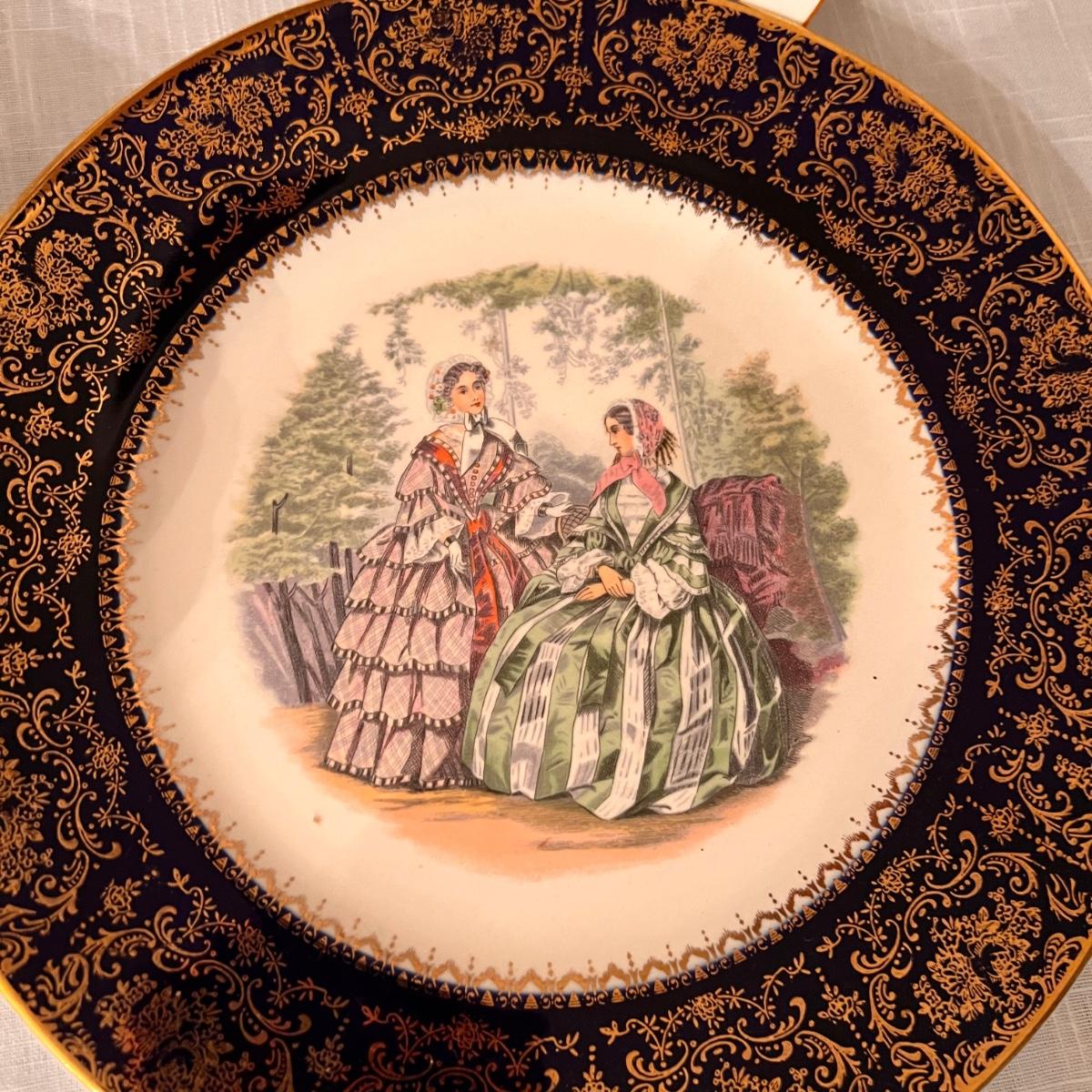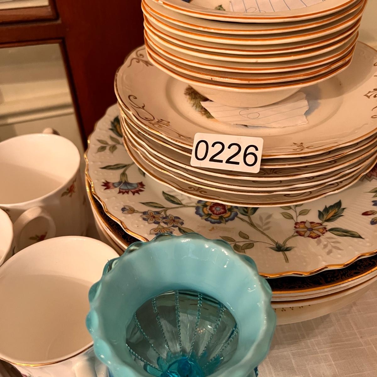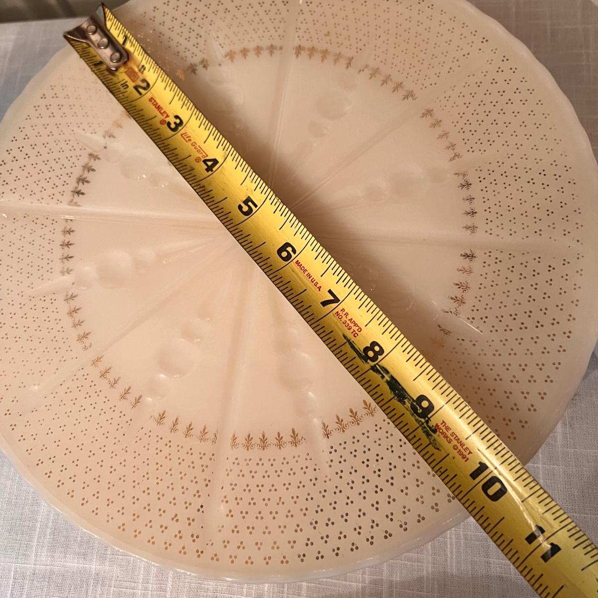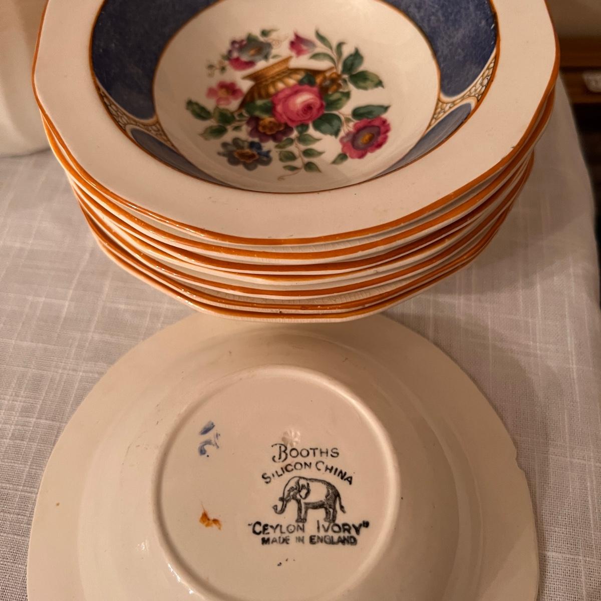 3 Vintage Imperial by Salem Service Plate 23 Karat Gold Trim, 8 BOOTHS Silicon China "Ceylon Ivory" Antique Bowls Made in England Discontinued Collectible Pattern 1 has small chip, 6 rare antique TST Art China by Taylor, Smith & Taylor Co., 5 porcelain Salem China tea cups, Andrea by Sadek "Buckingham" cake plate, 1950's Anchor Hocking MCM Cake Stand off-white milk glass gold filigree design top, scalloped edge 2.5" tall, blue milk glass vase, blue opalescent vase with small crack at base.