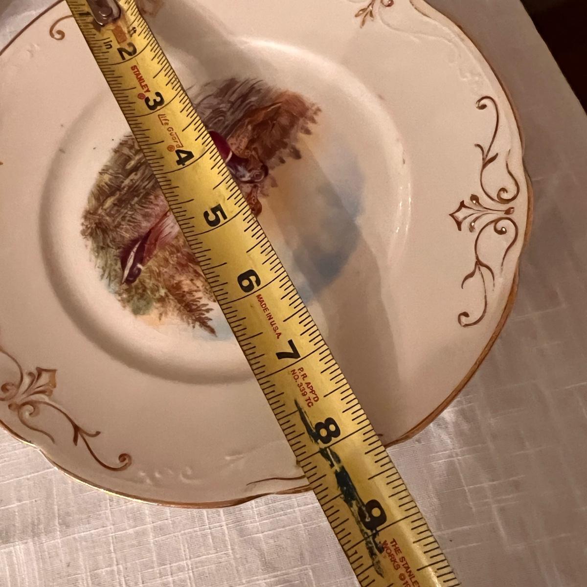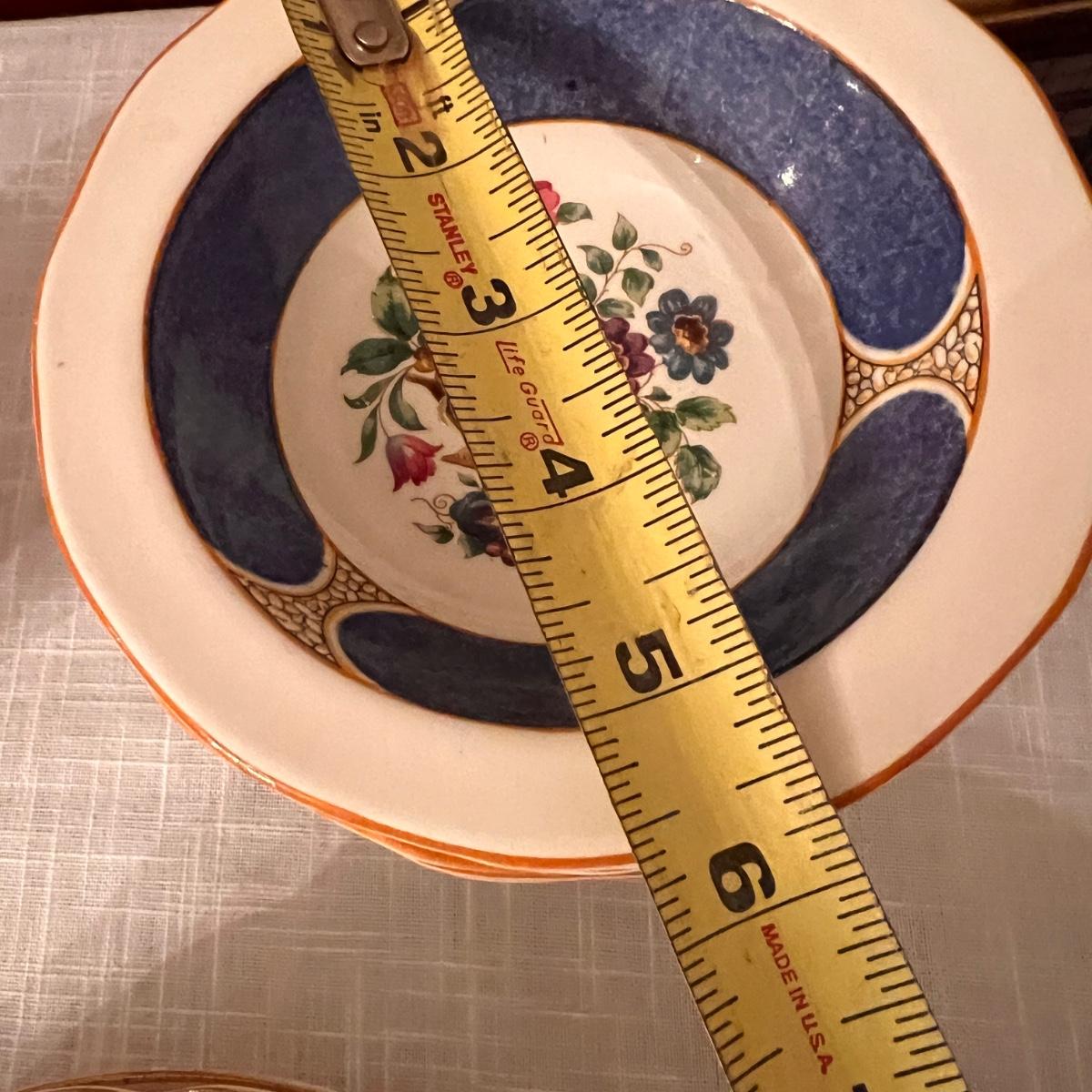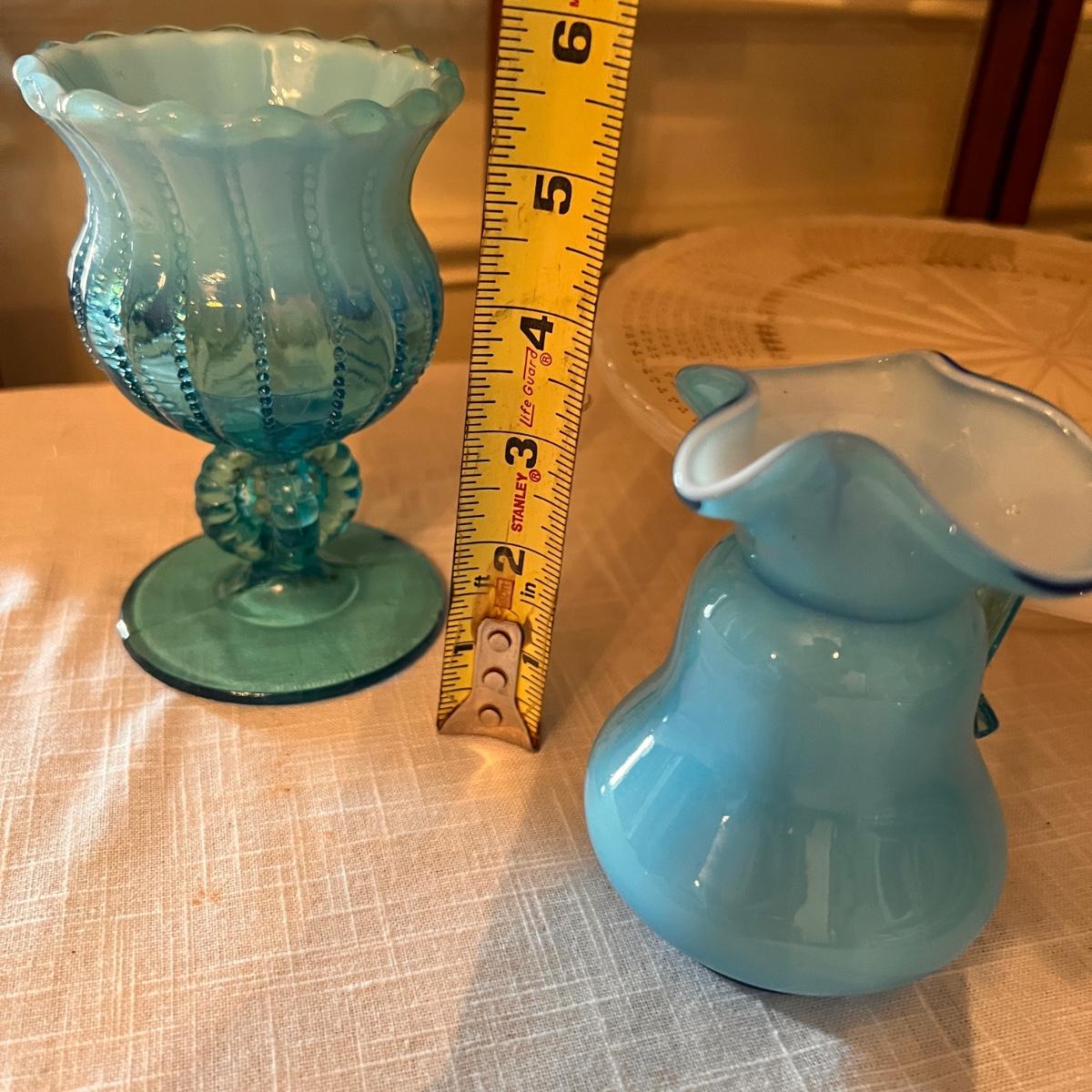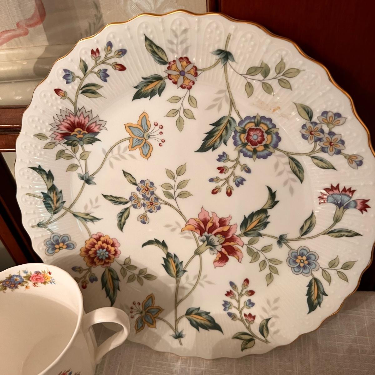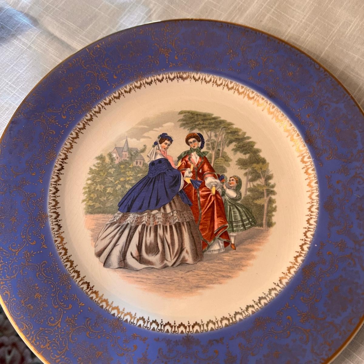 3 Vintage Imperial by Salem Service Plate 23 Karat Gold Trim, 8 BOOTHS Silicon China "Ceylon Ivory" Antique Bowls Made in England Discontinued Collectible Pattern 1 has small chip, 6 rare antique TST Art China by Taylor, Smith & Taylor Co., 5 porcelain Salem China tea cups, Andrea by Sadek "Buckingham" cake plate, 1950's Anchor Hocking MCM Cake Stand off-white milk glass gold filigree design top, scalloped edge 2.5" tall, blue milk glass vase, blue opalescent vase with small crack at base.