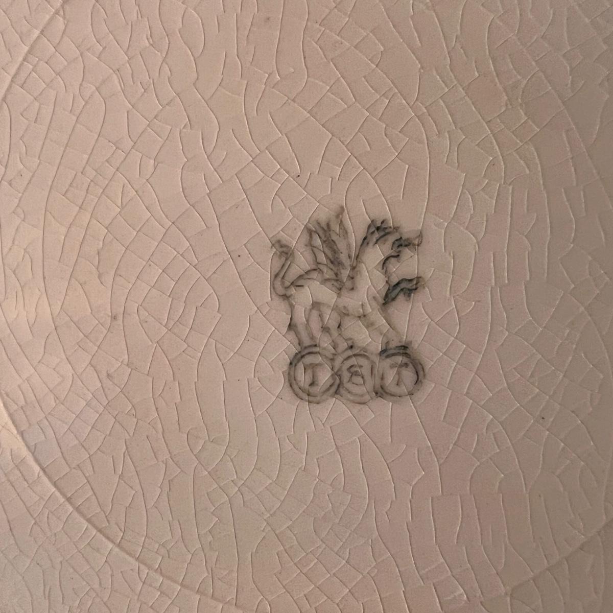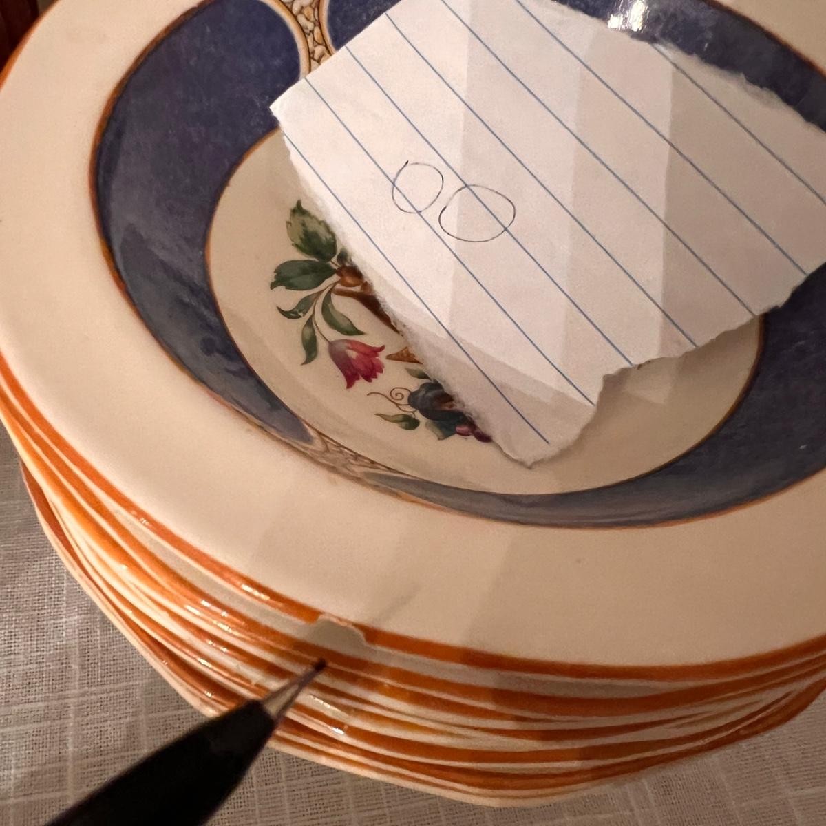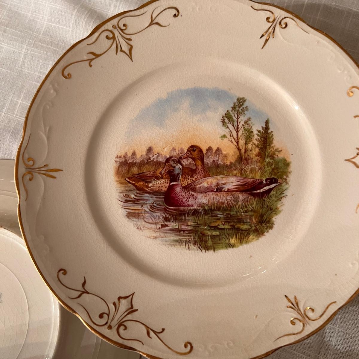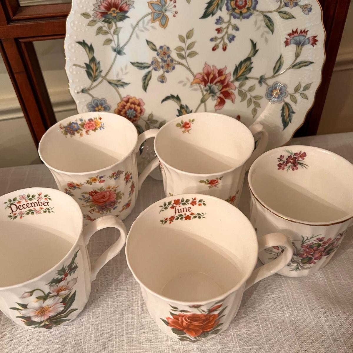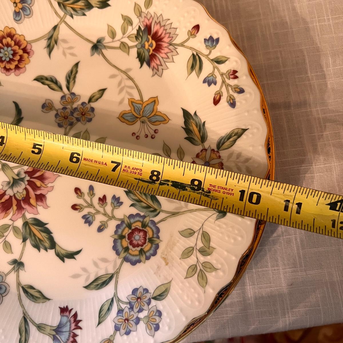 3 Vintage Imperial by Salem Service Plate 23 Karat Gold Trim, 8 BOOTHS Silicon China "Ceylon Ivory" Antique Bowls Made in England Discontinued Collectible Pattern 1 has small chip, 6 rare antique TST Art China by Taylor, Smith & Taylor Co., 5 porcelain Salem China tea cups, Andrea by Sadek "Buckingham" cake plate, 1950's Anchor Hocking MCM Cake Stand off-white milk glass gold filigree design top, scalloped edge 2.5" tall, blue milk glass vase, blue opalescent vase with small crack at base.