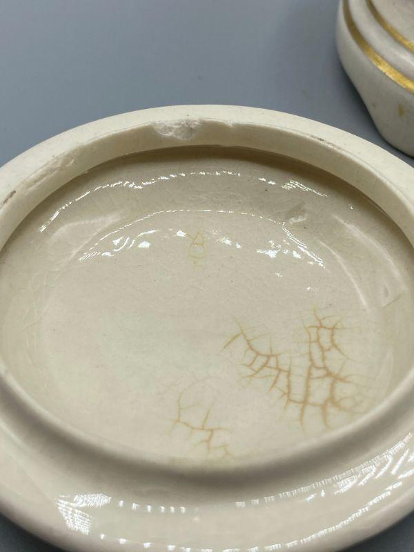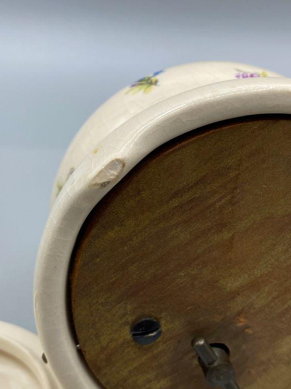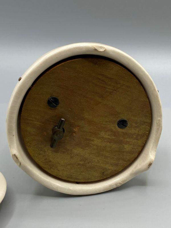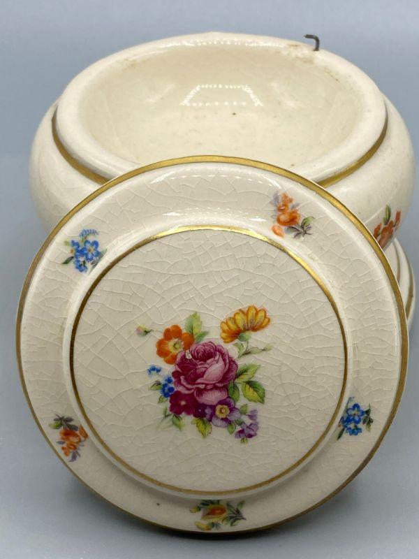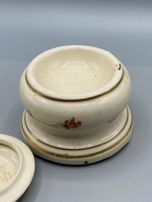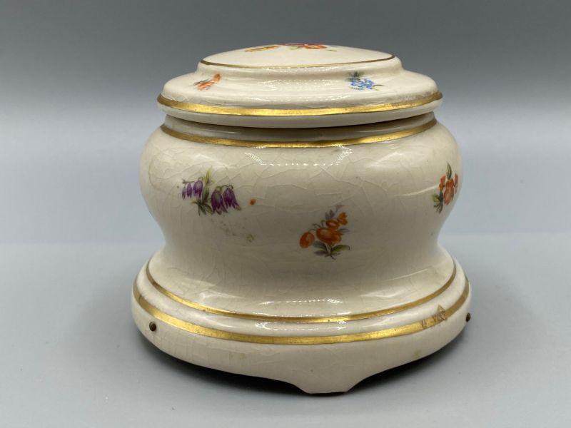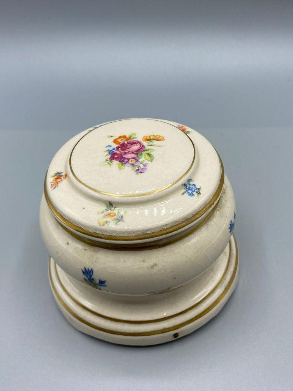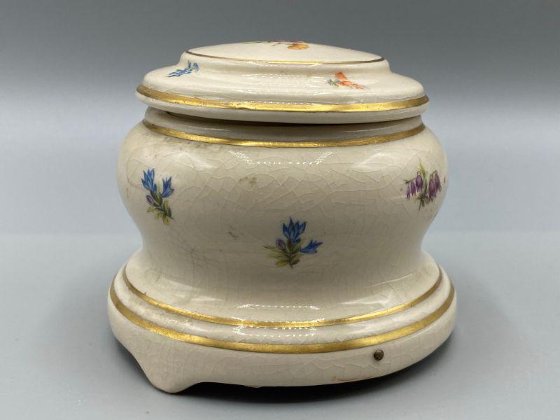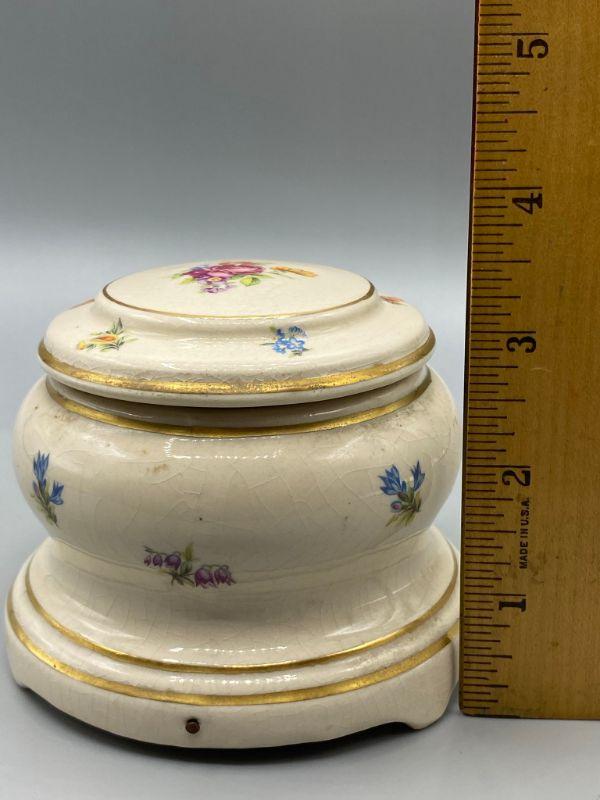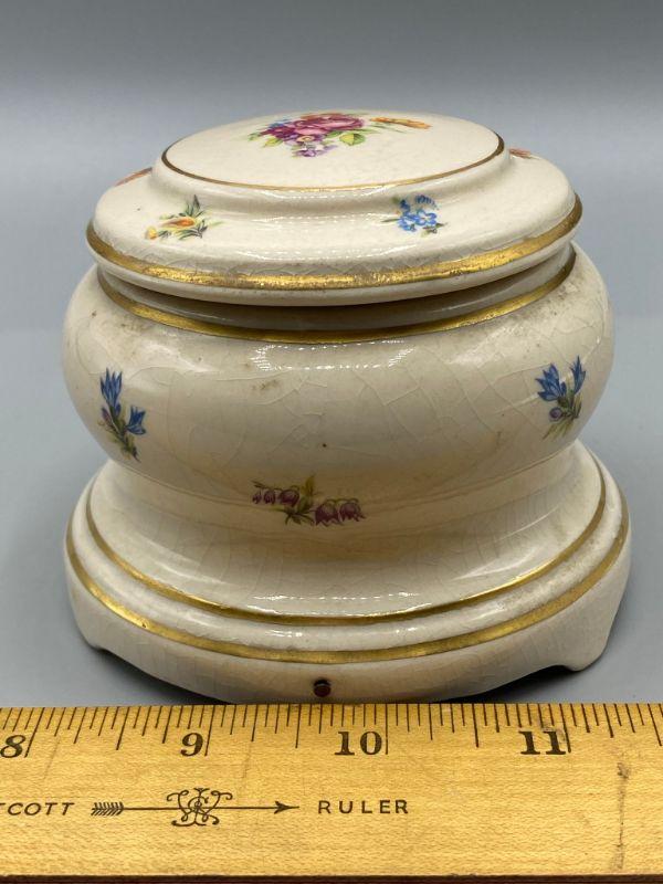 Small vintage porcelain music box. Dainty floral design with gold accents. Lid comes off to show a shallow trinket spot. The music box does not work, it seems to be over wound possibly. Unmarked. There is crazing in the finish. Stands about 3.5"