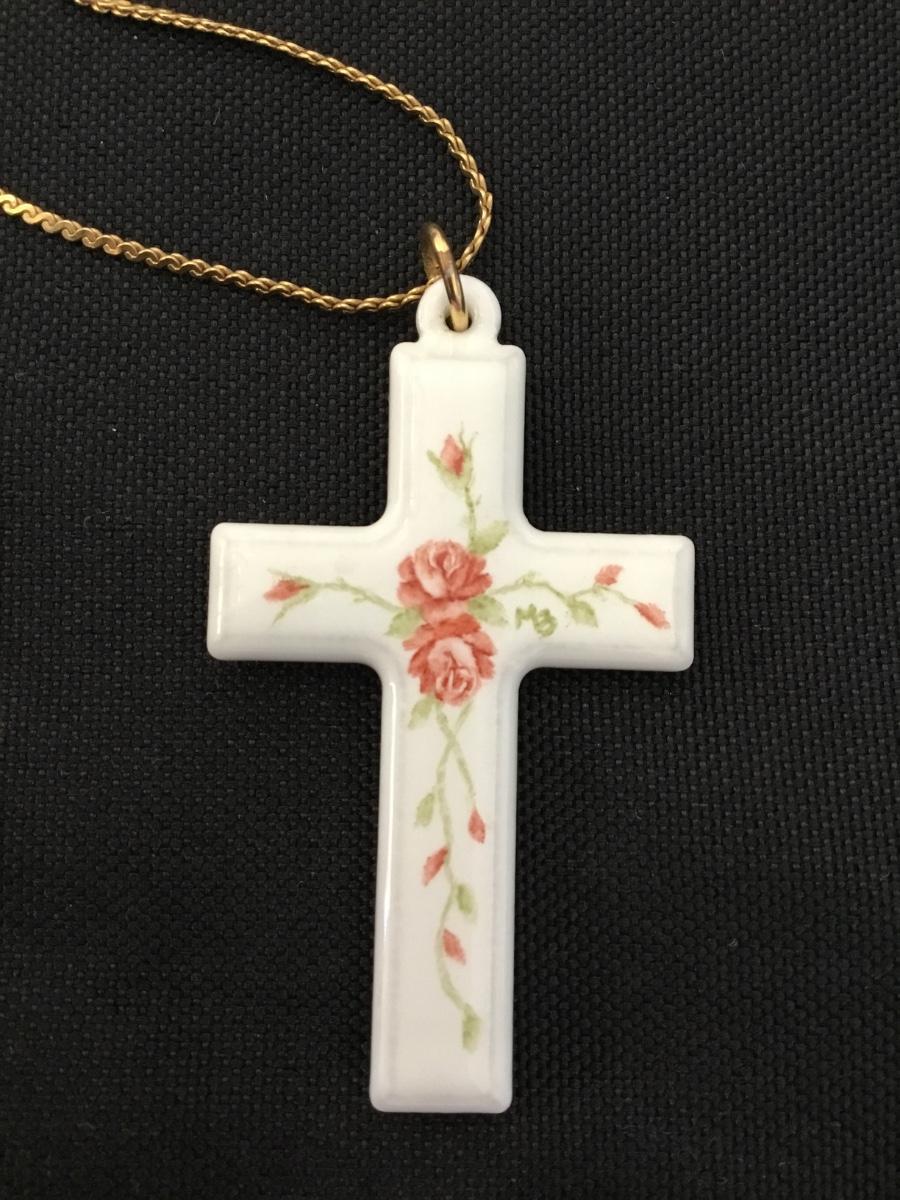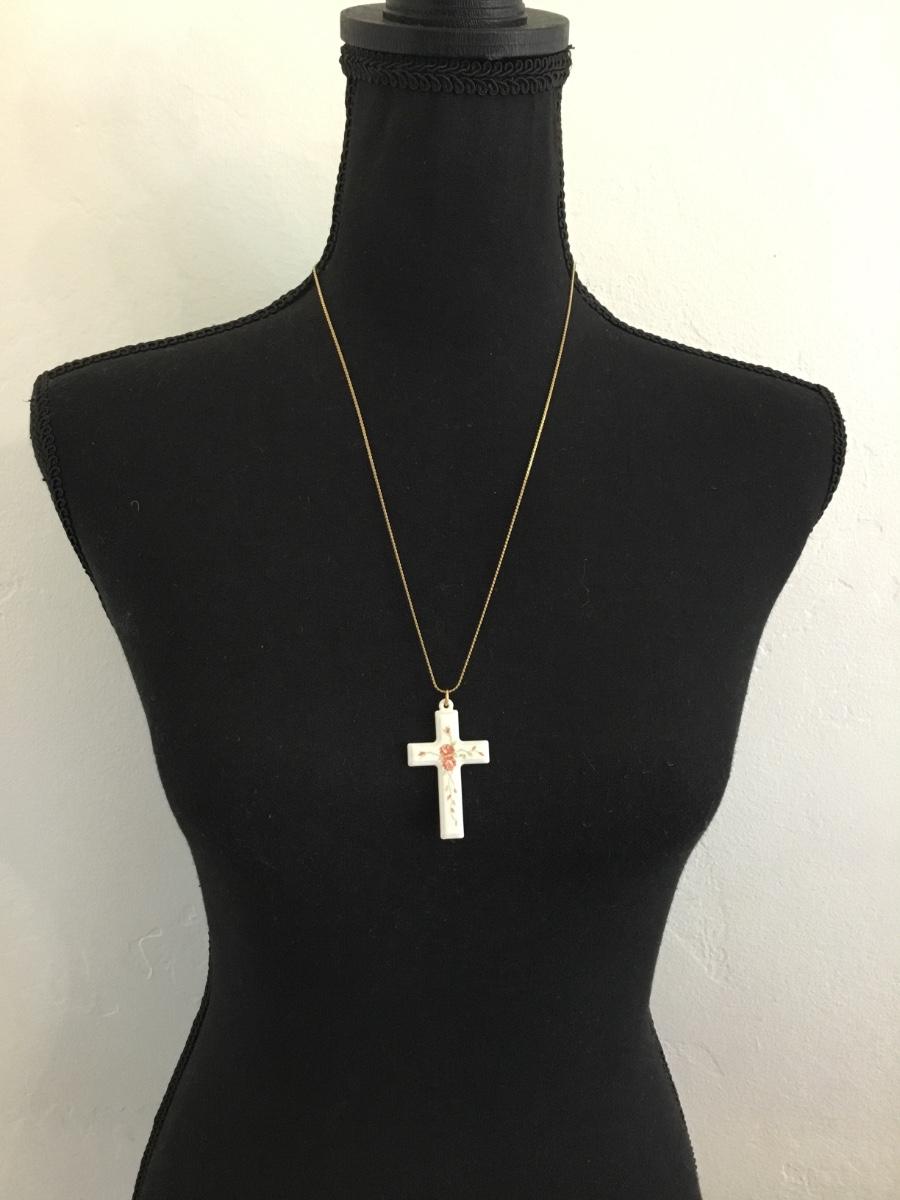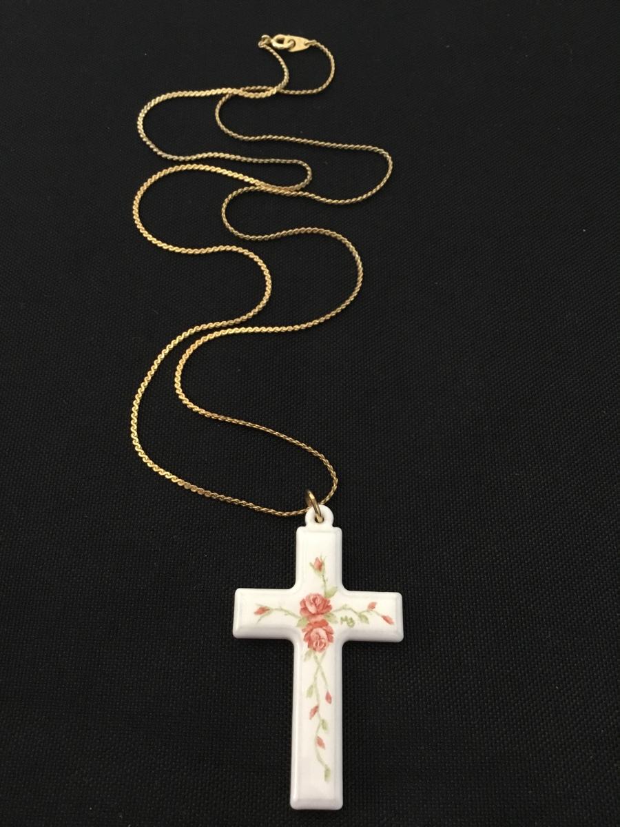Vintage porcelain rose, cross pendant & gold tone chain necklace