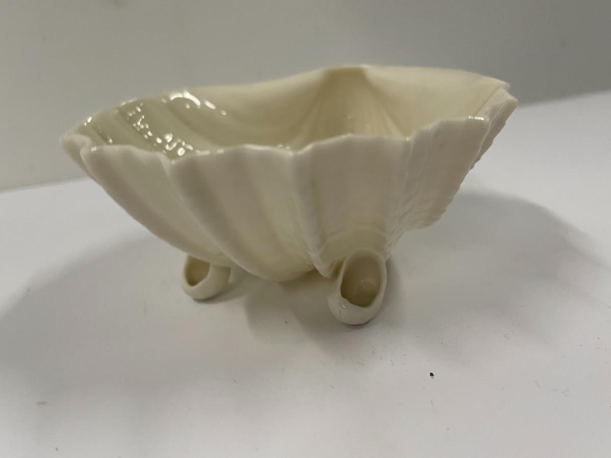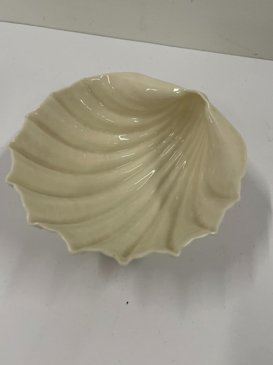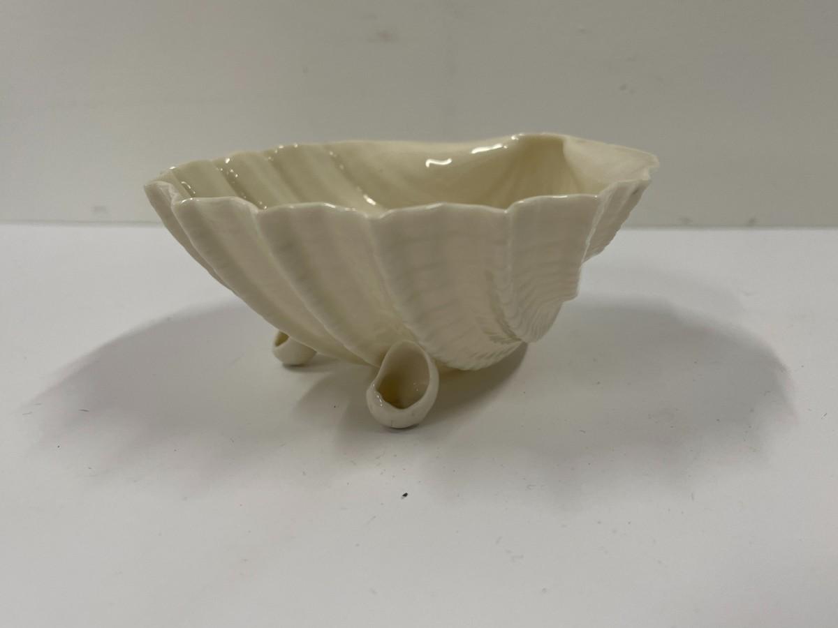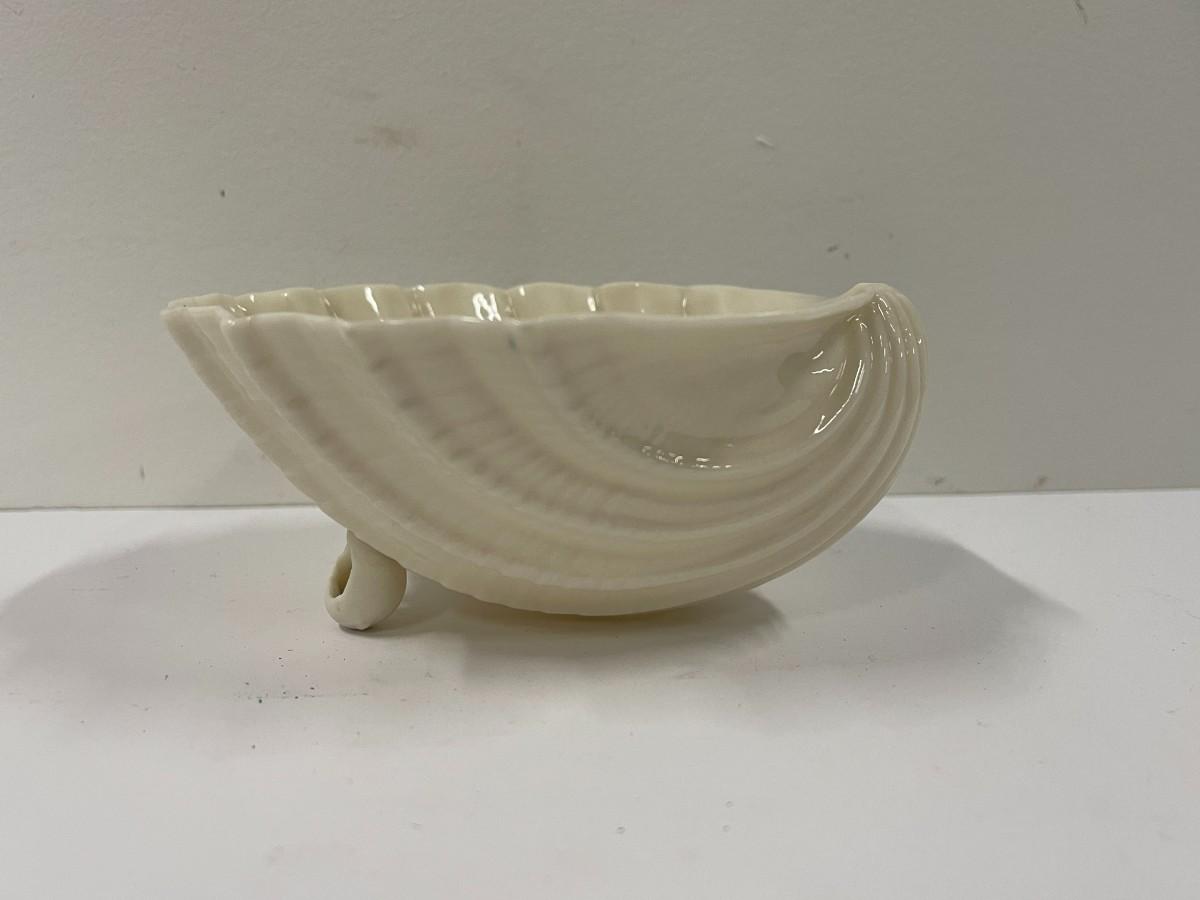Vintage porcelain shell bowl in the style of Belleek's Neptune bowl, but unmarked. Very good condition, please examine photos carefully. 5" x 5" x 2 1/2". # 981