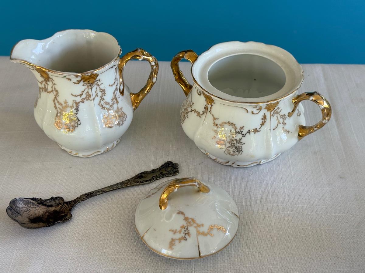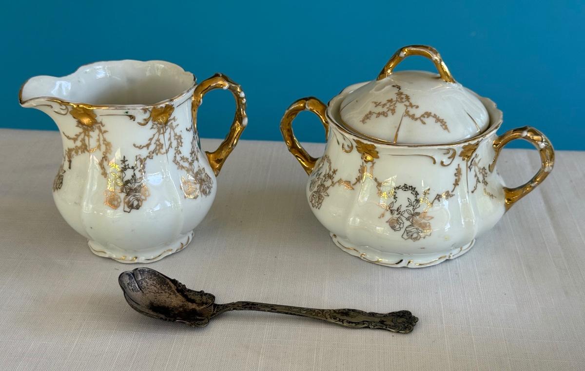 Vintage Porcelain Sugar/creamer w/gold like design, & WM Rogers Co AA spoon