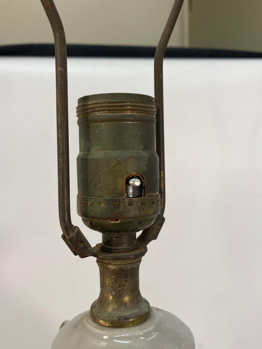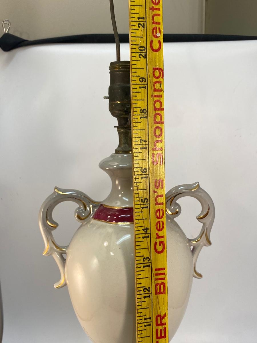 Vintage Porcelain Table Lamp Lovers Scene Double Handle Urn Style. In vintage condition. May have light crazing in spots. Needs the on/off knob replaced. Untested. Has a partial sticker on side.