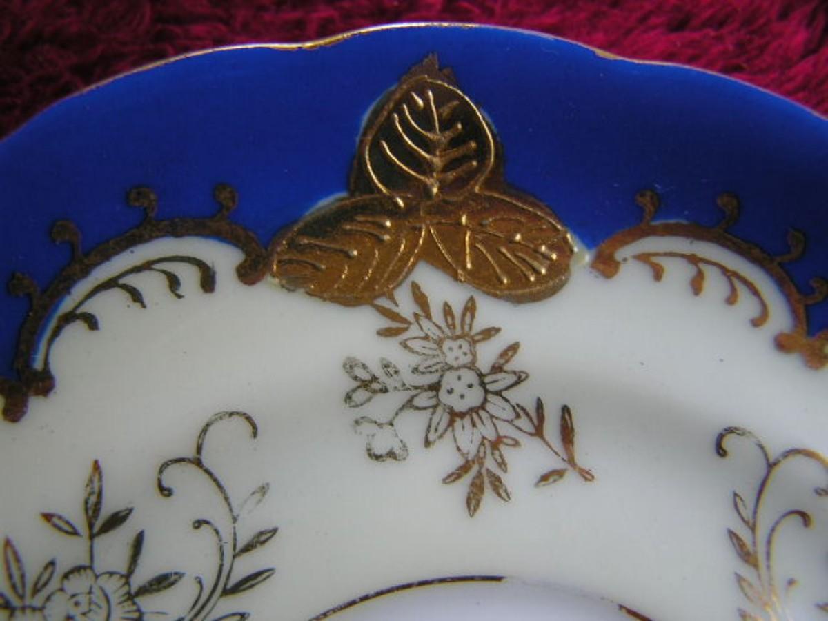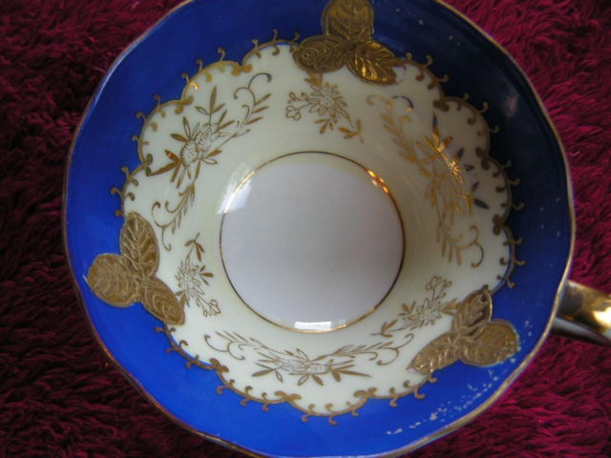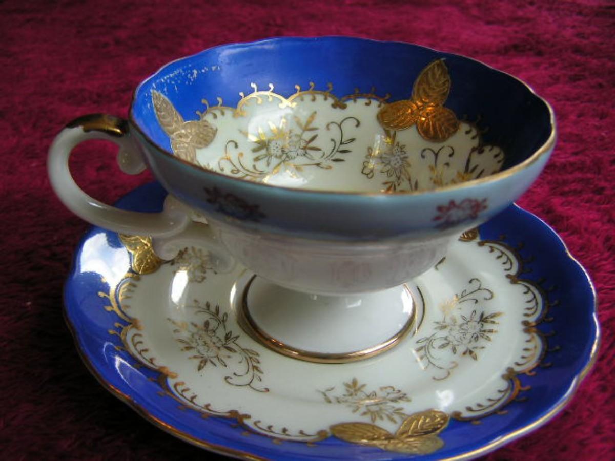 Vintage porcelain teacup & saucer set. Lovely blue & white with intricately detailed flora design in gold. Pedestal bases cup. Origins unknown