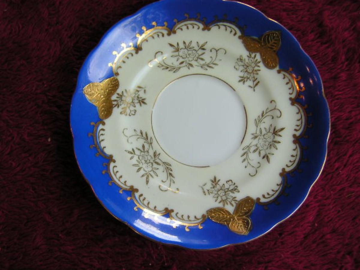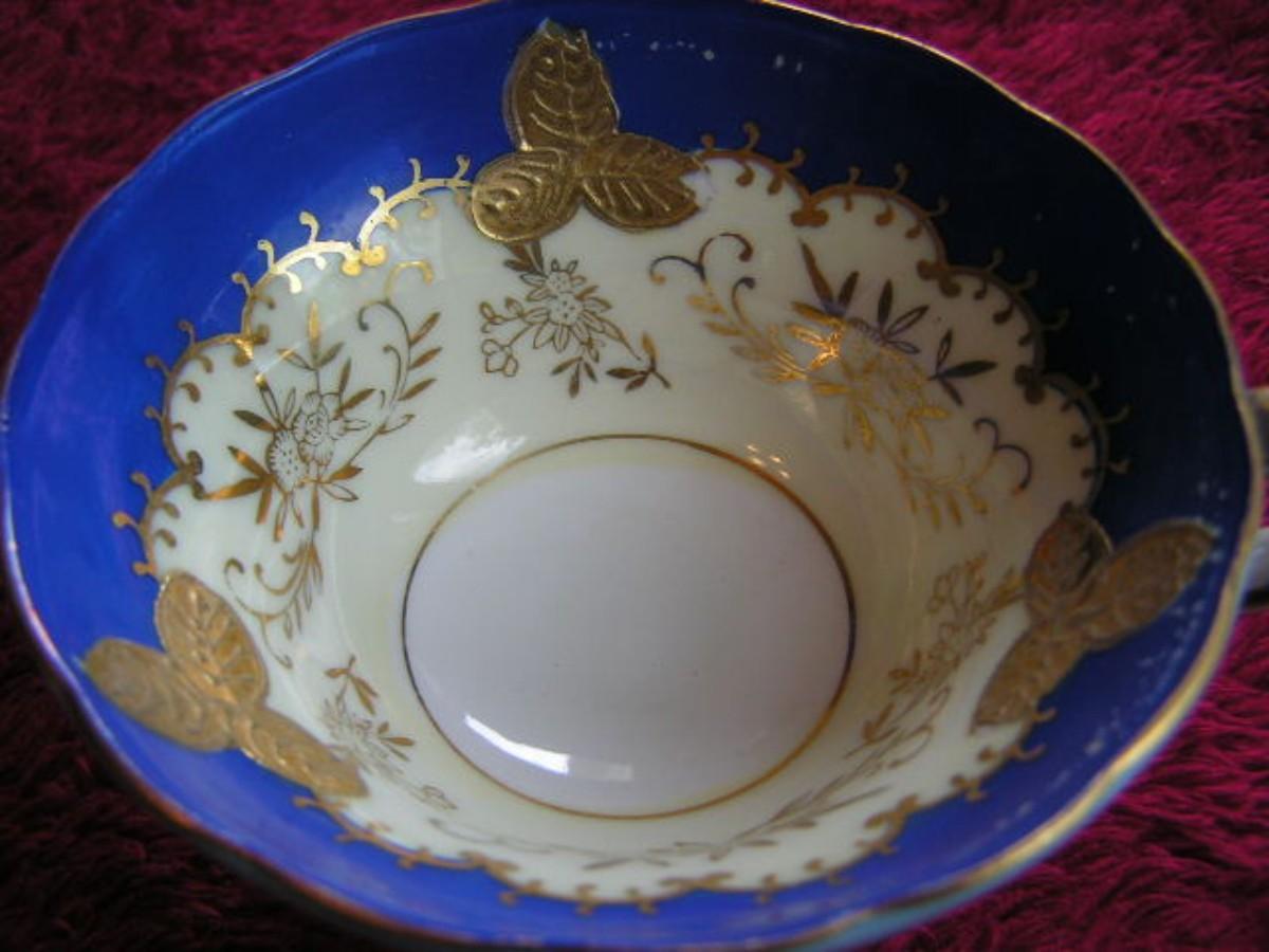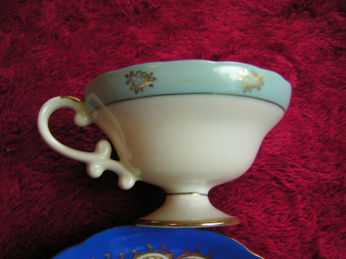 Vintage porcelain teacup & saucer set. Lovely blue & white with intricately detailed flora design in gold. Pedestal bases cup. Origins unknown