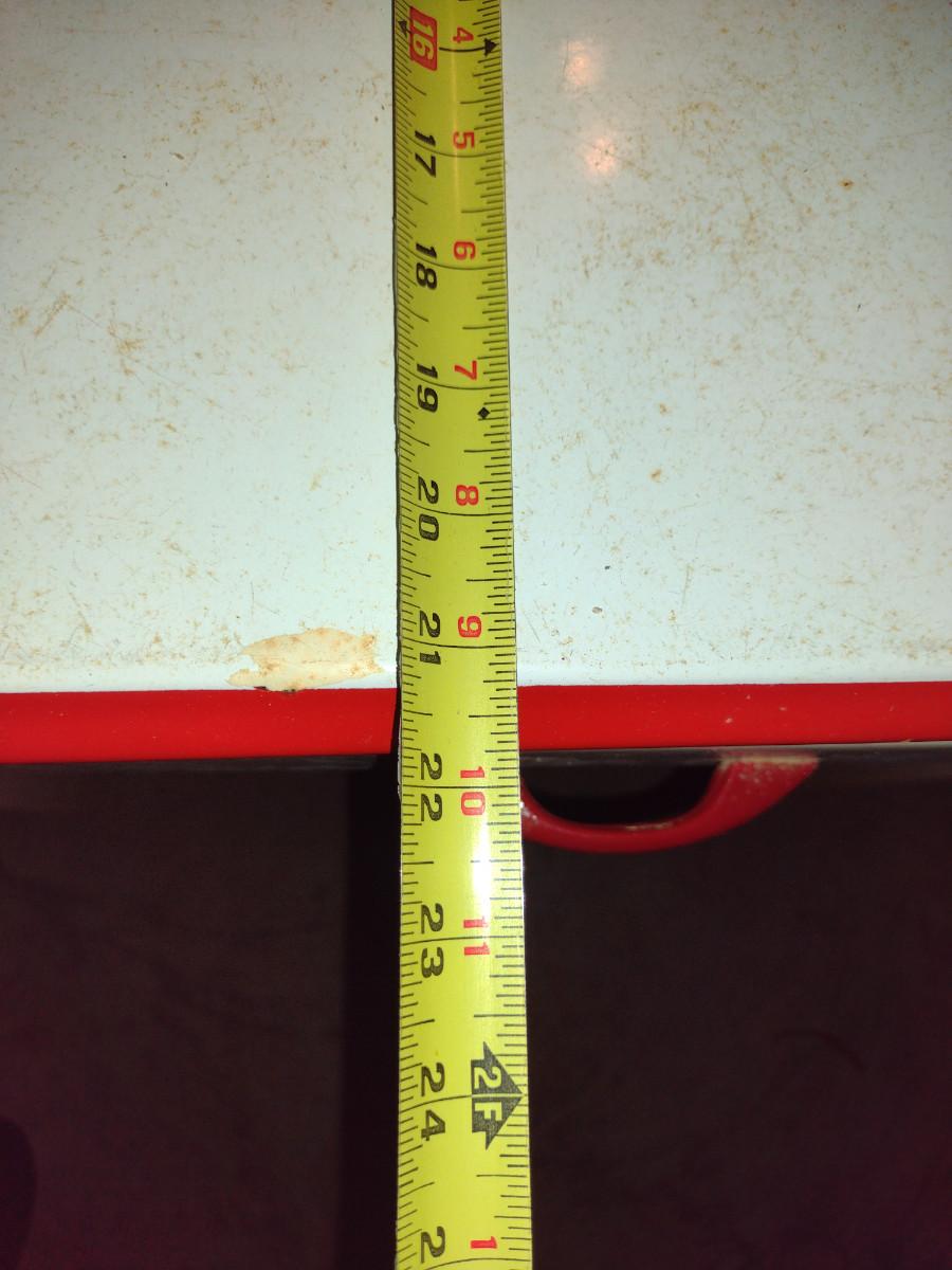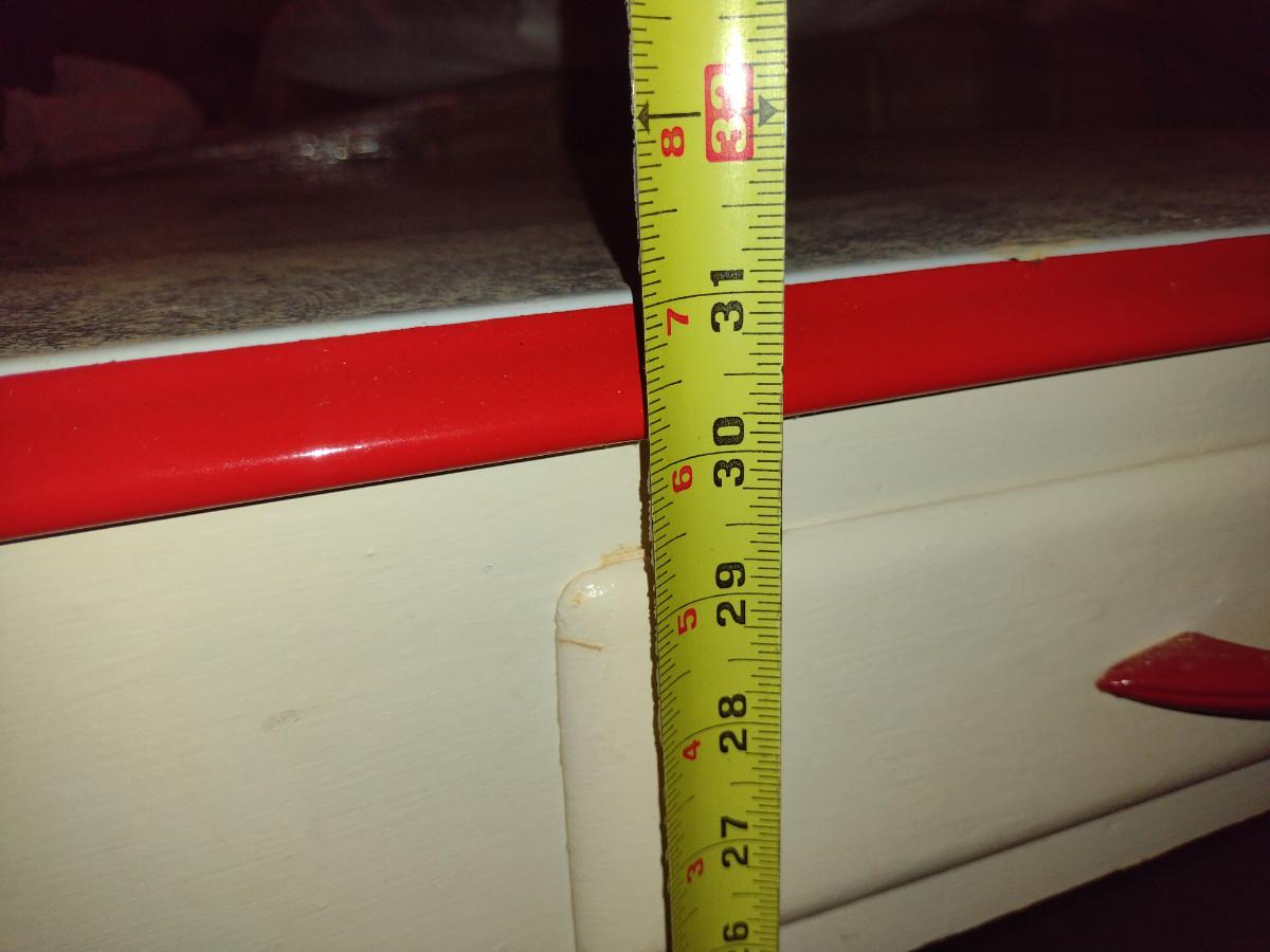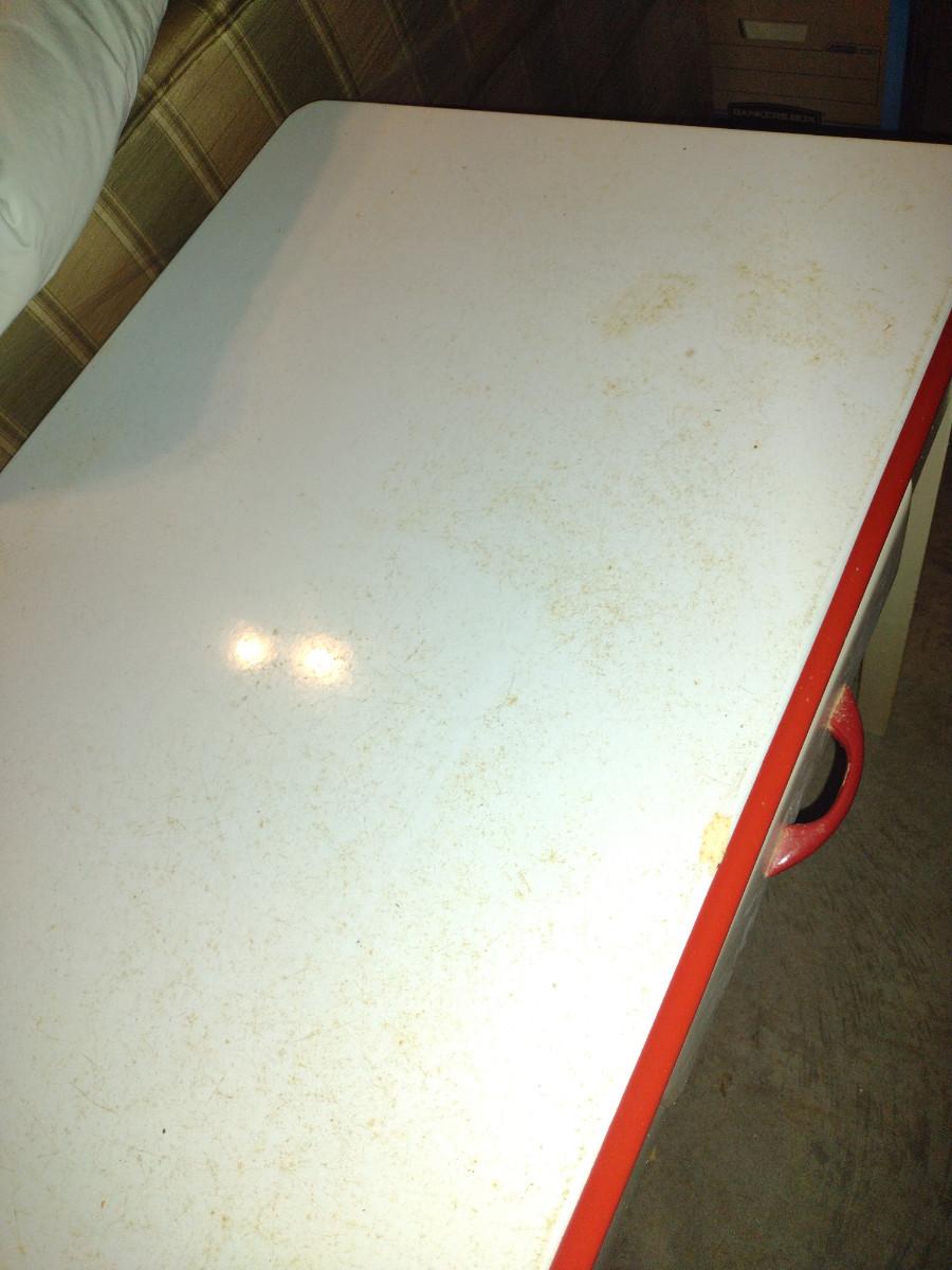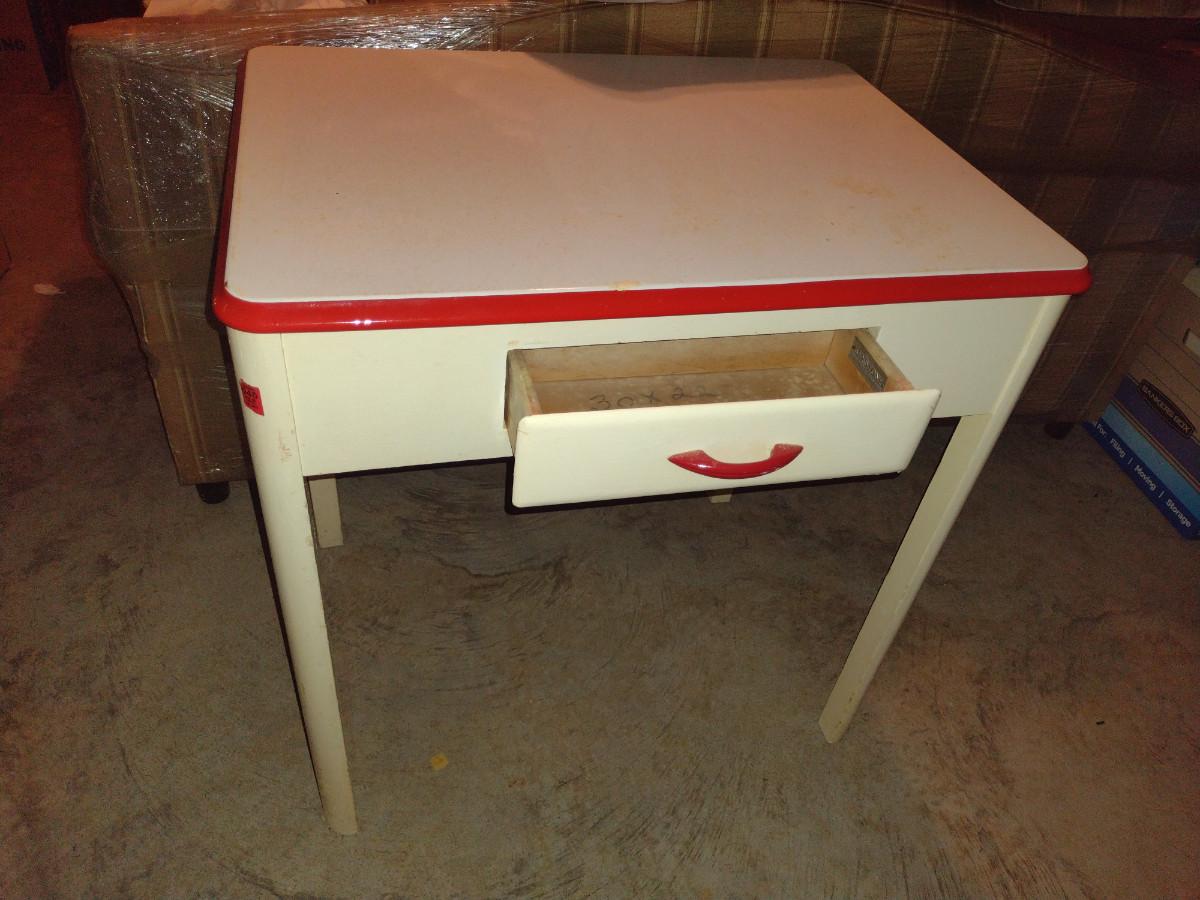Vintage Porcelain Top Work Table with Drawer- Approx 30" x 21 3/4" x 31" Tall. Item has discoloration to finish- please see all pictures. Item is located downstairs and must be carried up a flight of steps for removal. Please bring help for removal.