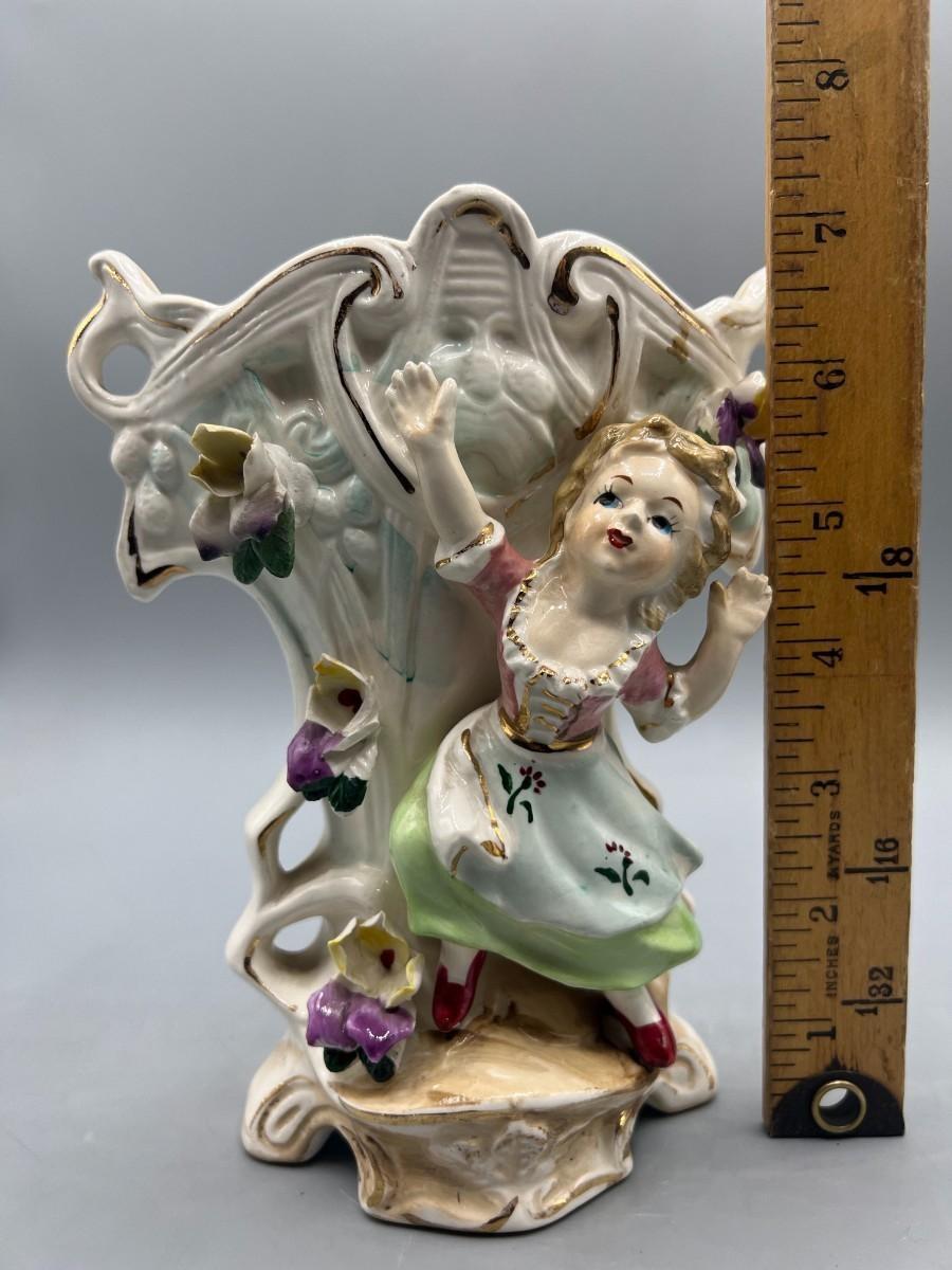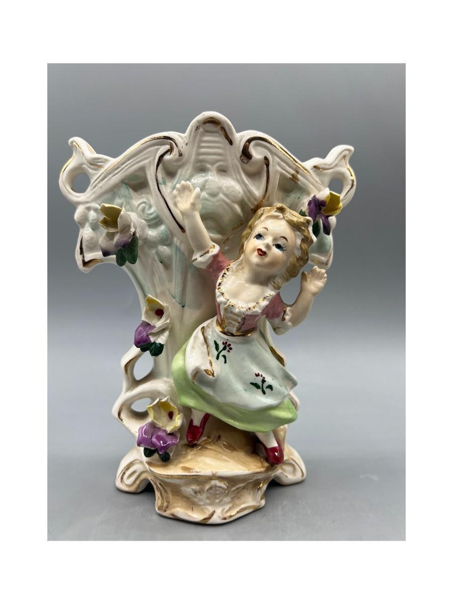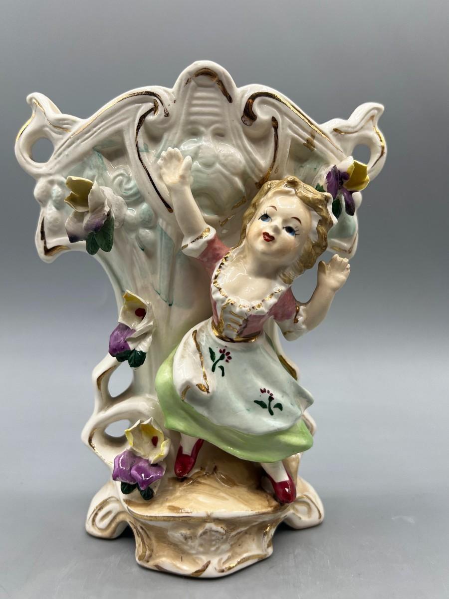 Vintage Porcelain Woman Figurine Vase. In fair condition. Does have some chipped flowers. Unmarked.