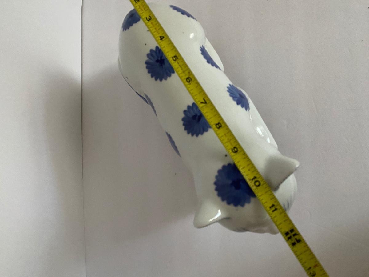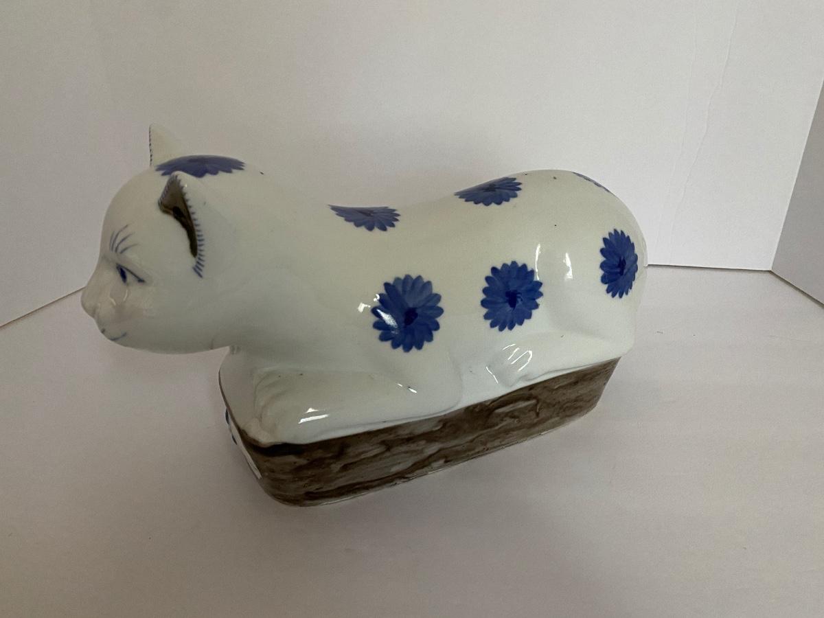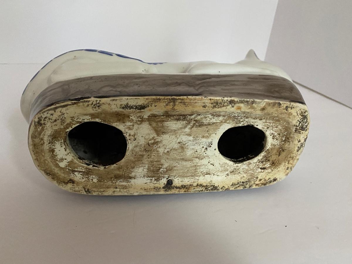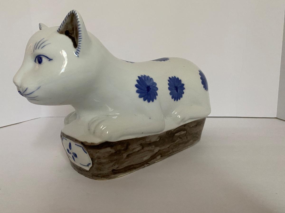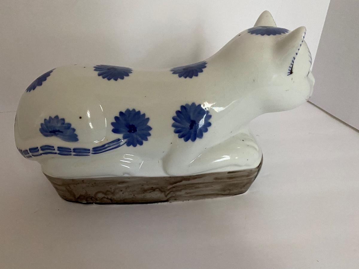 Chinese Blue and White Porcelain Recumbent Cat Pillow Statue 11 3/4 In. Long