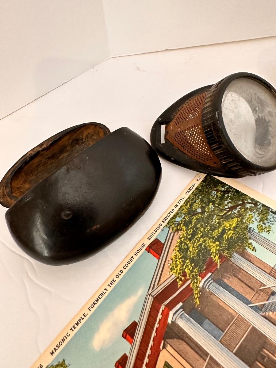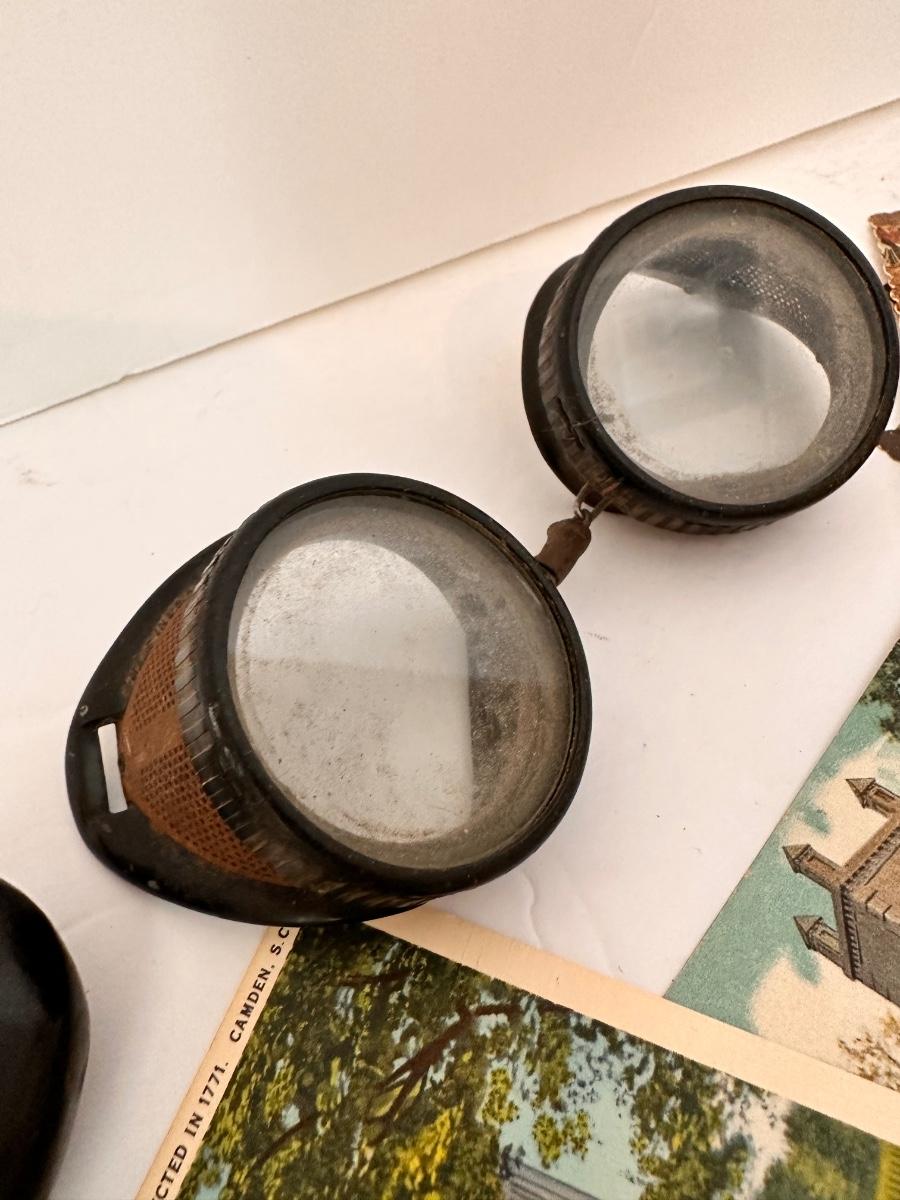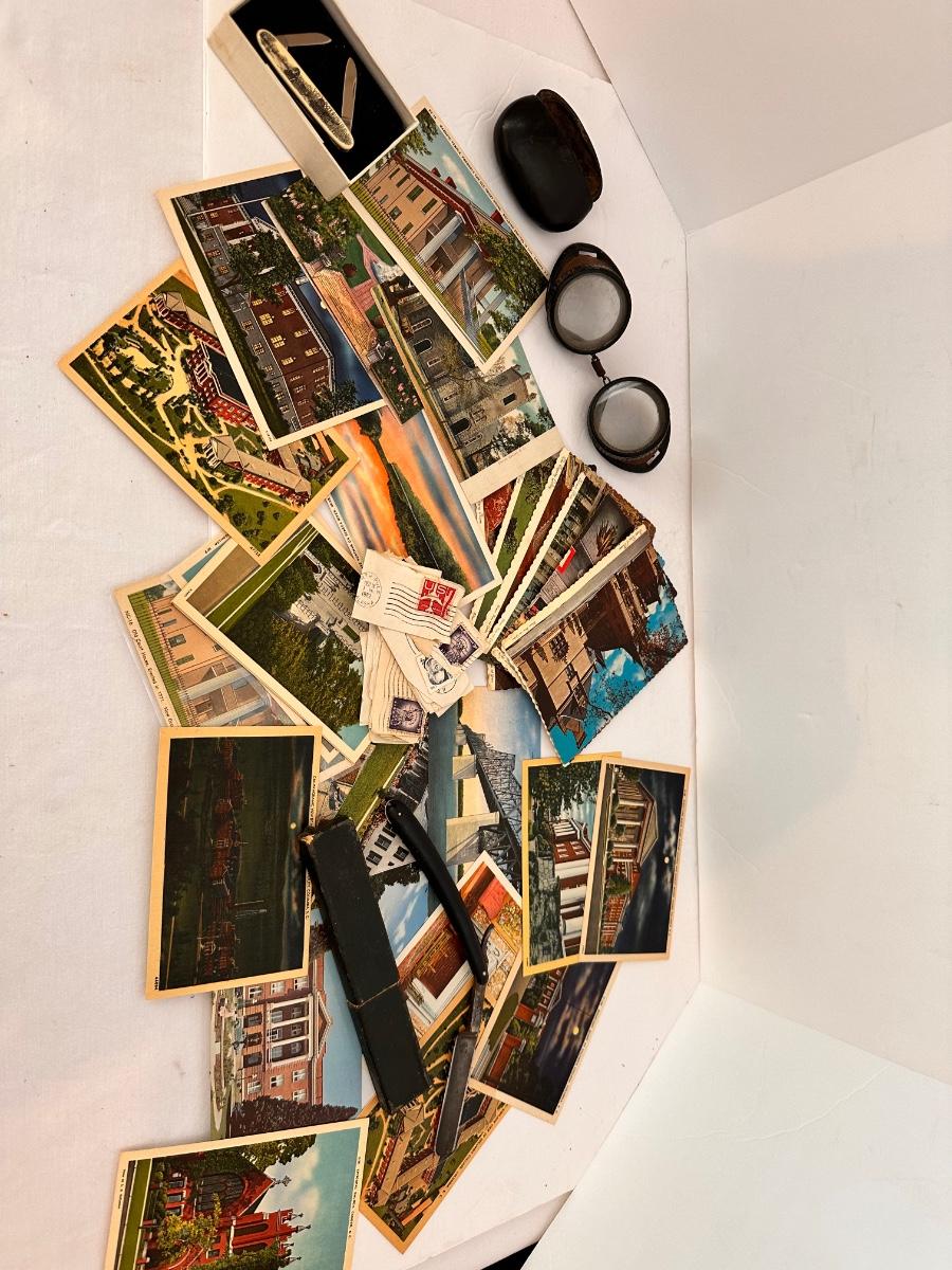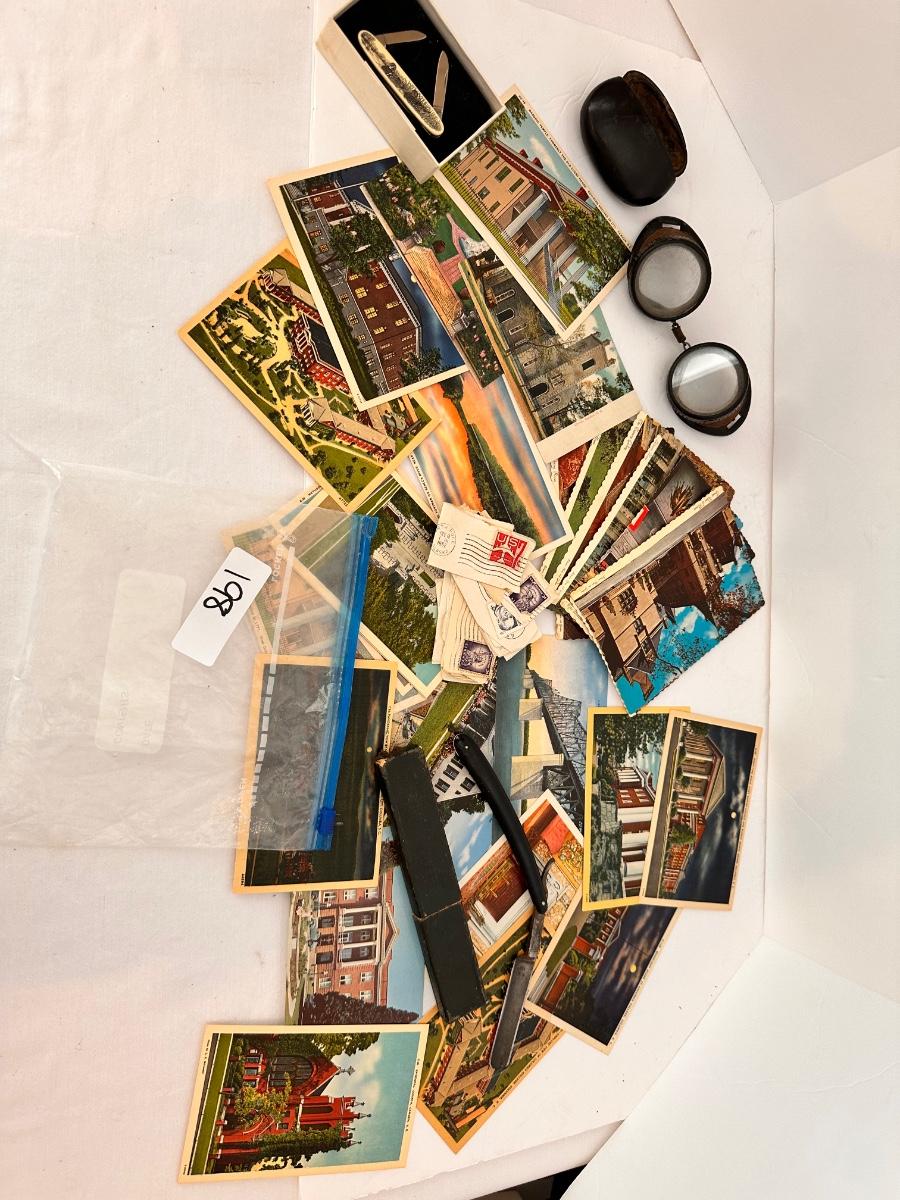 VINTAGE POST CARD, BARLOW USA POCKET KNIFE, RAZOR, AND STAMP LOT, GOGGLES, COIN PURSE AS PICTURED