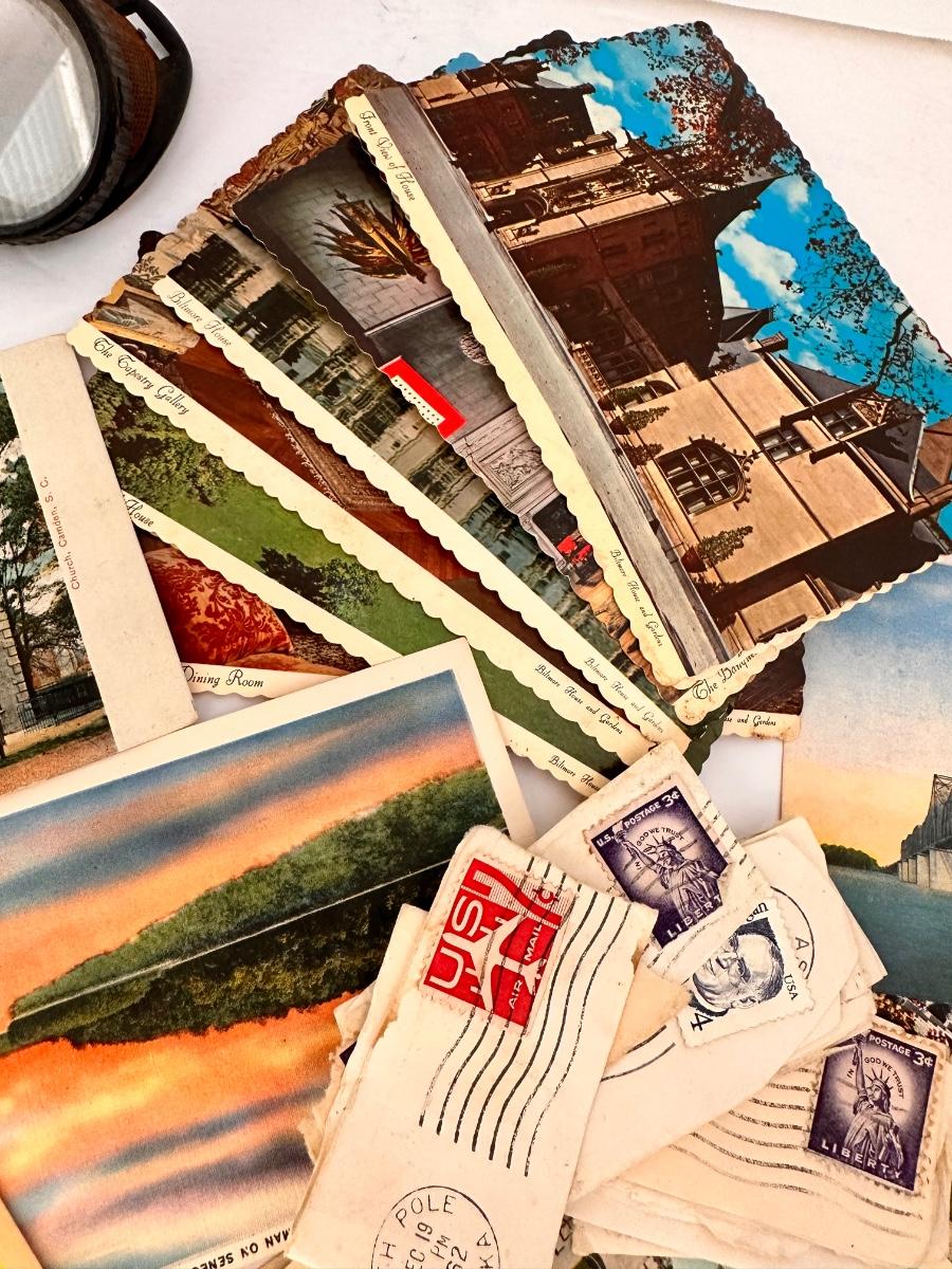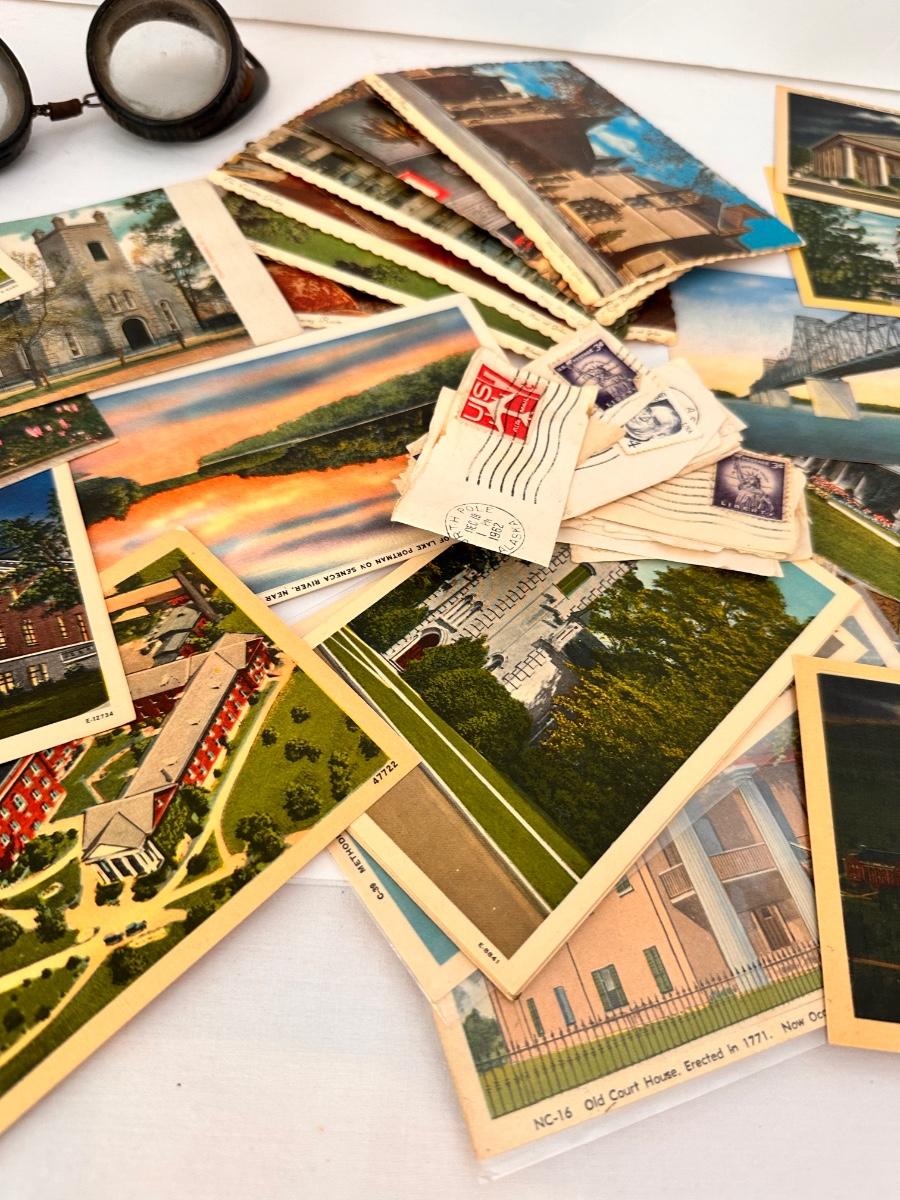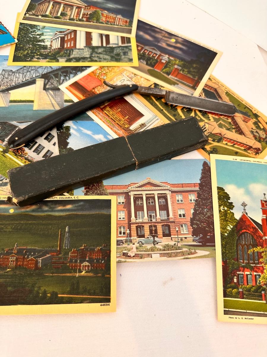VINTAGE POST CARD, POCKET KNIFE, RAZOR, AND STAMP LOT