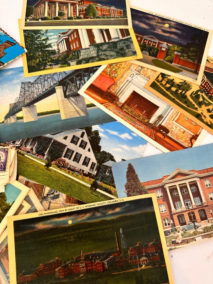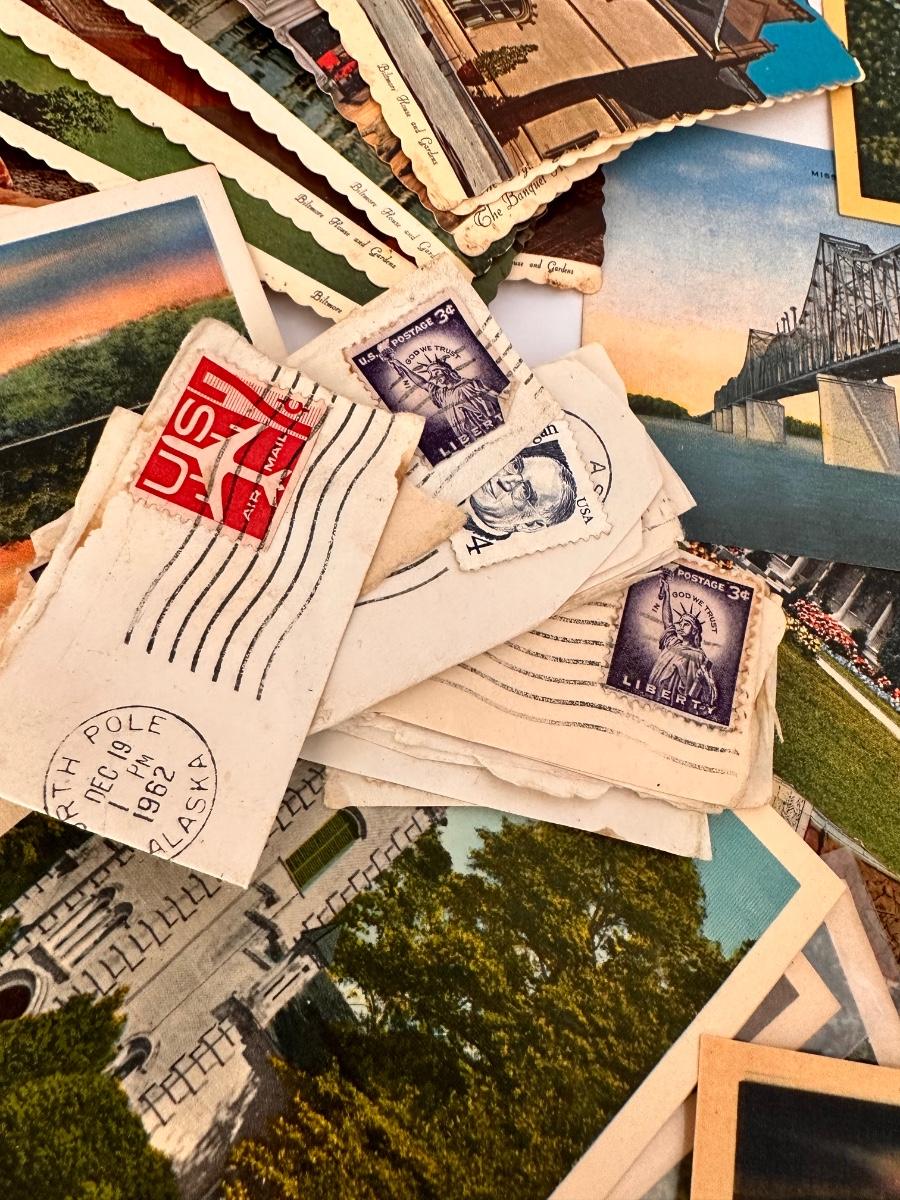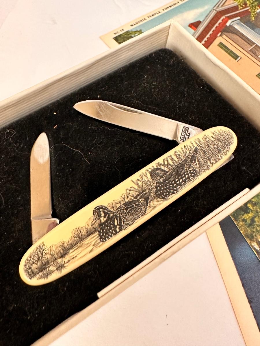 VINTAGE POST CARD, POCKET KNIFE, RAZOR, AND STAMP LOT