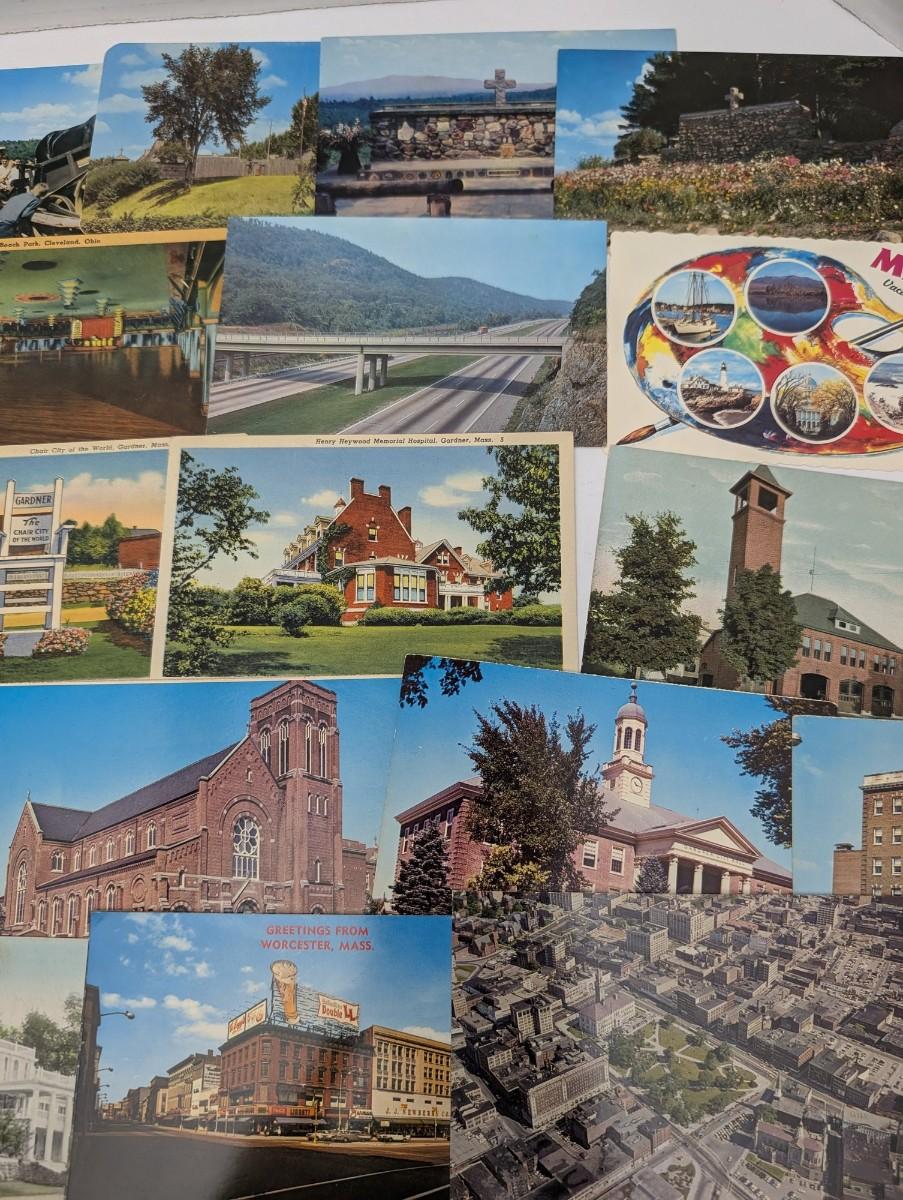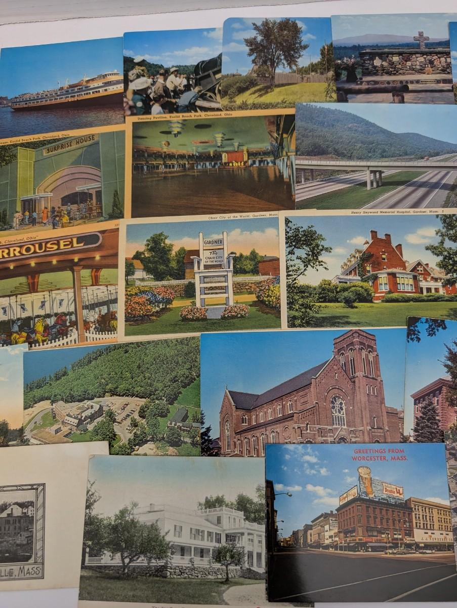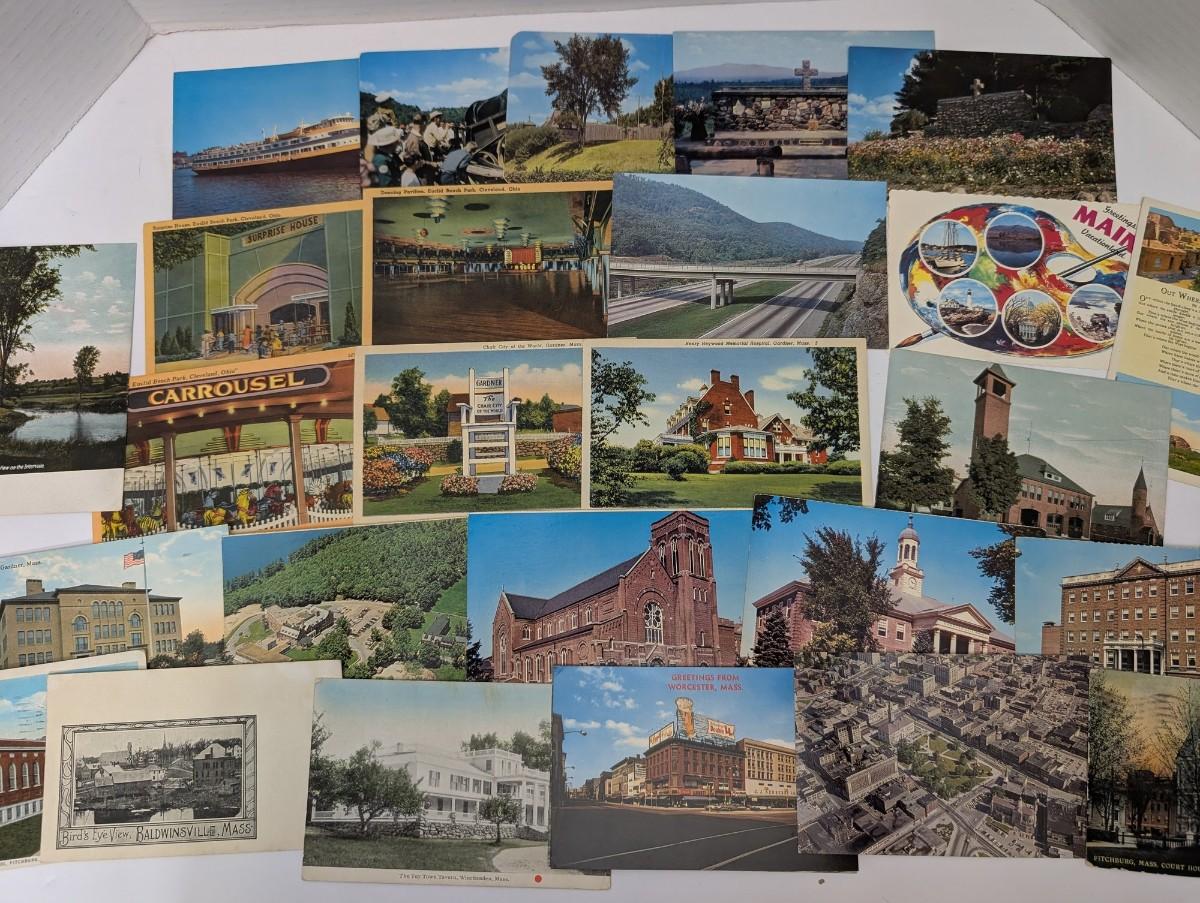 Large mixed lot of over 25 vintage postcards featuring assorted US locations including Massachusetts, Ohio, Maine, and more. Subjects include town views, churches, amusement park scenes, roadside attractions, and scenic landscapes. Nice variety for collectors, ephemera enthusiasts, or nostalgic display.