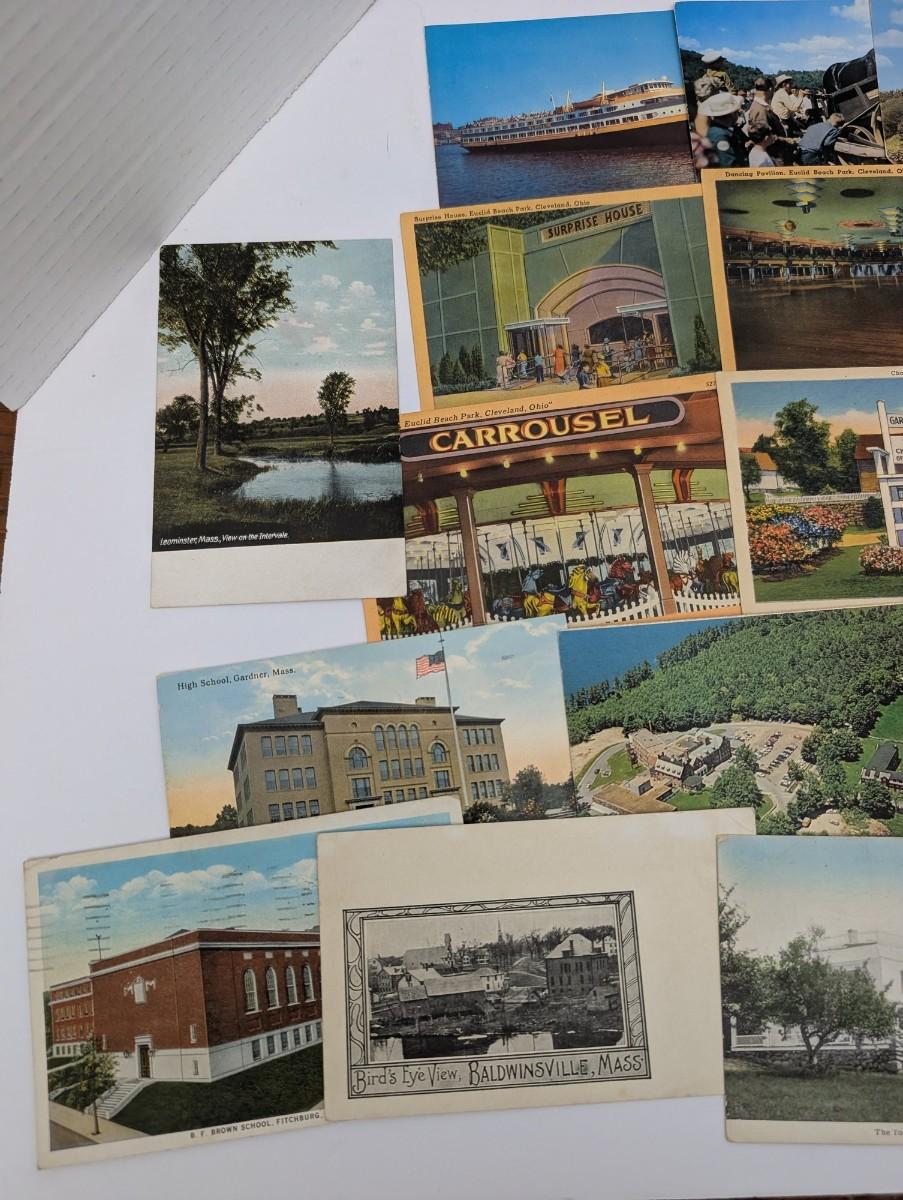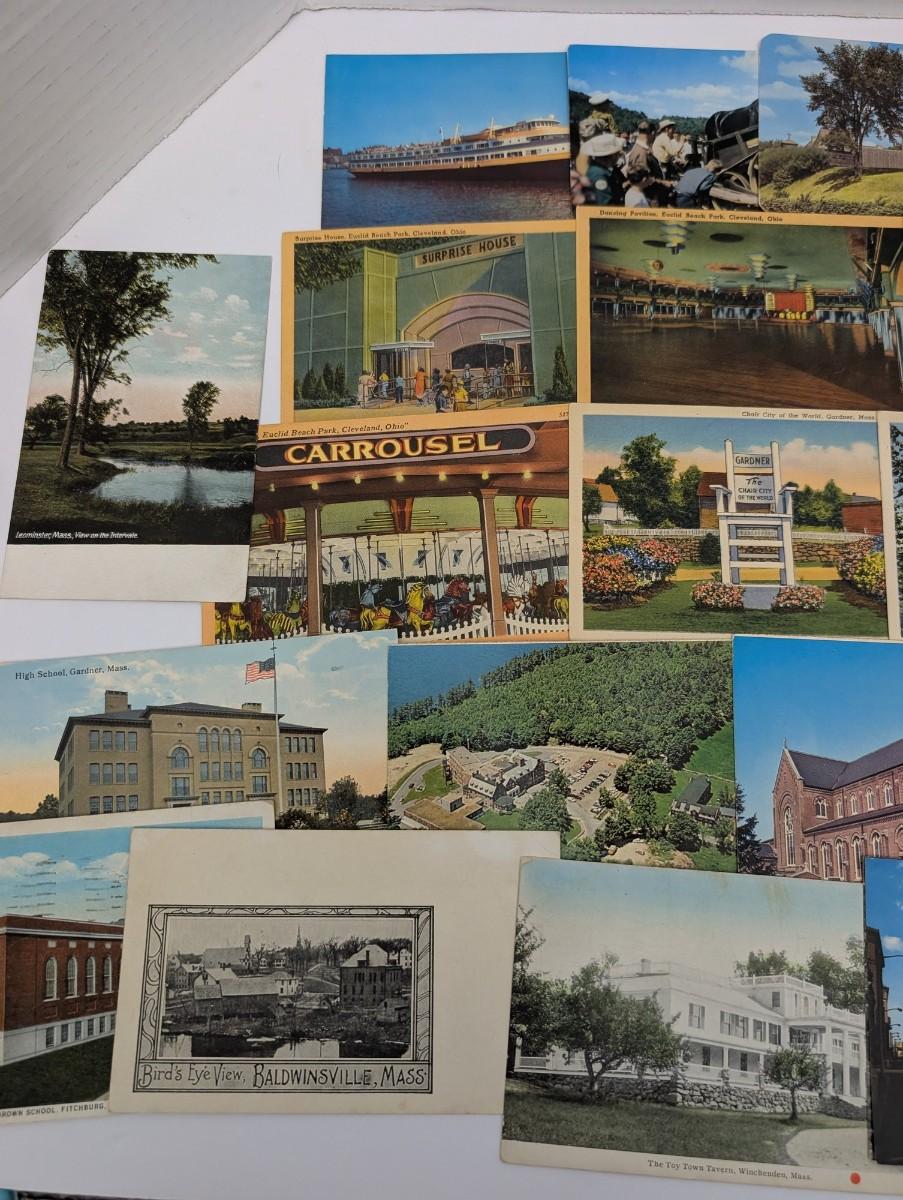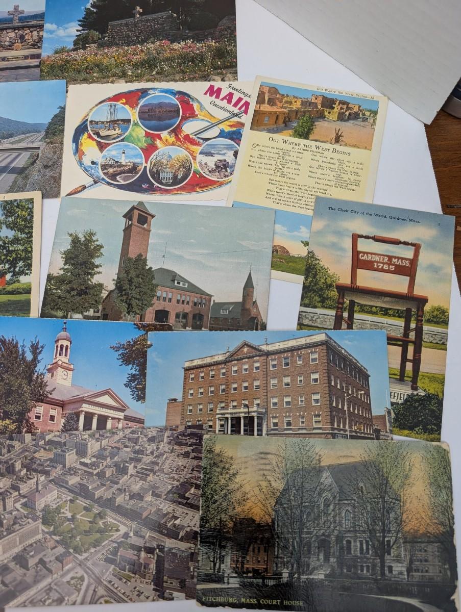 Large mixed lot of over 25 vintage postcards featuring assorted US locations including Massachusetts, Ohio, Maine, and more. Subjects include town views, churches, amusement park scenes, roadside attractions, and scenic landscapes. Nice variety for collectors, ephemera enthusiasts, or nostalgic display.