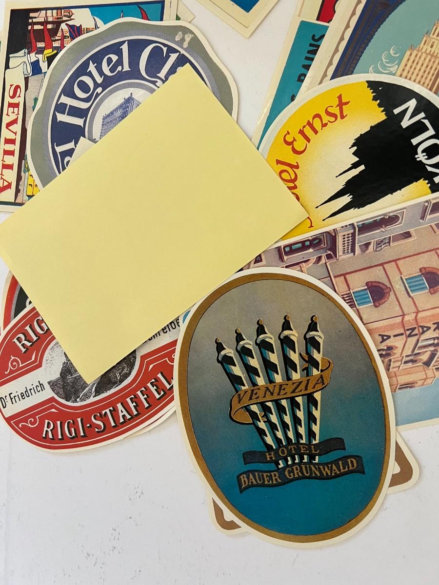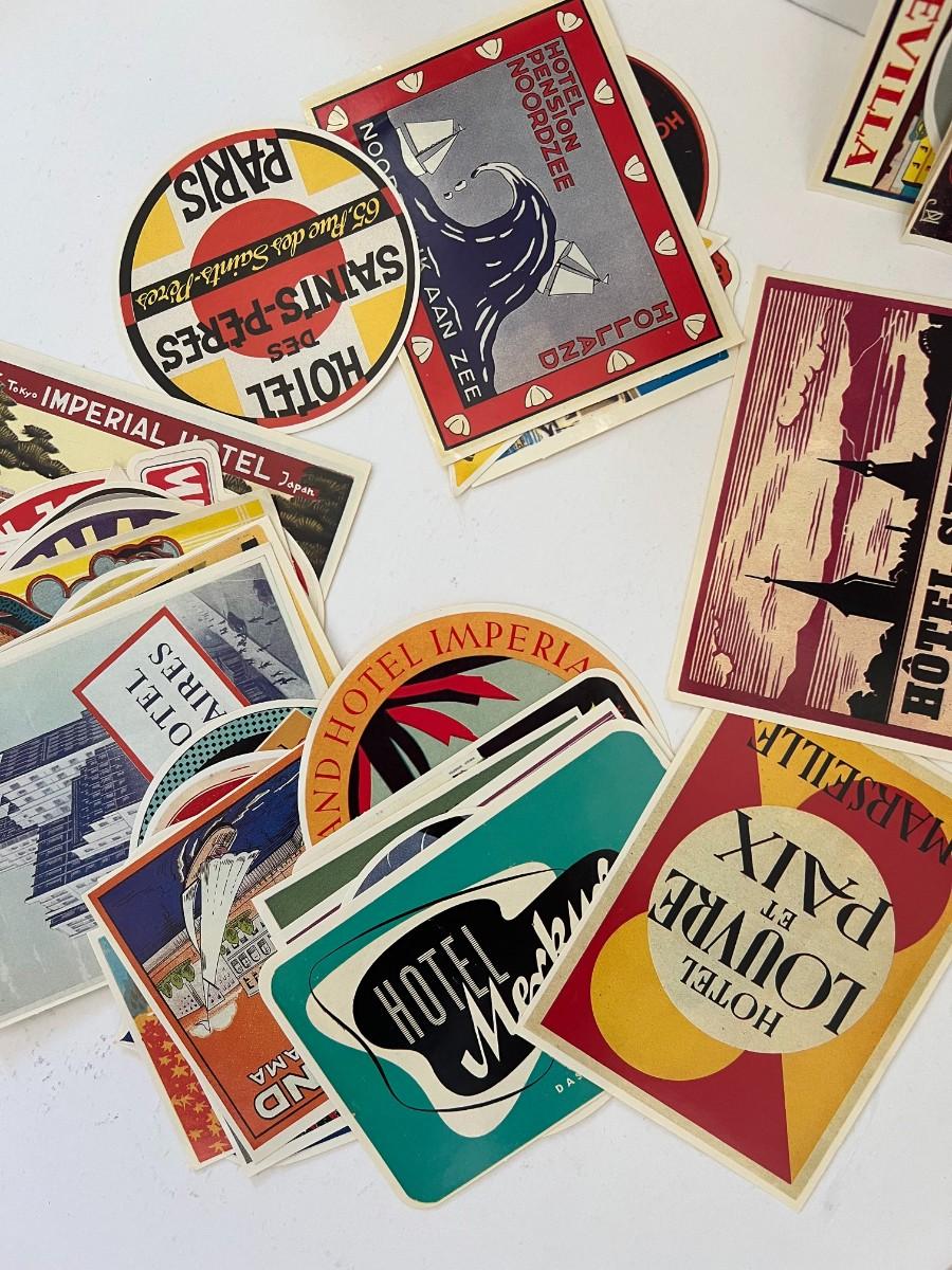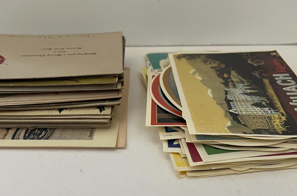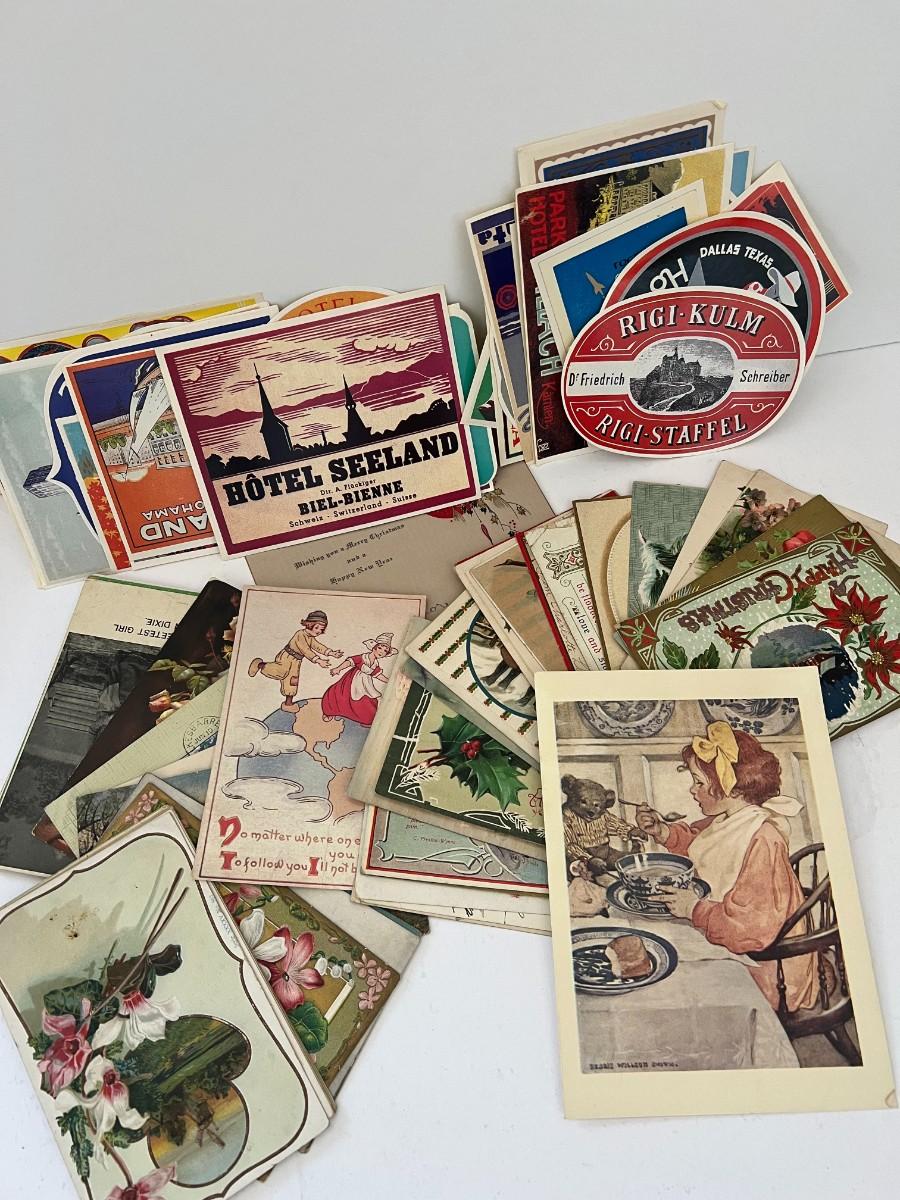 Stack of vintage circulated post cards with various seasons that include all occasion and holiday. Additionally, a stack of advertising peel-off stickers from world wide locations and hotels.