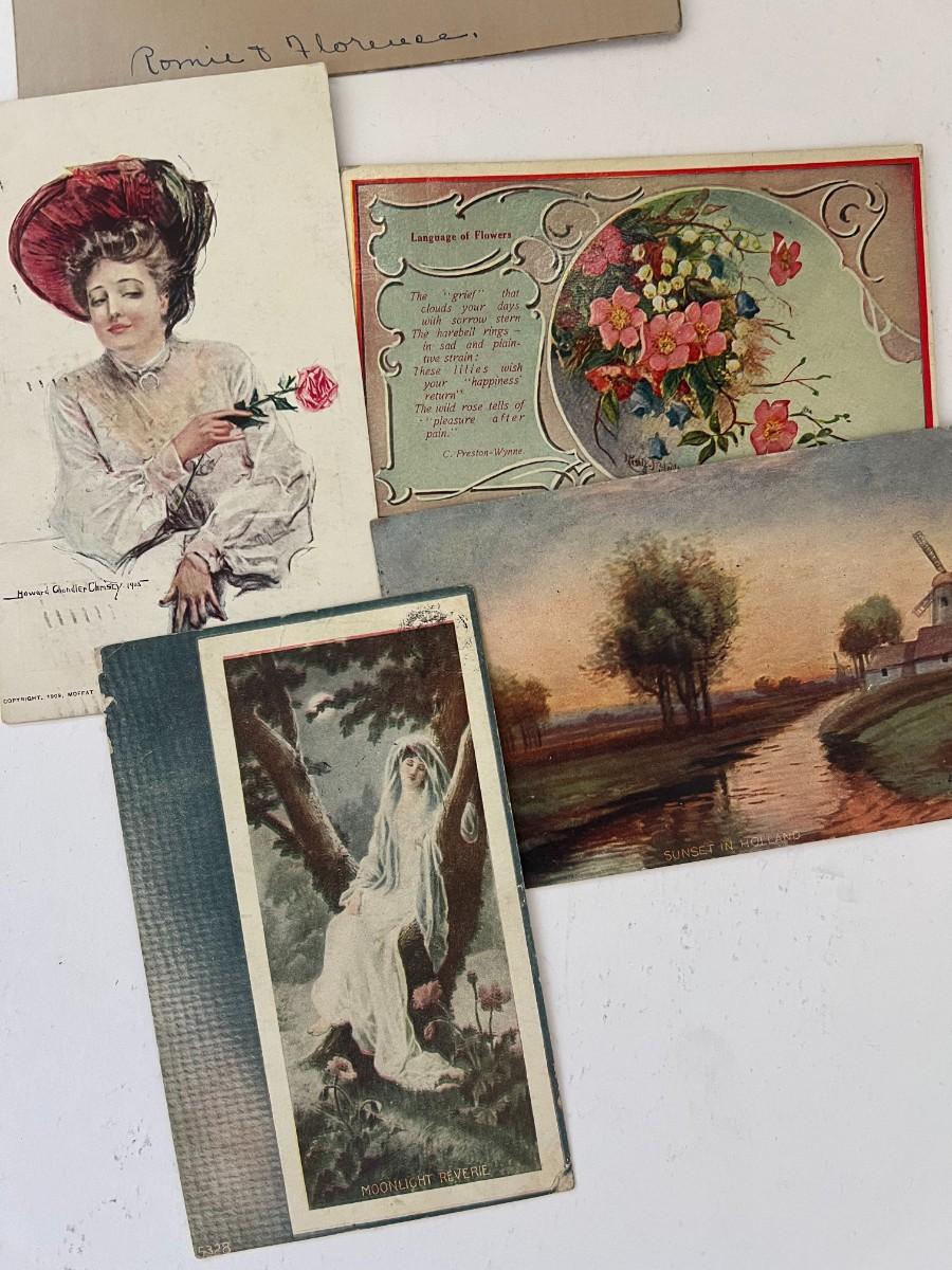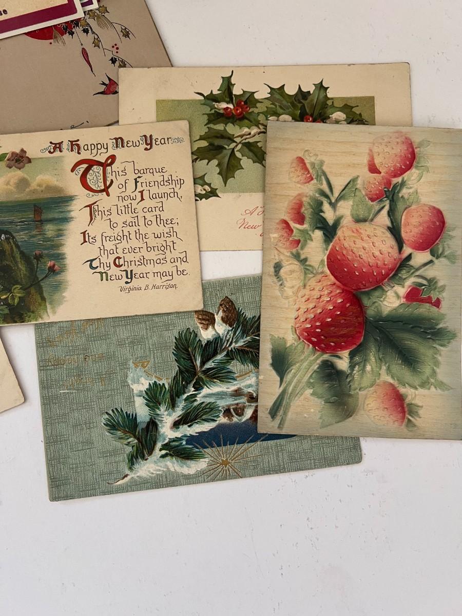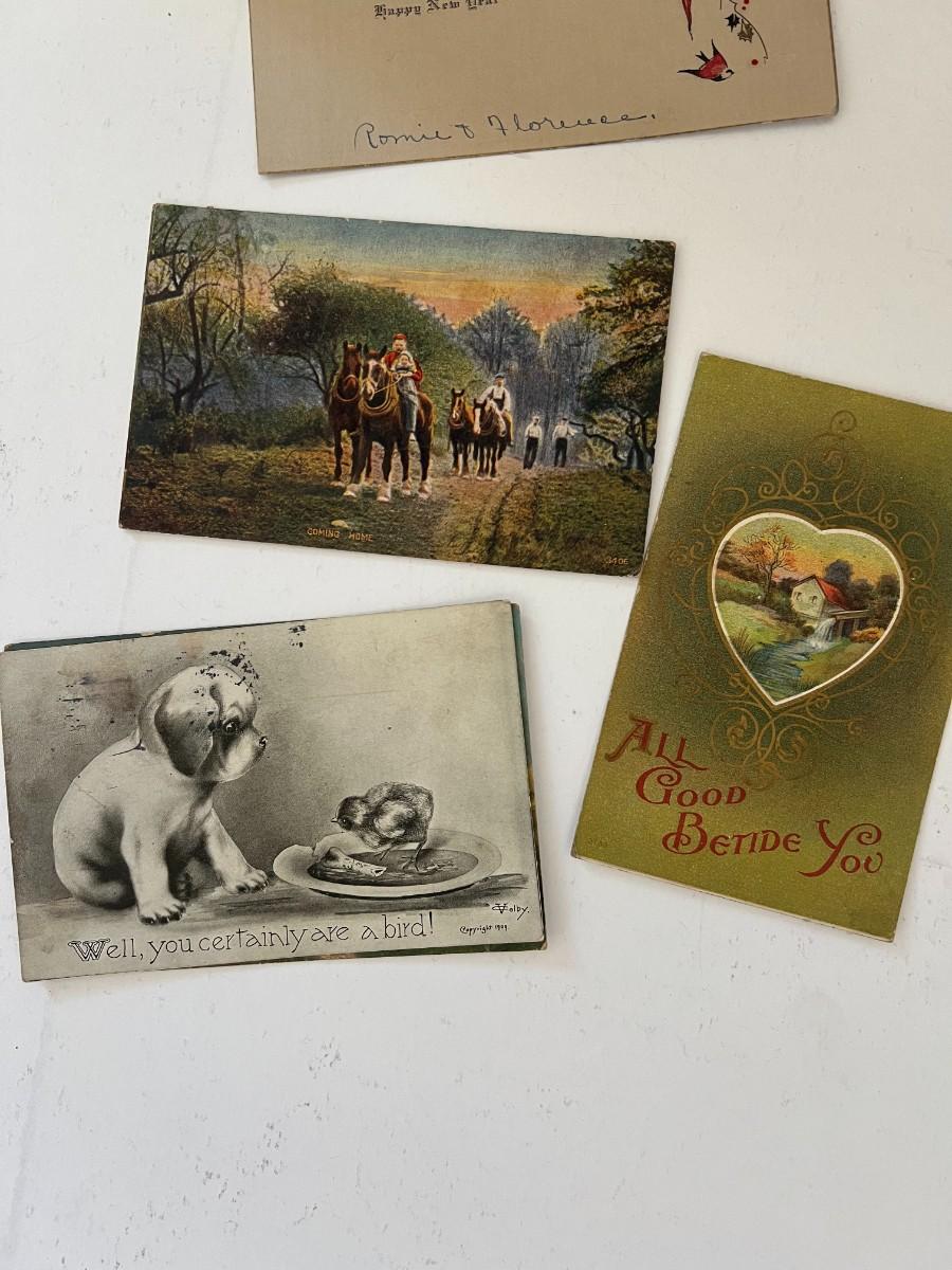Stack of vintage circulated post cards with various seasons that include all occasion and holiday. Additionally, a stack of advertising peel-off stickers from world wide locations and hotels.