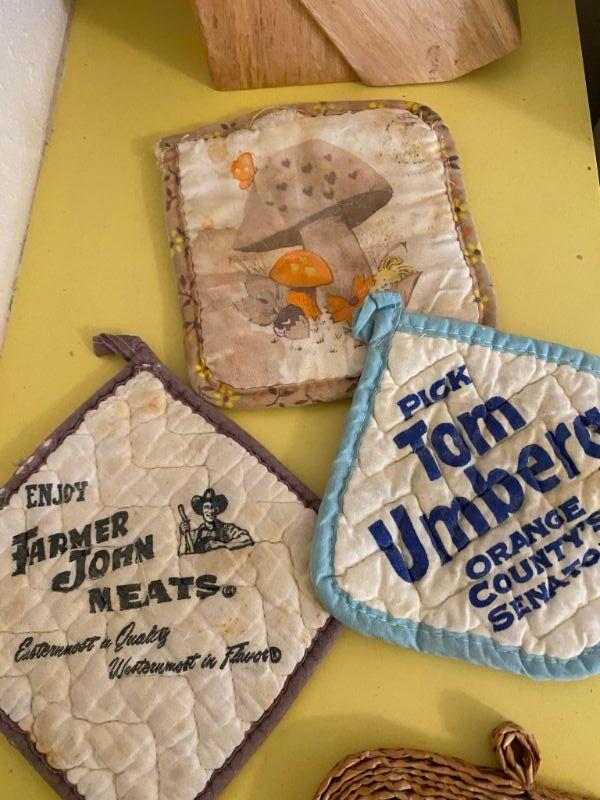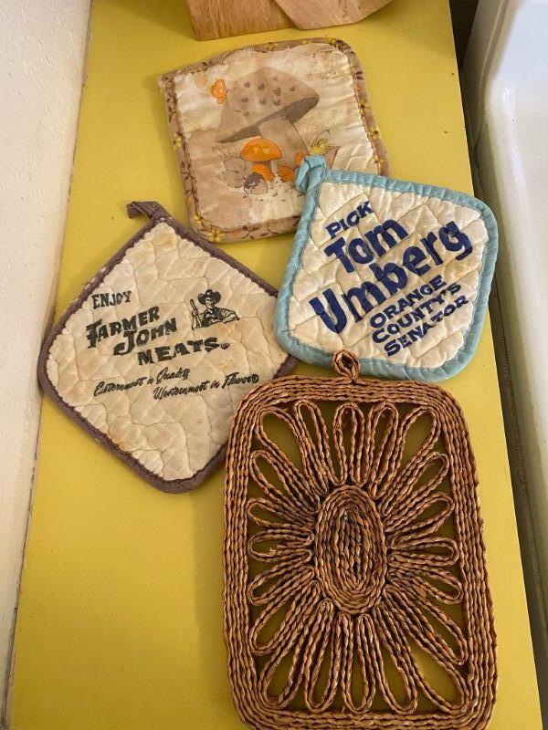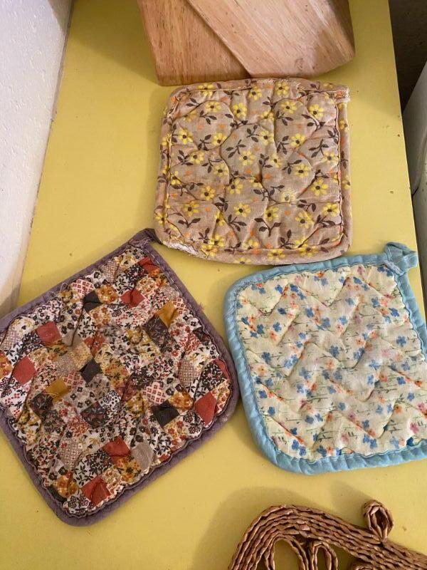 Set of 4 pot holder trivets. The 3 fabric ones are in used vintage conditions, need to be cleaned, but the patterns are cute. Wood trivet is in good shape.