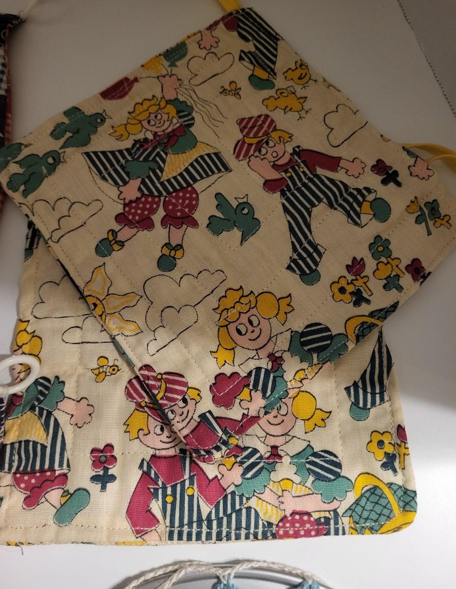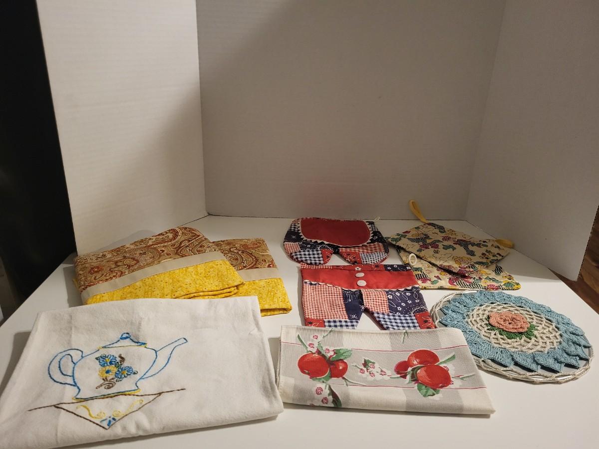VINTAGE POT HOLDERS, TEA TOWELS AND PILLOW CASES