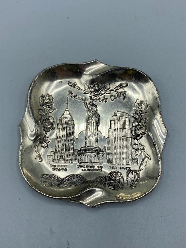 Vintage New YOrk City souvenir trinket dish. Believe it is silver painted pot metal. Easily bendable. About 4" wide. Does have signs of age and wear.